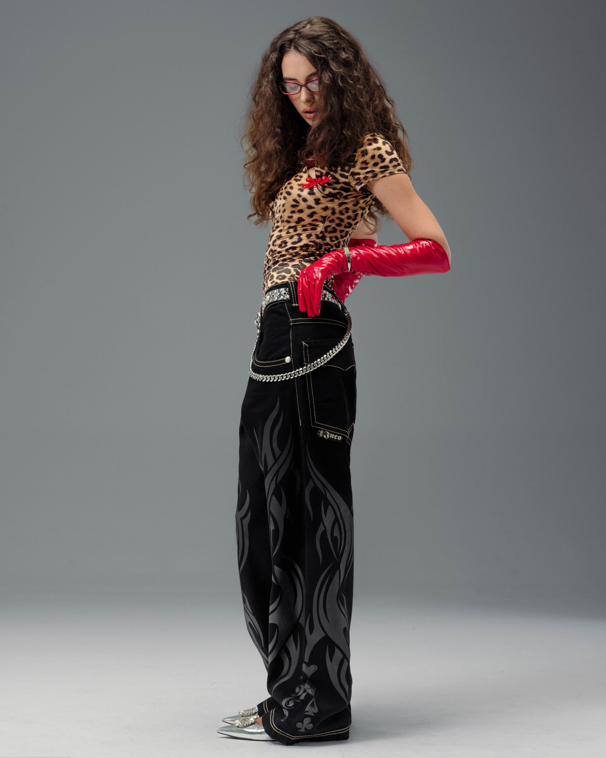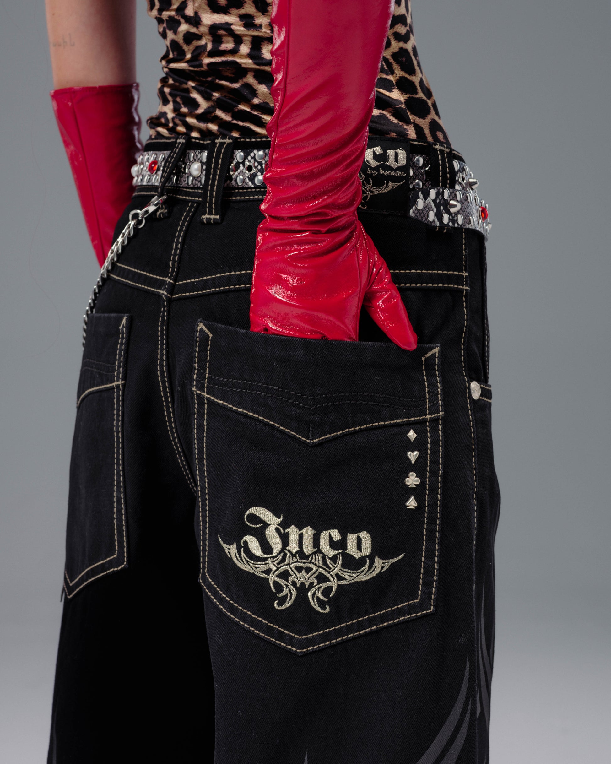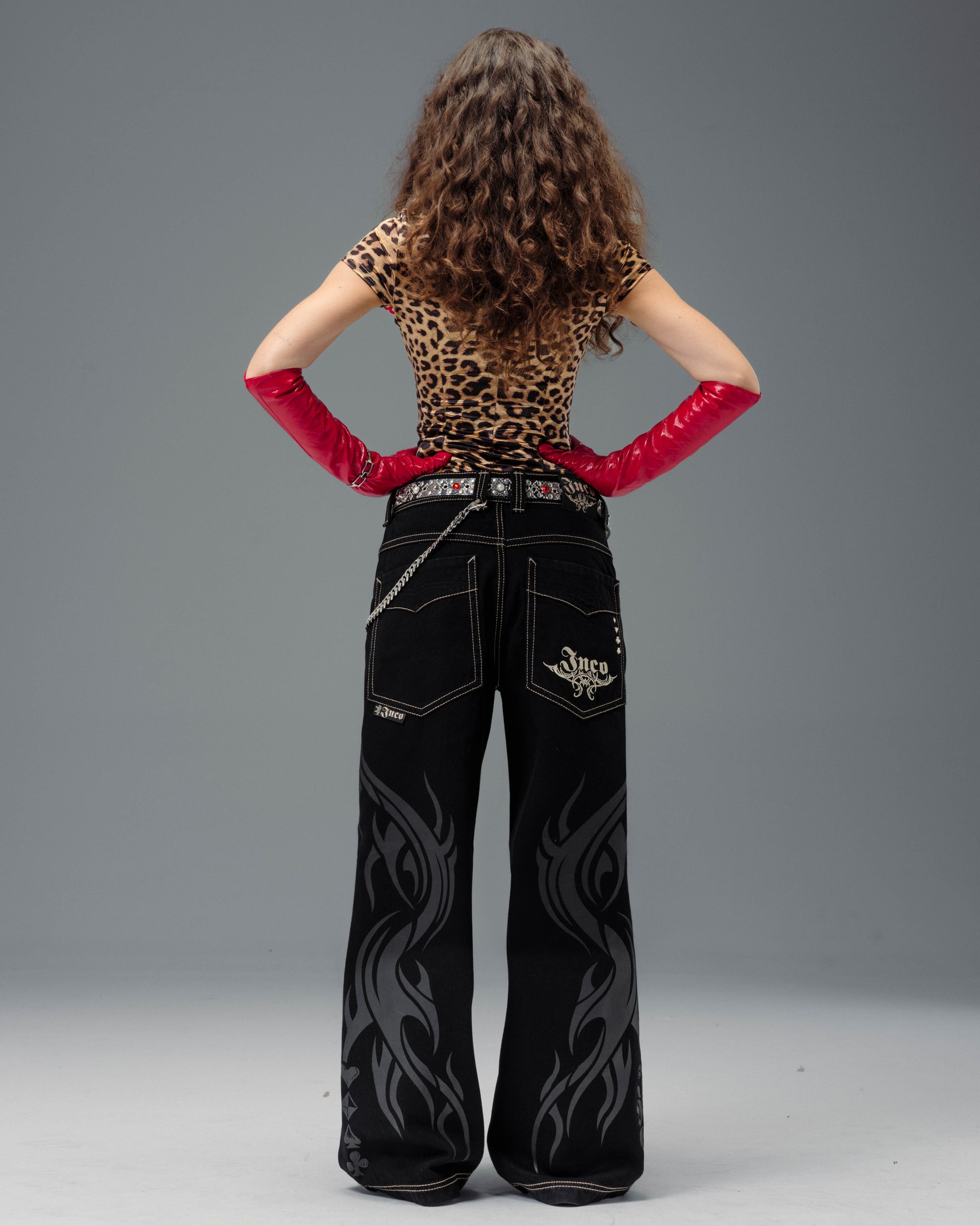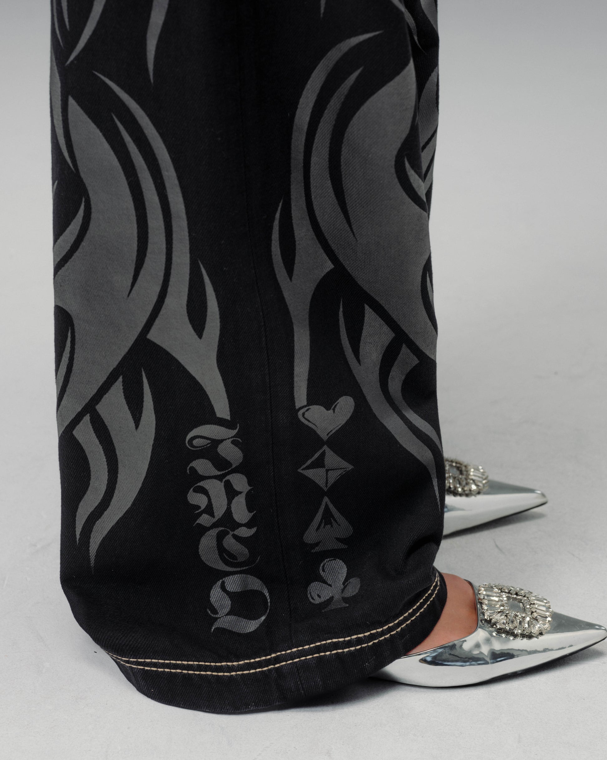 From the famous Tribal Collection. 13 oz. rope-dyed jet black denim, finished with a luxe blended starch wax for a smooth, structured feel. 23" bottom opening with contrast stitching and a wide-leg fit. Features tonal tribal flame artwork printed down both legs, original Celtic-inspired tribal embroidery on the back pocket in palladium metallic thread, and the signature four-suit rivets. Collectible flasher included.