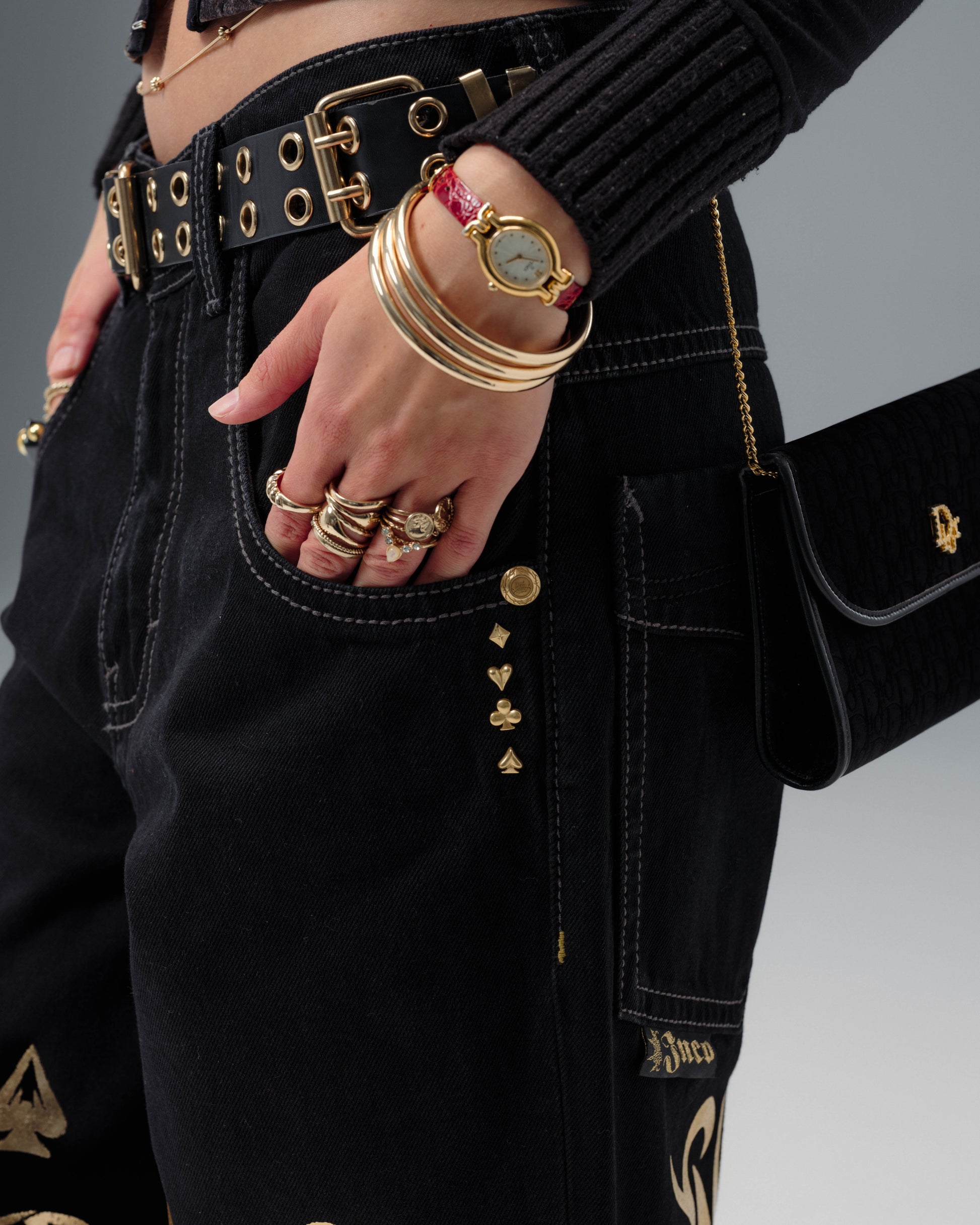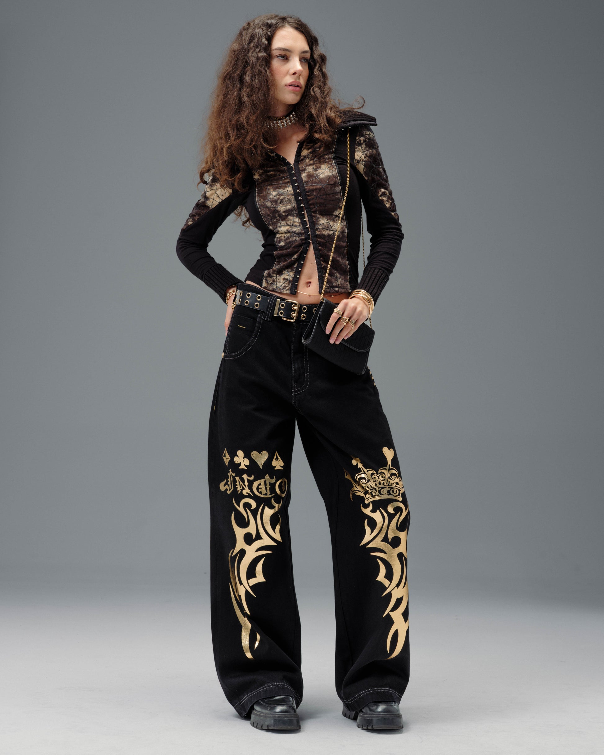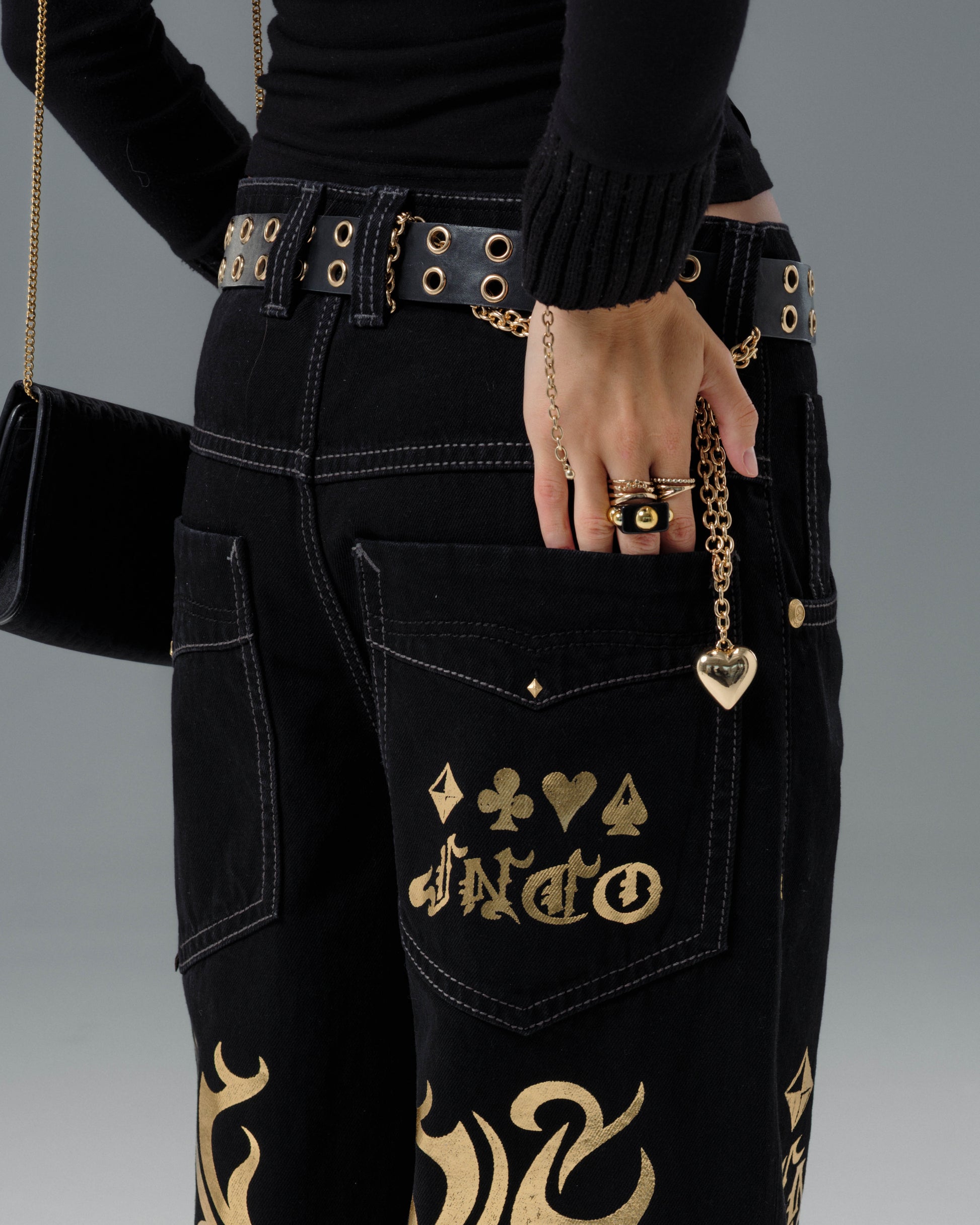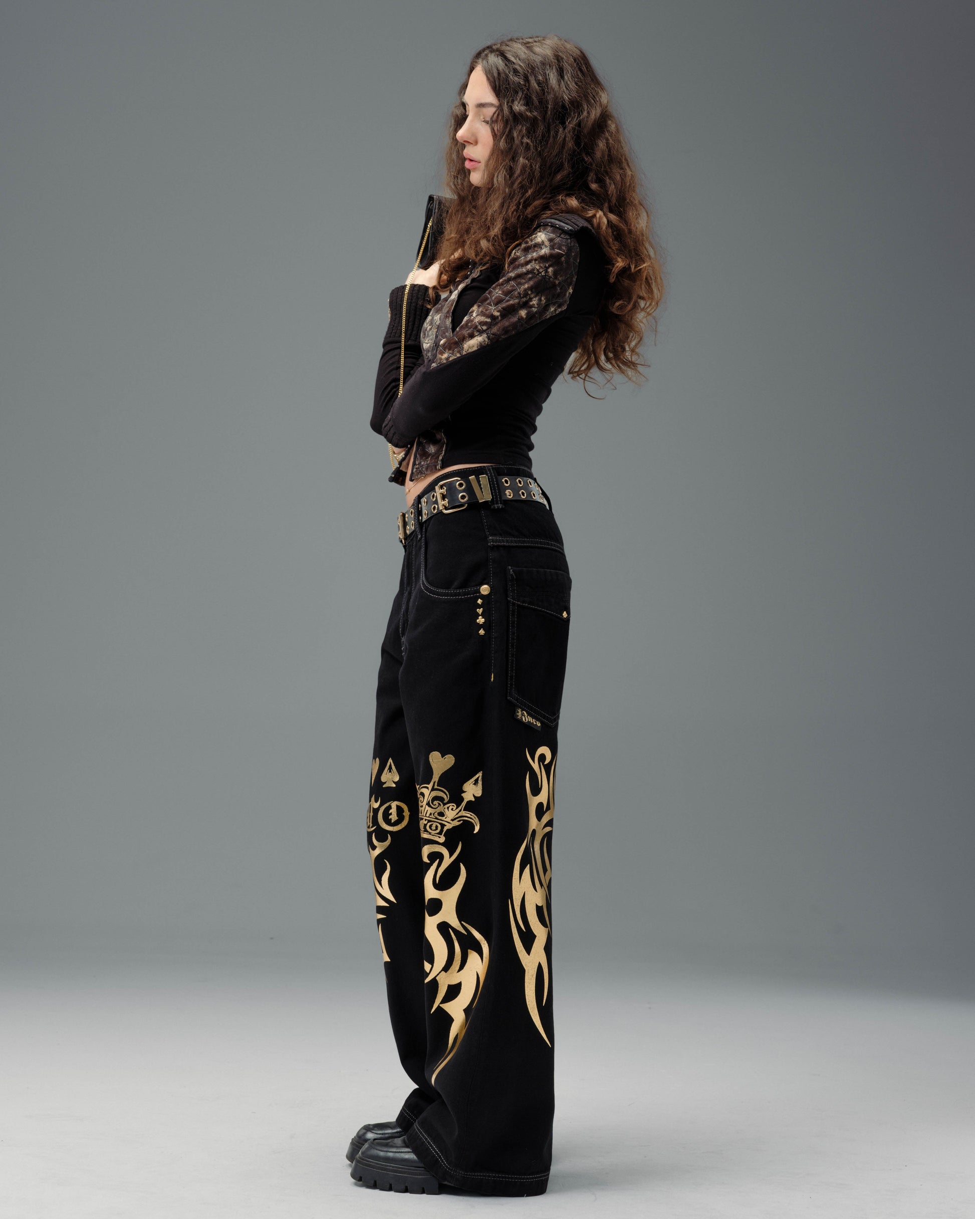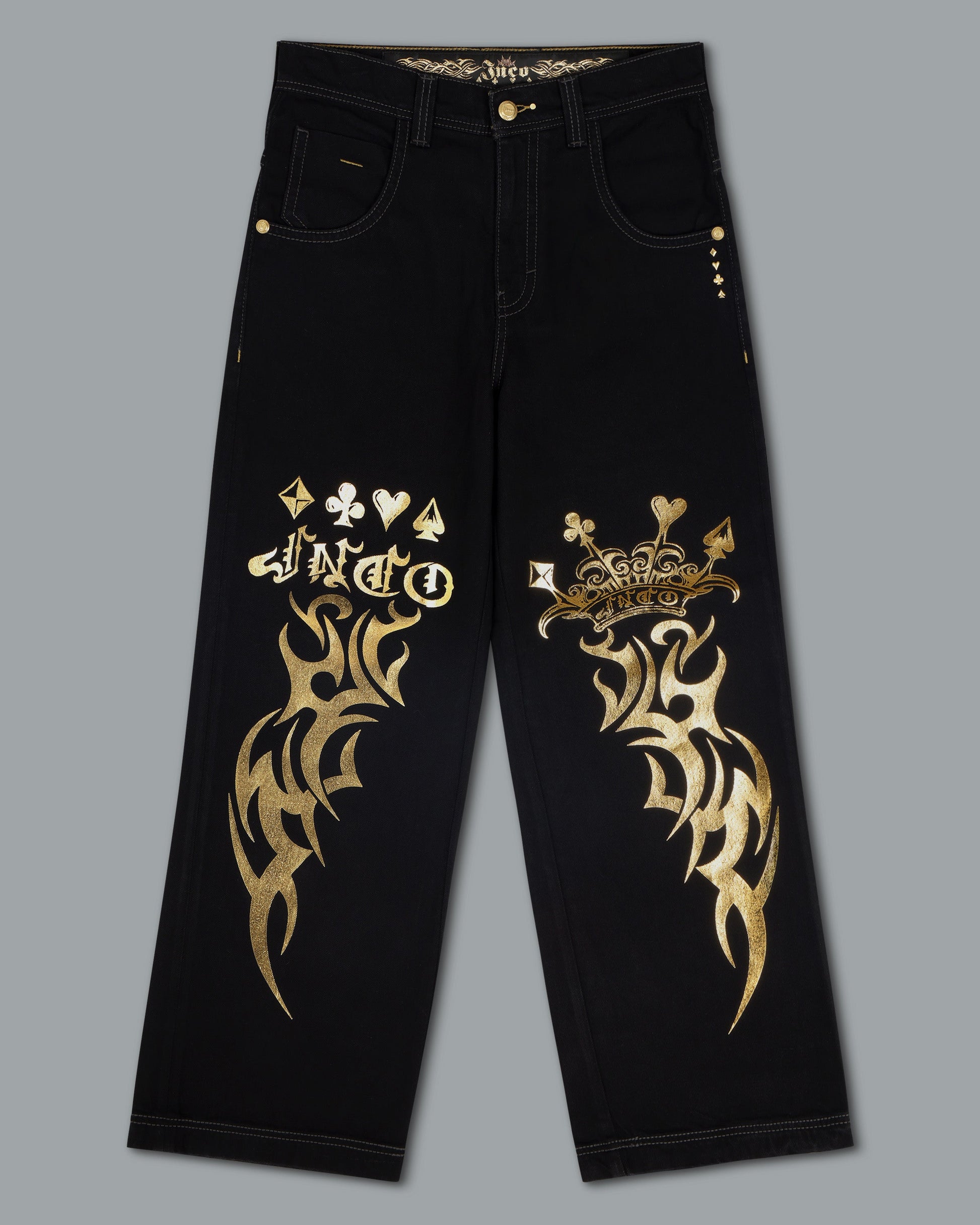 From the famous Tribal Collection. 13.5oz ring-spun cotton denim in a deep Jet Black wash with bold twill texture and retro-inspired construction. 23" bottom opening with contrast stitching and an oversized fit. Features original Tribal Gambler graphics in heritage gold foil, Old English logos, crowned symbols, and card suit icons. Custom hardware and gilded four-suit rivet add refined detail. Collectible flasher included.