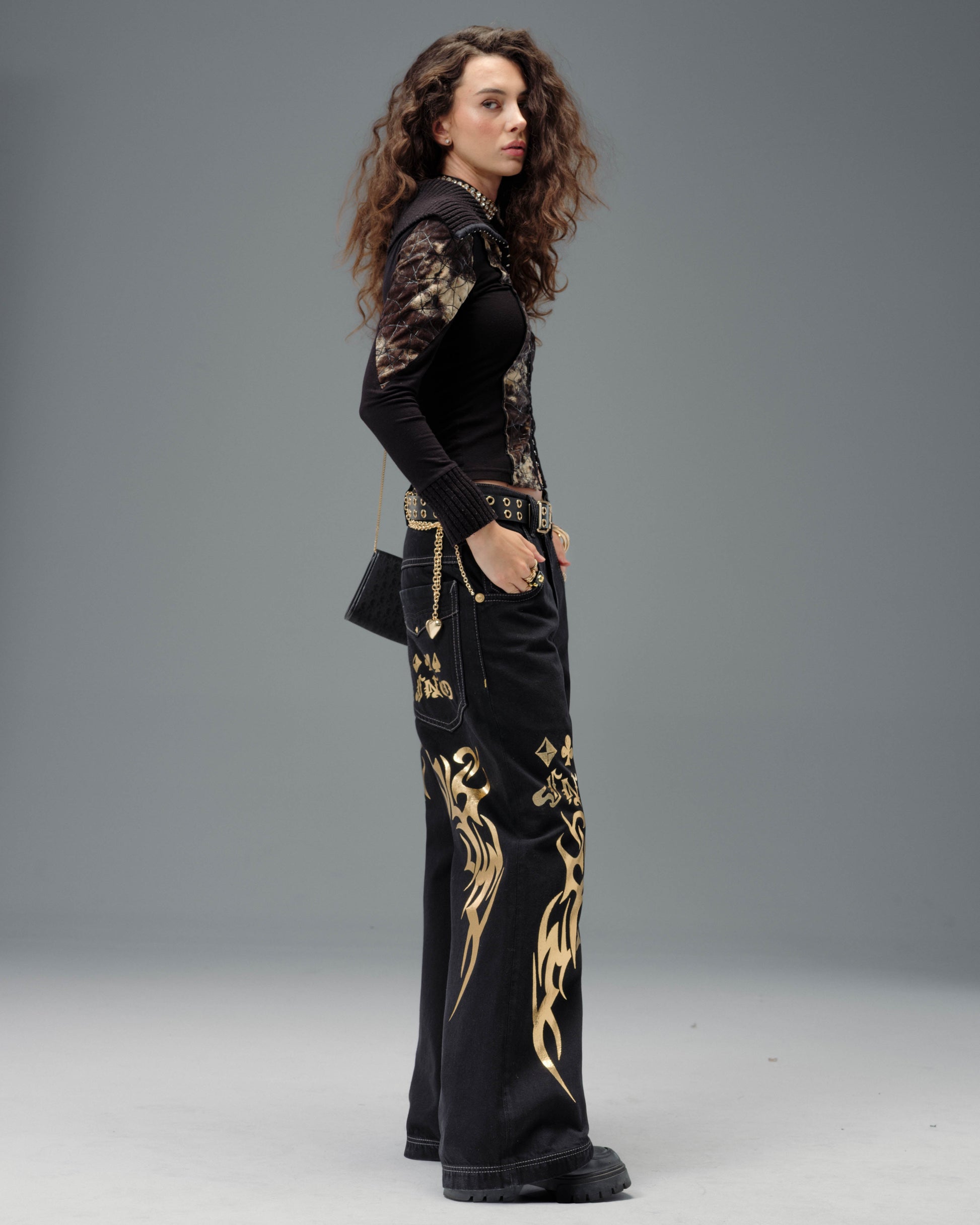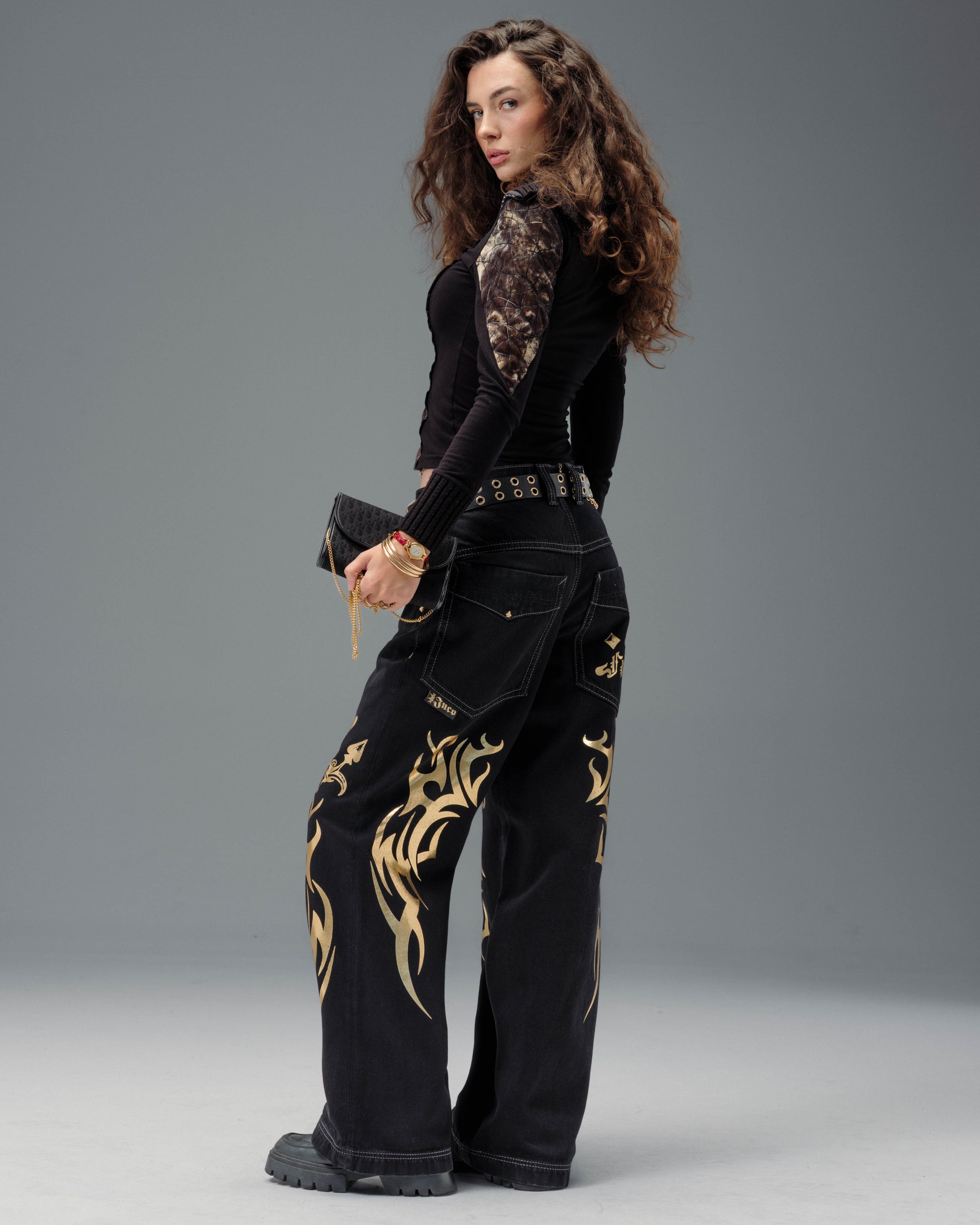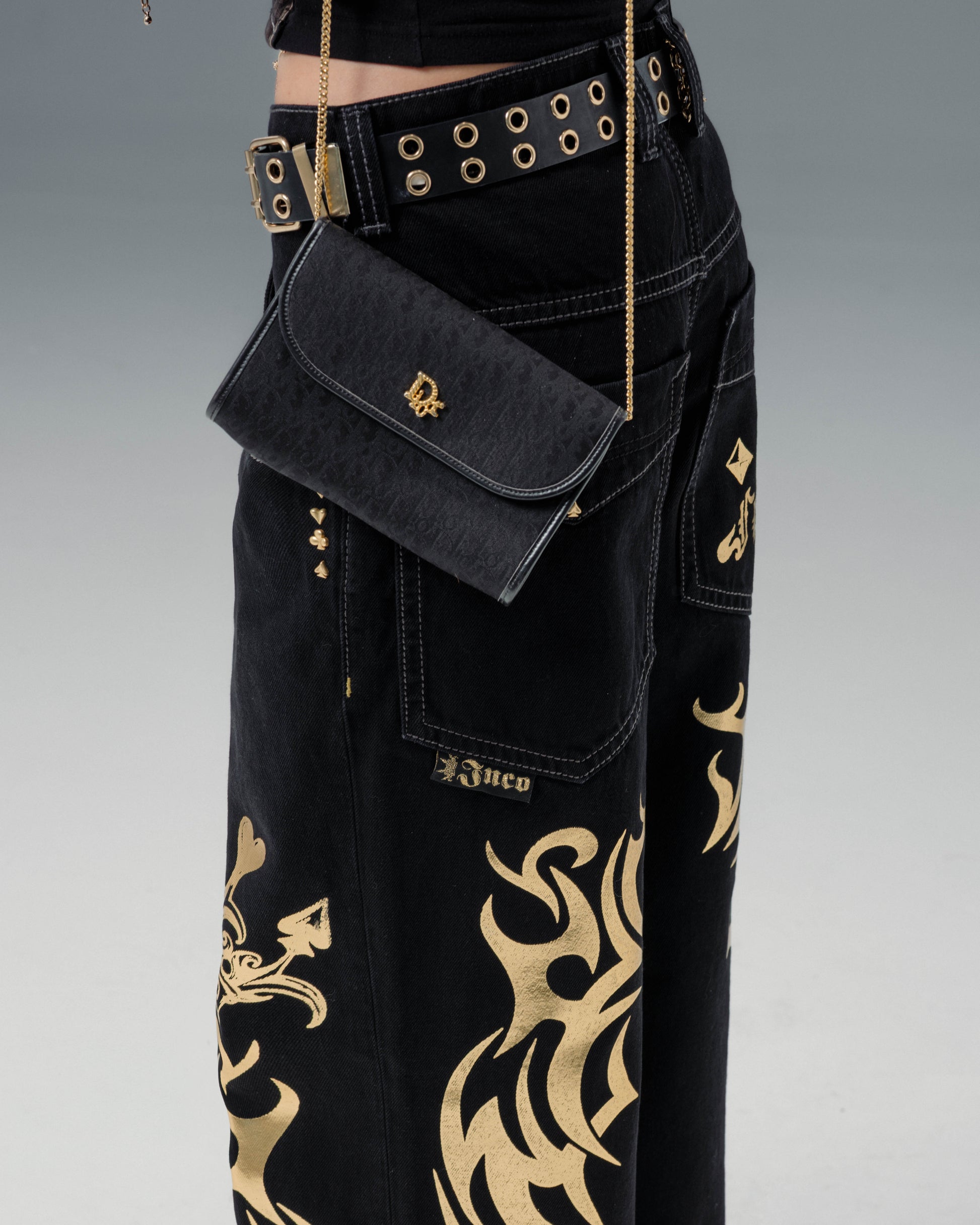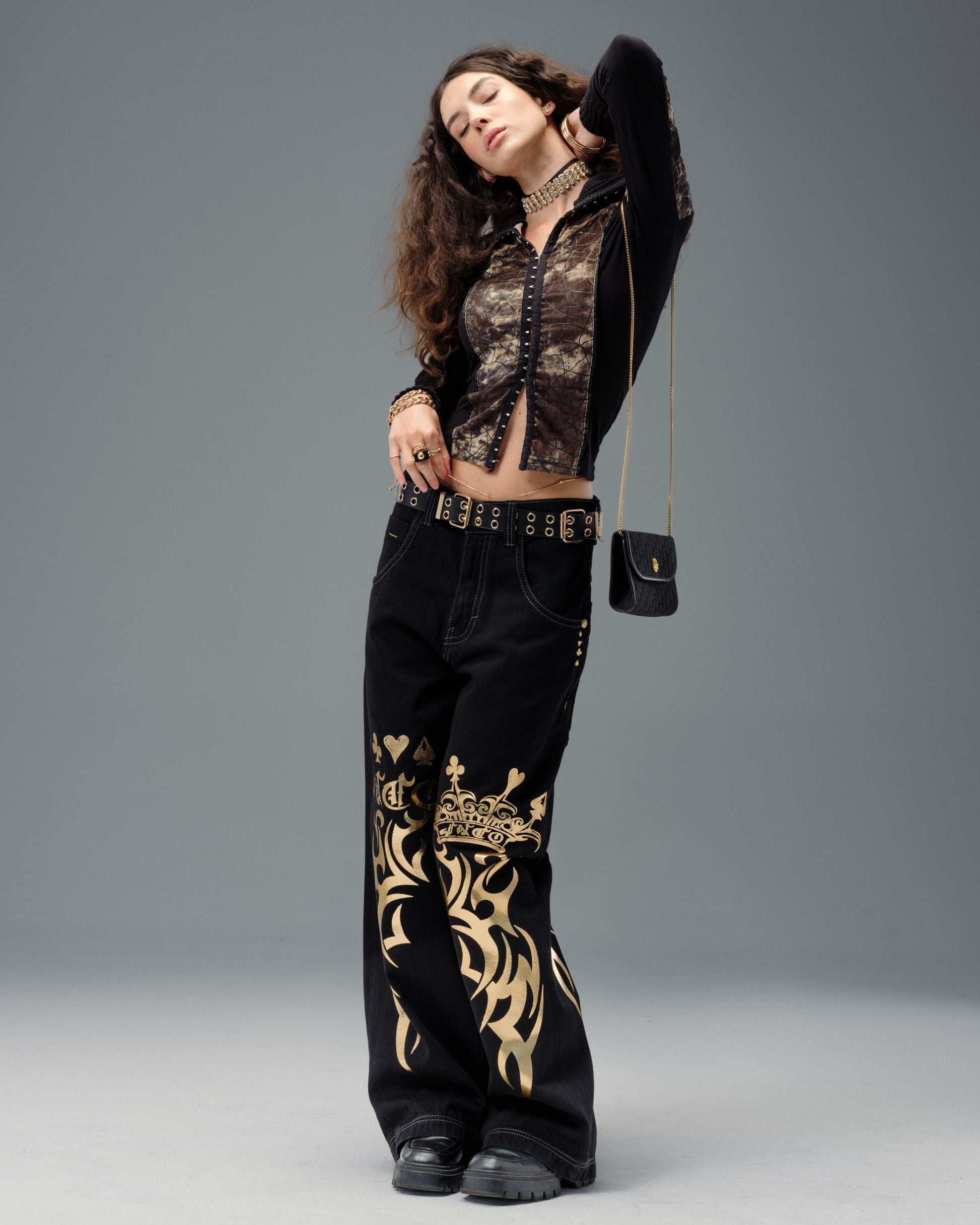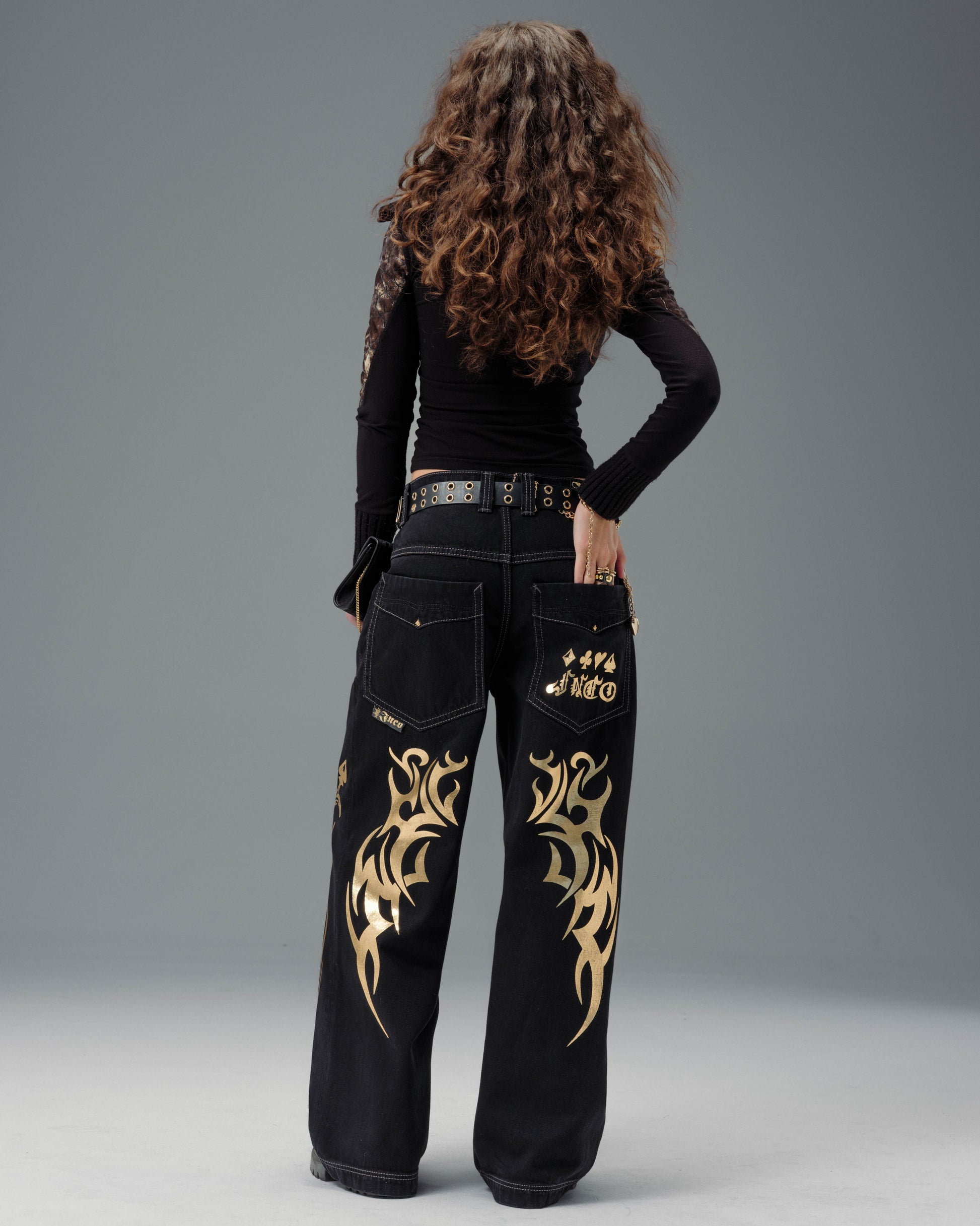 From the famous Tribal Collection. 13.5oz ring-spun cotton denim in a deep Jet Black wash with bold twill texture and retro-inspired construction. 23" bottom opening with contrast stitching and an oversized fit. Features original Tribal Gambler graphics in heritage gold foil, Old English logos, crowned symbols, and card suit icons. Custom hardware and gilded four-suit rivet add refined detail. Collectible flasher included.