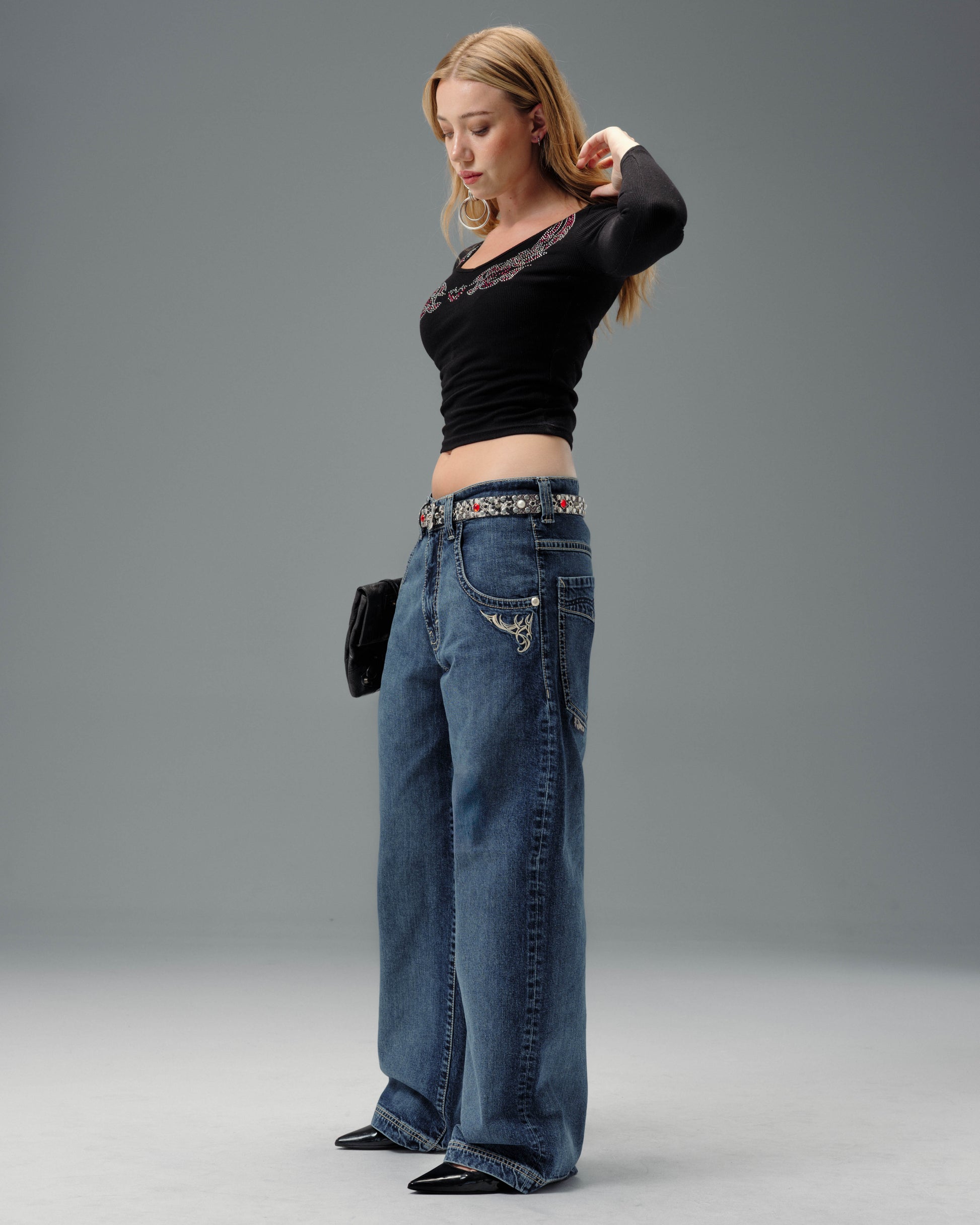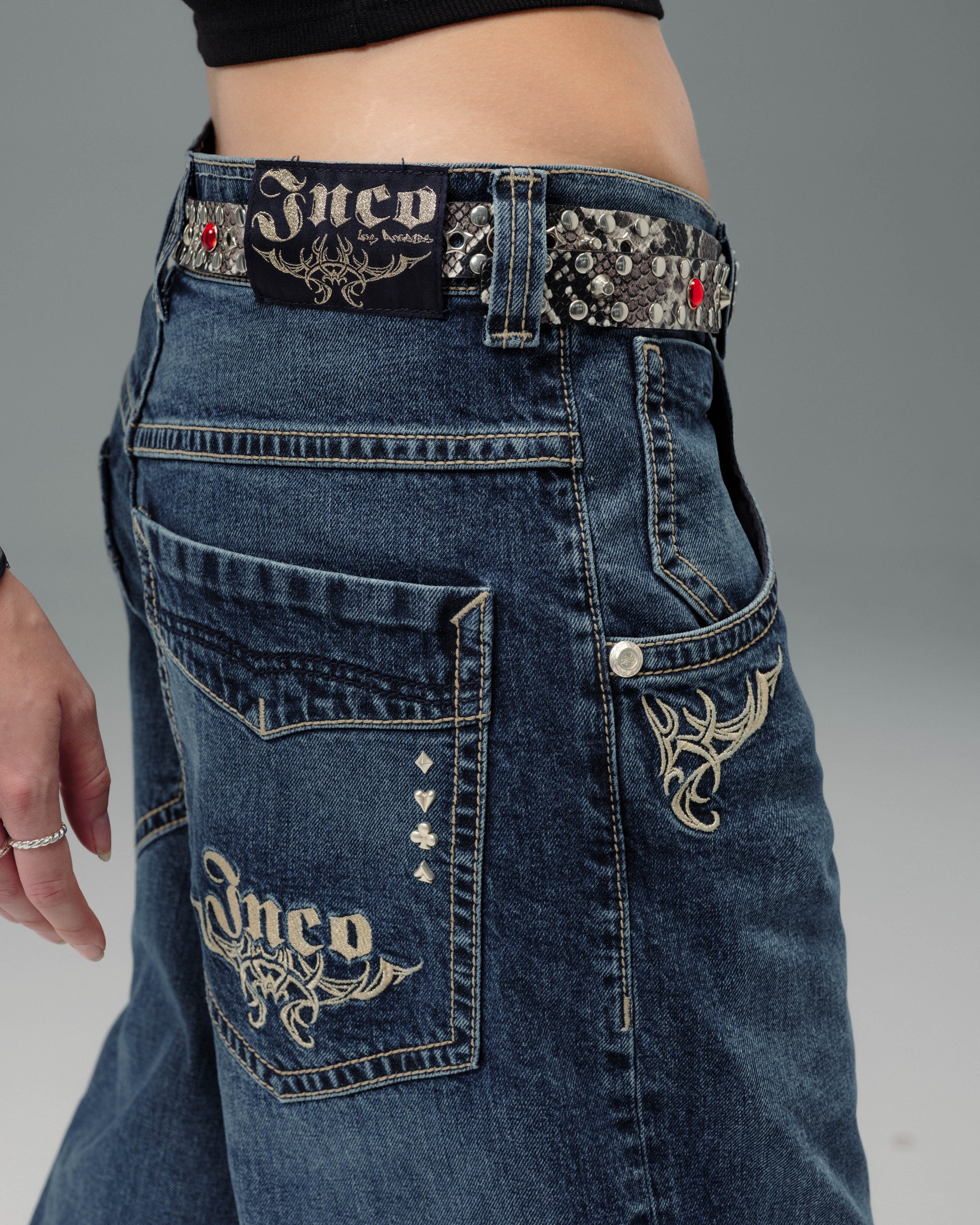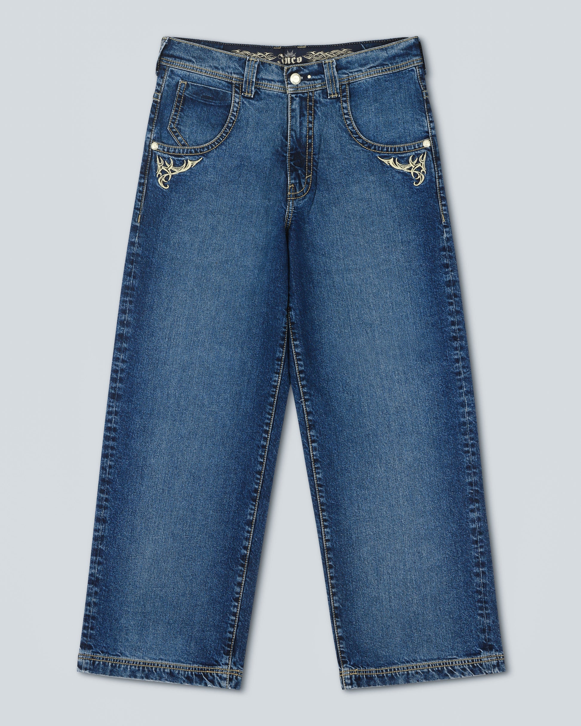 From the famous Tribal Collection. 13oz ring-spun denim in a Hand-Sand Dark Stone Wash with rich marbled character and an authentic, retro-inspired finish. 23" bottom opening with contrast stitching and a classic wide-leg fit. Features Celtic-inspired tribal embroidery on back pocket in pale white gold metallic thread, with indigo-accented hems, front corner details, and a signature four-suit rivet. Collectible flasher included.