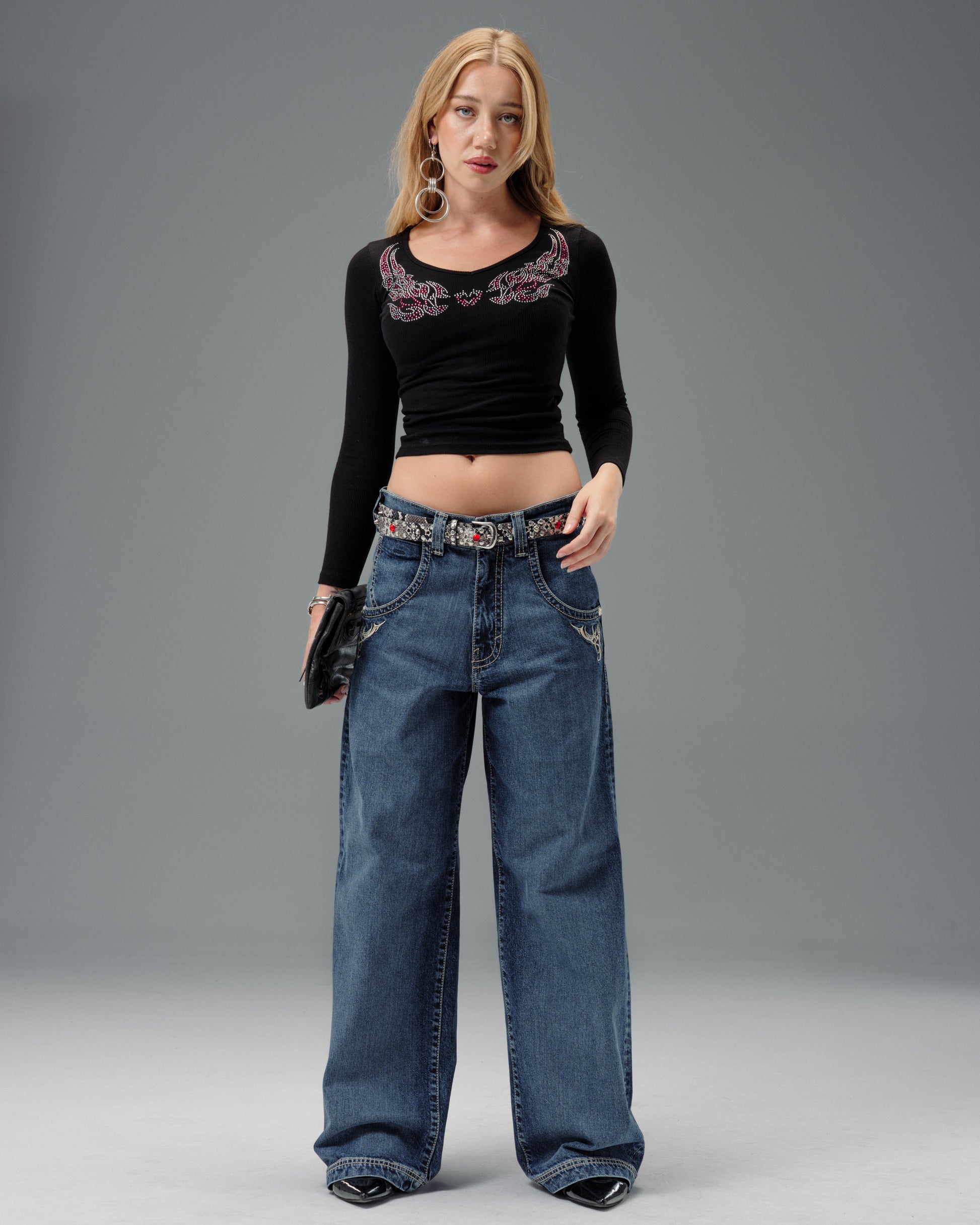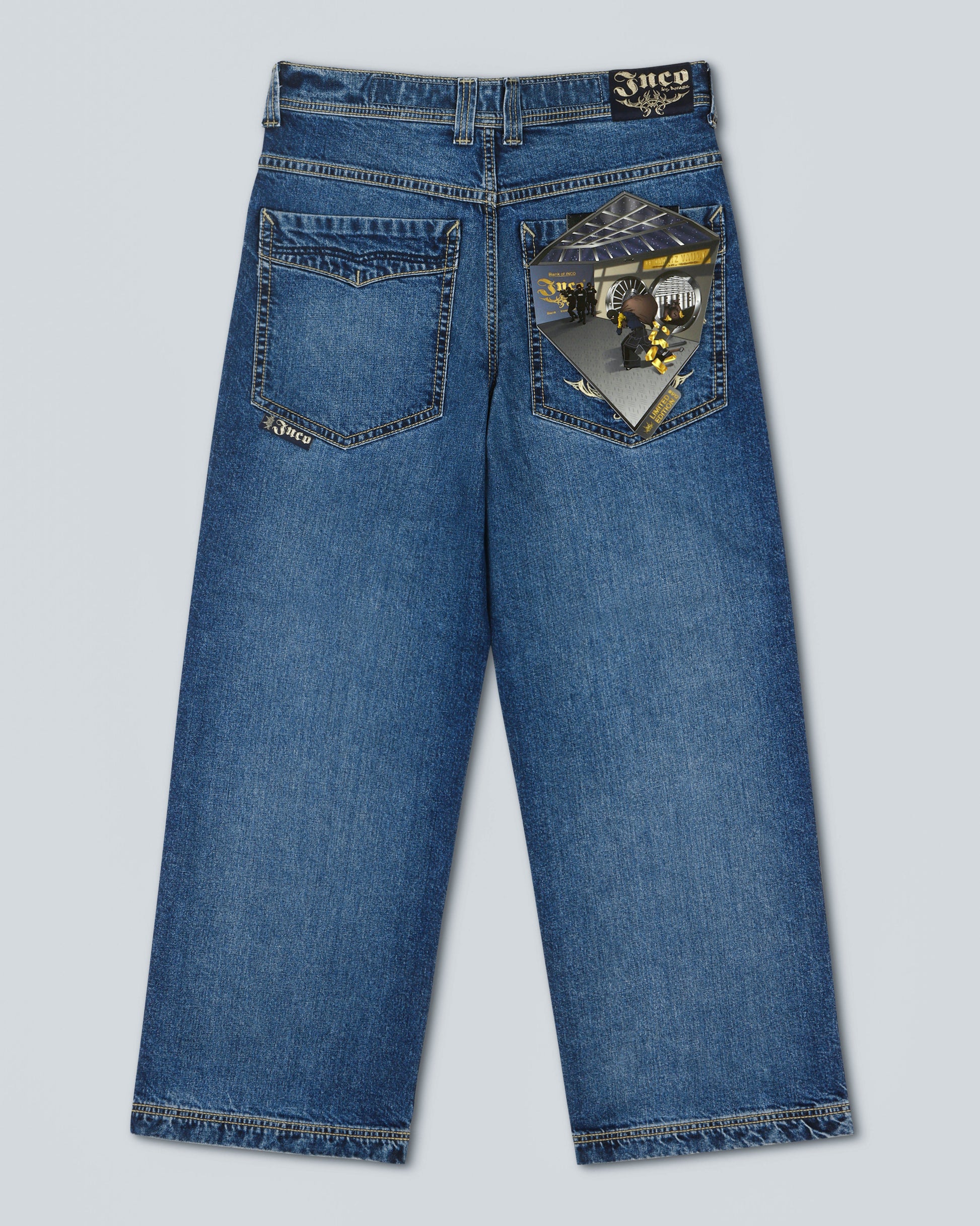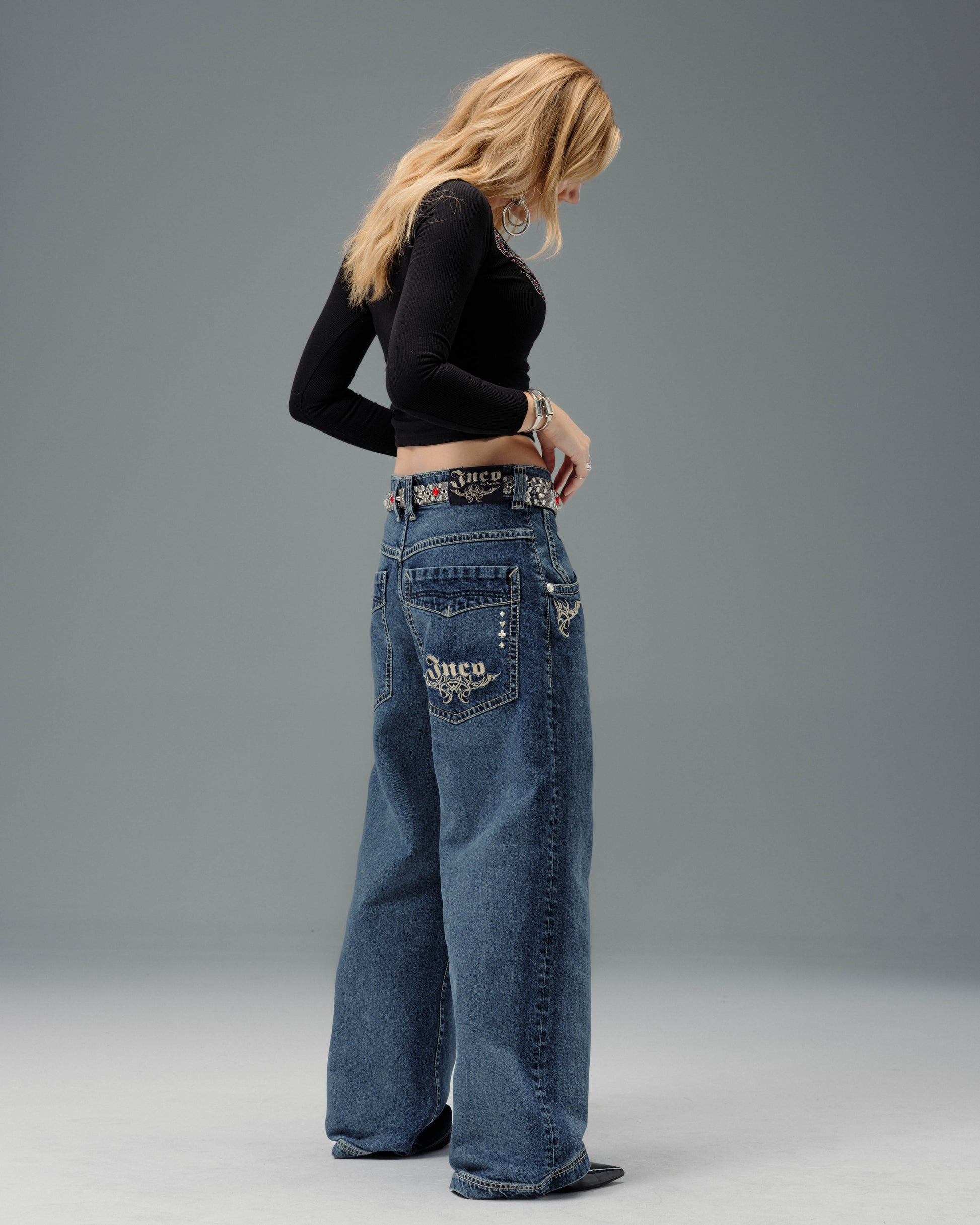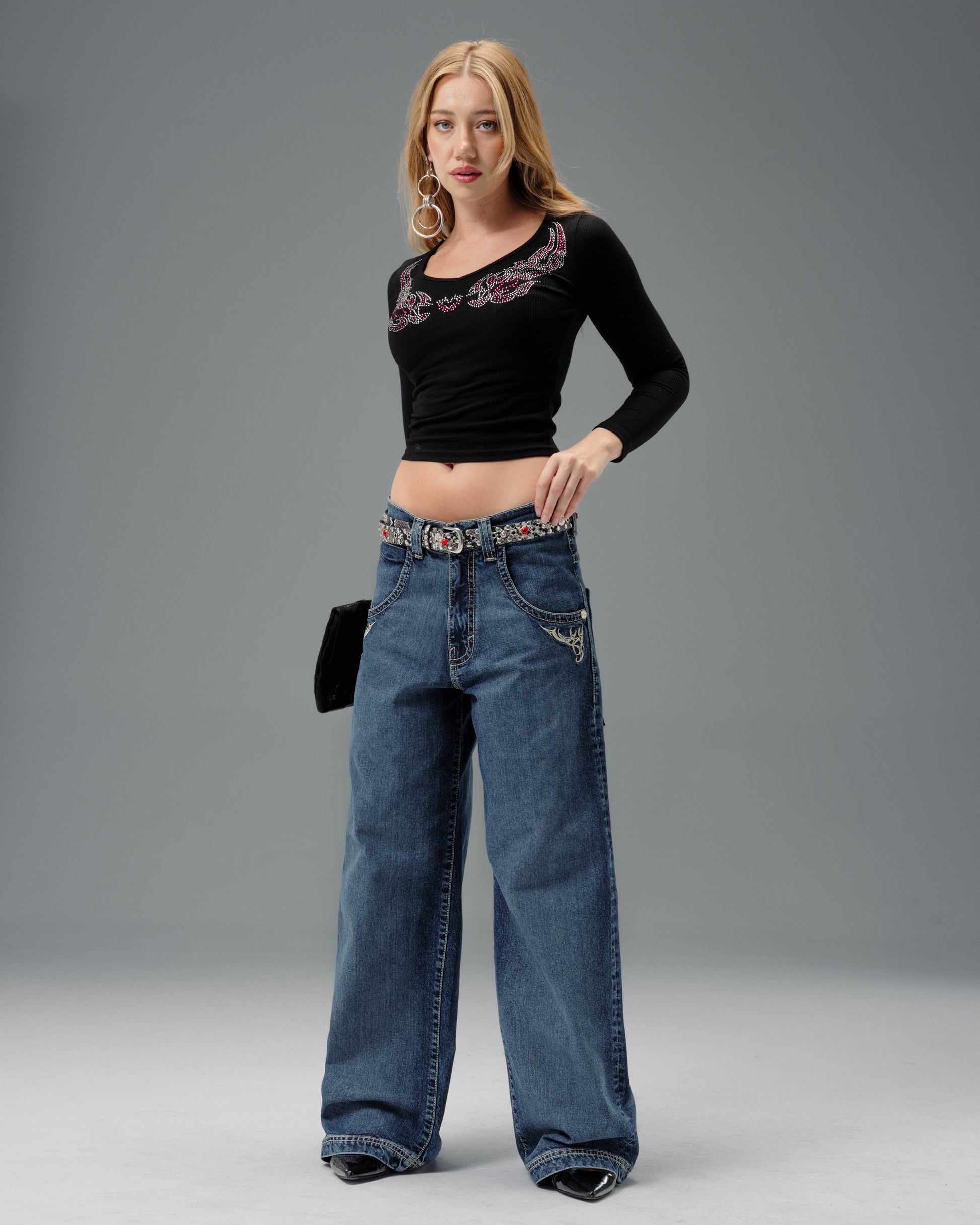 From the famous Tribal Collection. 13oz ring-spun denim in a Hand-Sand Dark Stone Wash with rich marbled character and an authentic, retro-inspired finish. 23" bottom opening with contrast stitching and a classic wide-leg fit. Features Celtic-inspired tribal embroidery on back pocket in pale white gold metallic thread, with indigo-accented hems, front corner details, and a signature four-suit rivet. Collectible flasher included.