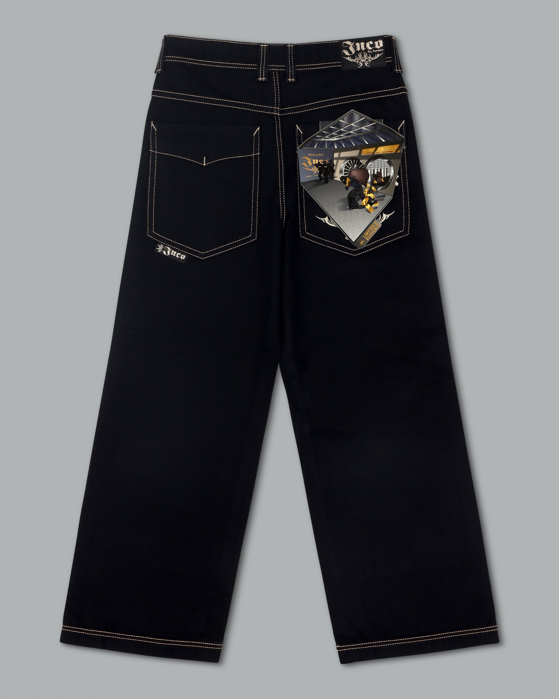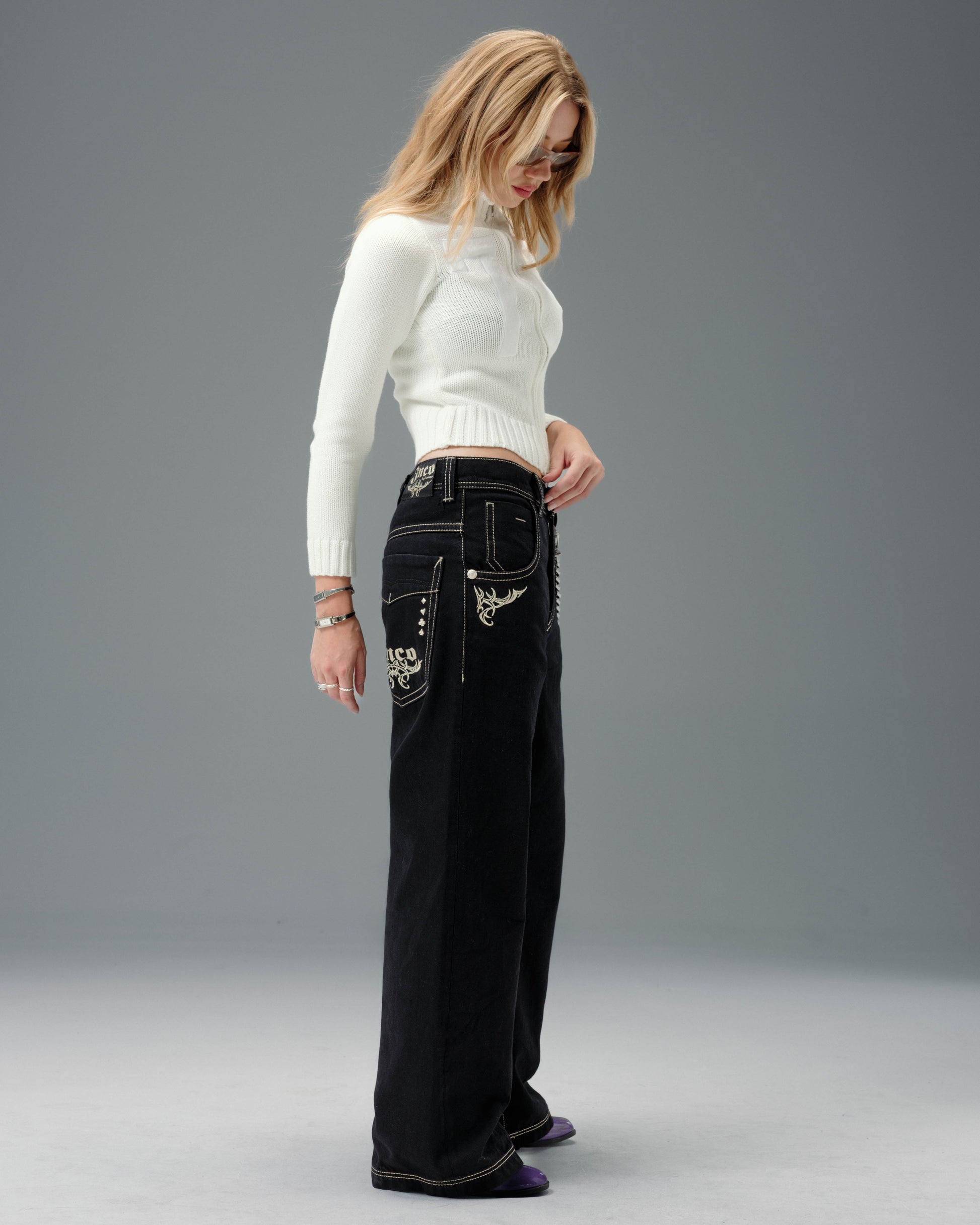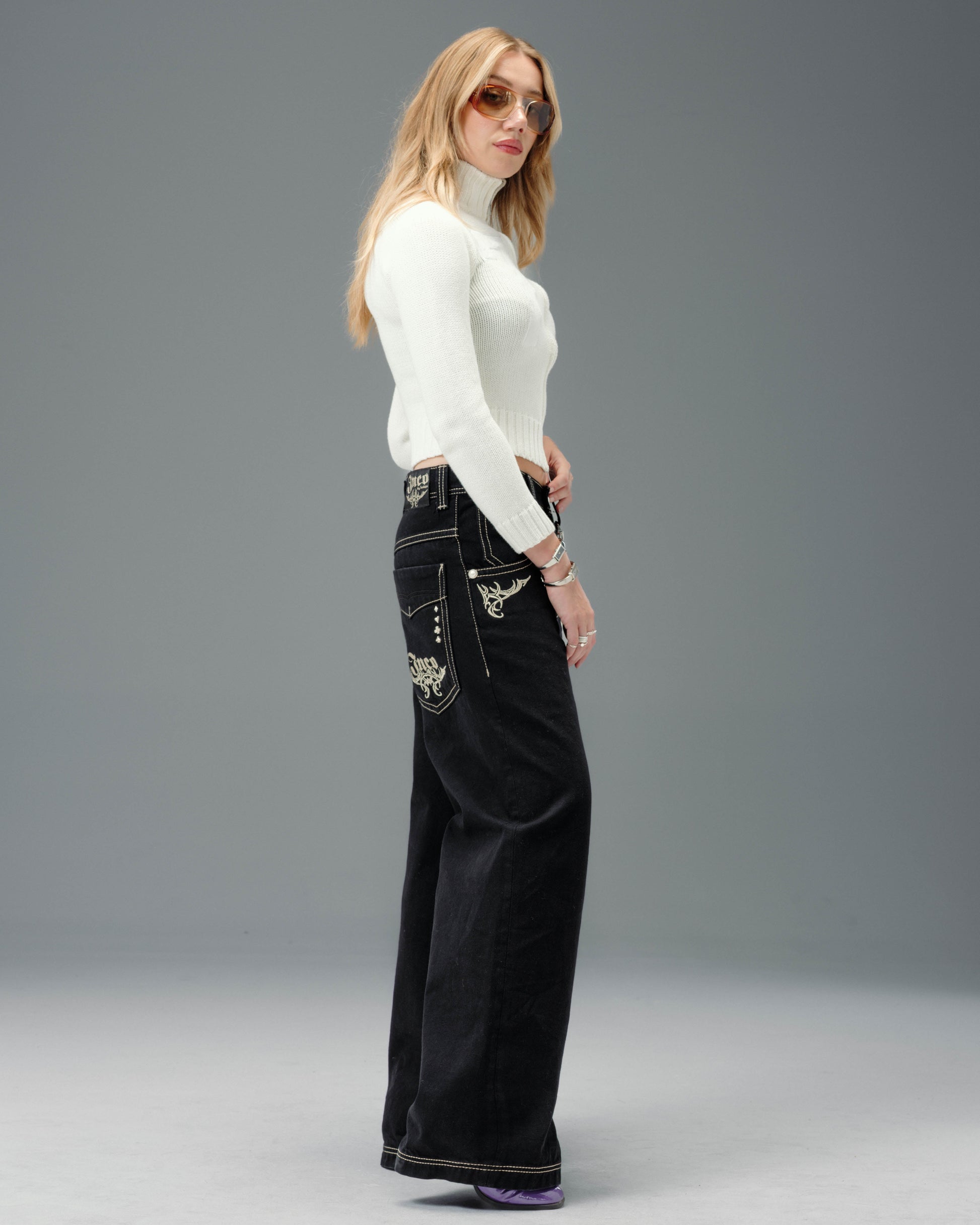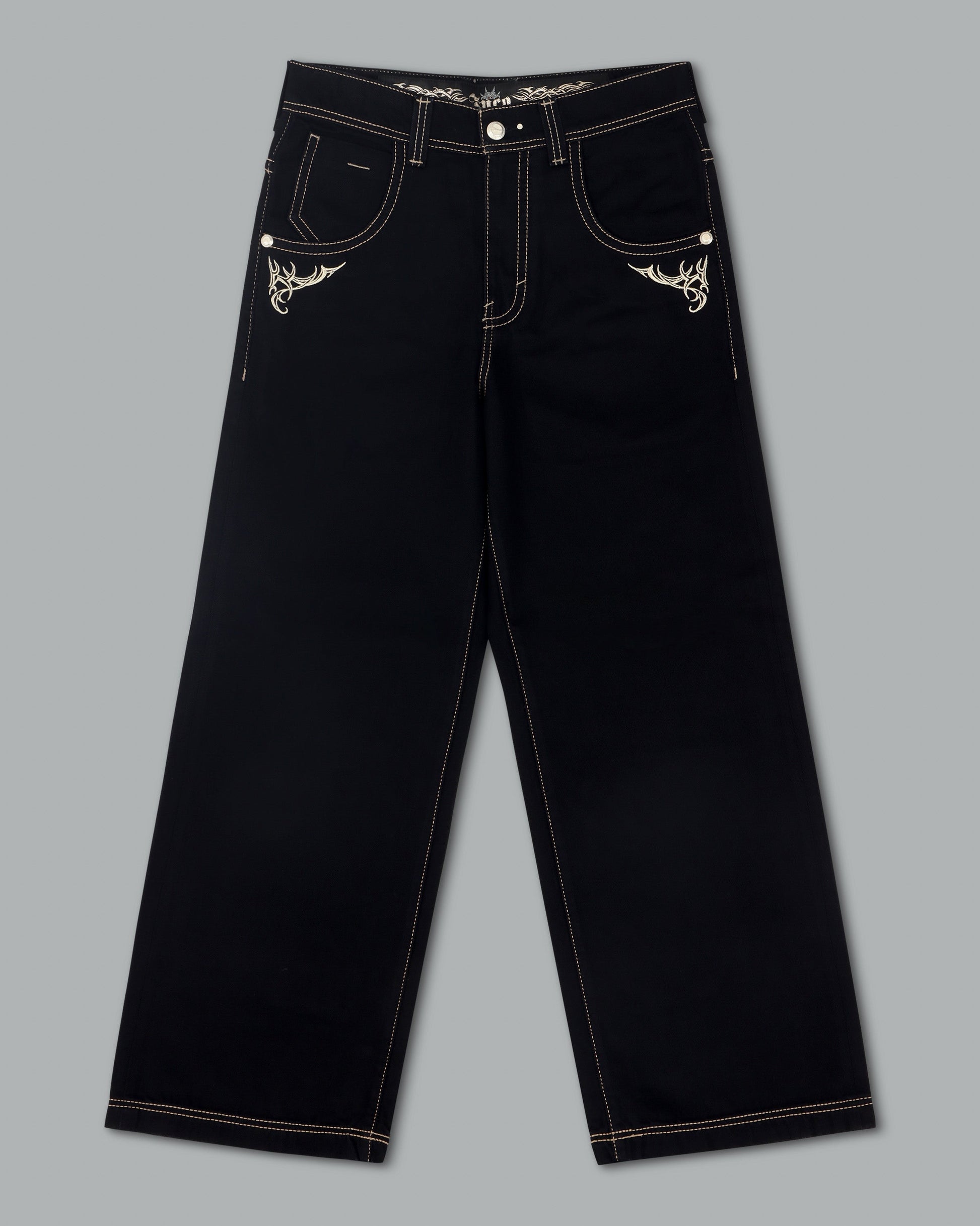From the famous Tribal Collection. 13.5oz ring-spun denim in a deep Jet Black wash with a smooth, luxe finish. 23" bottom opening with contrast stitching and wide-leg fit. Features Celtic-inspired tribal embroidery on back pocket in pale white gold metallic thread, with indigo-accented hems, front corner details, and a signature four-suit rivet. Collectible flasher included.