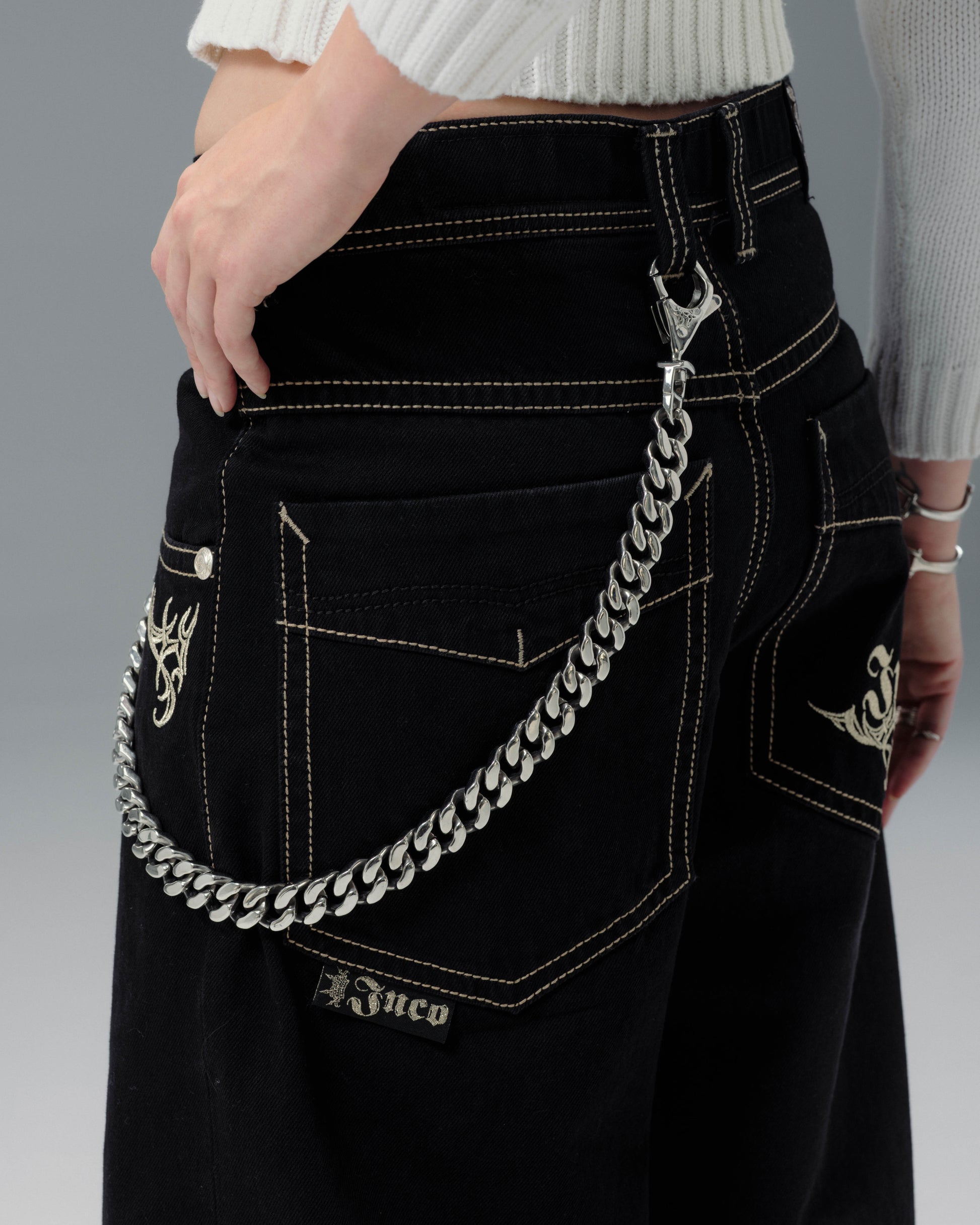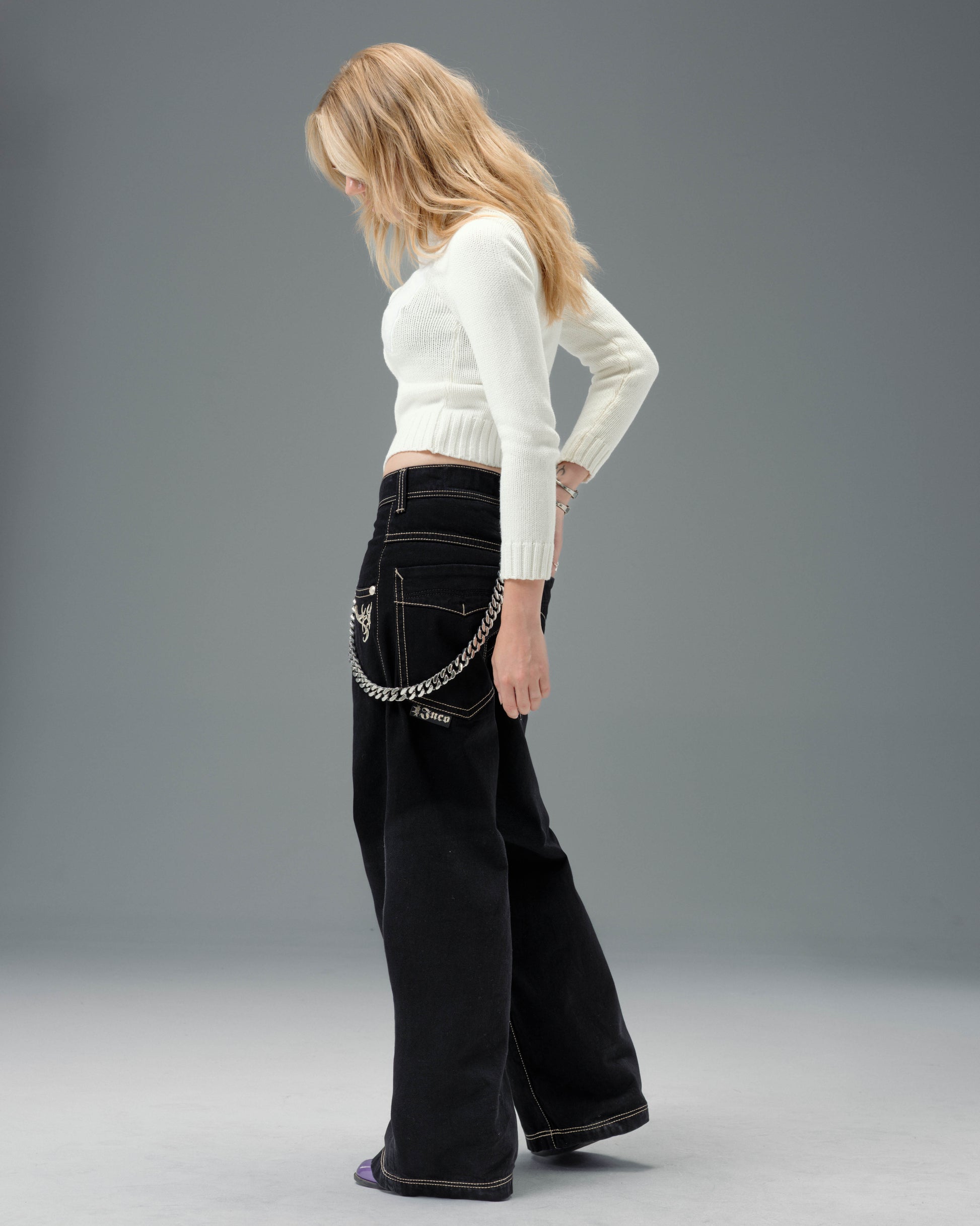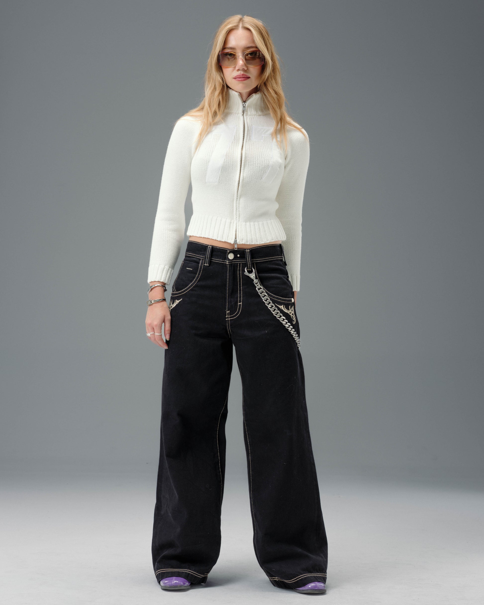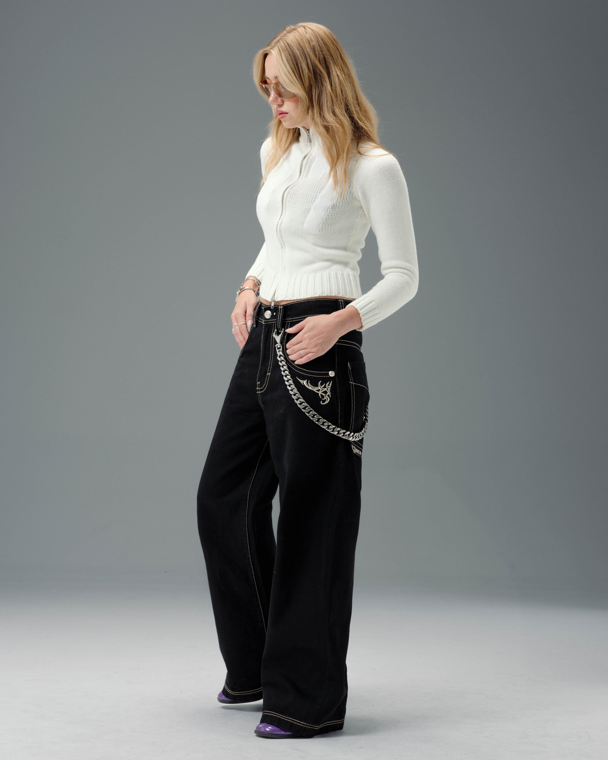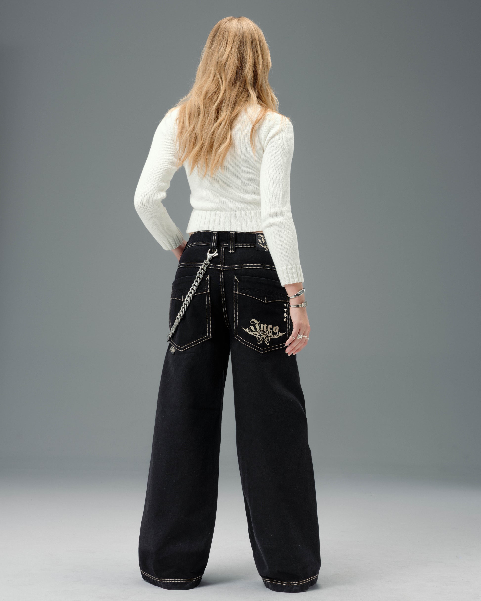 From the famous Tribal Collection. 13.5oz ring-spun denim in a deep Jet Black wash with a smooth, luxe finish. 23" bottom opening with contrast stitching and wide-leg fit. Features Celtic-inspired tribal embroidery on back pocket in pale white gold metallic thread, with indigo-accented hems, front corner details, and a signature four-suit rivet. Collectible flasher included.