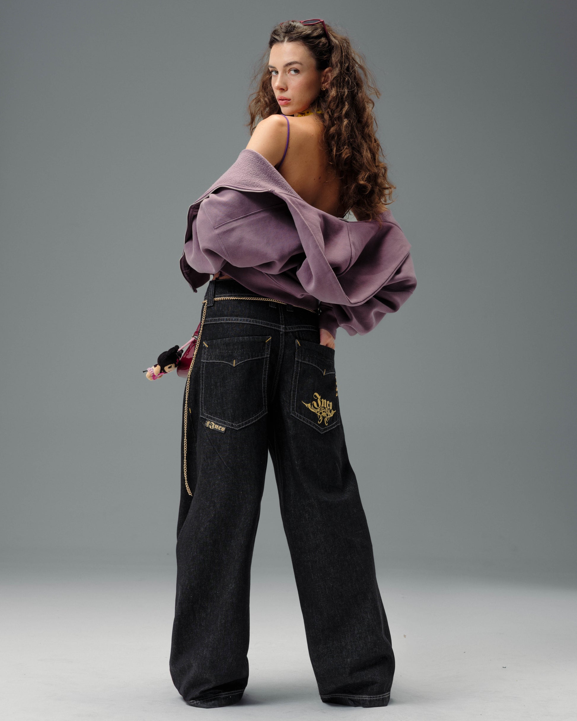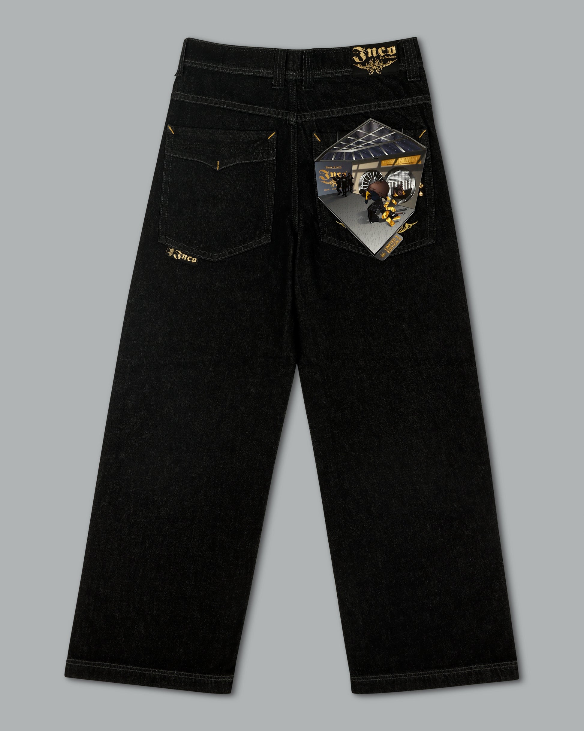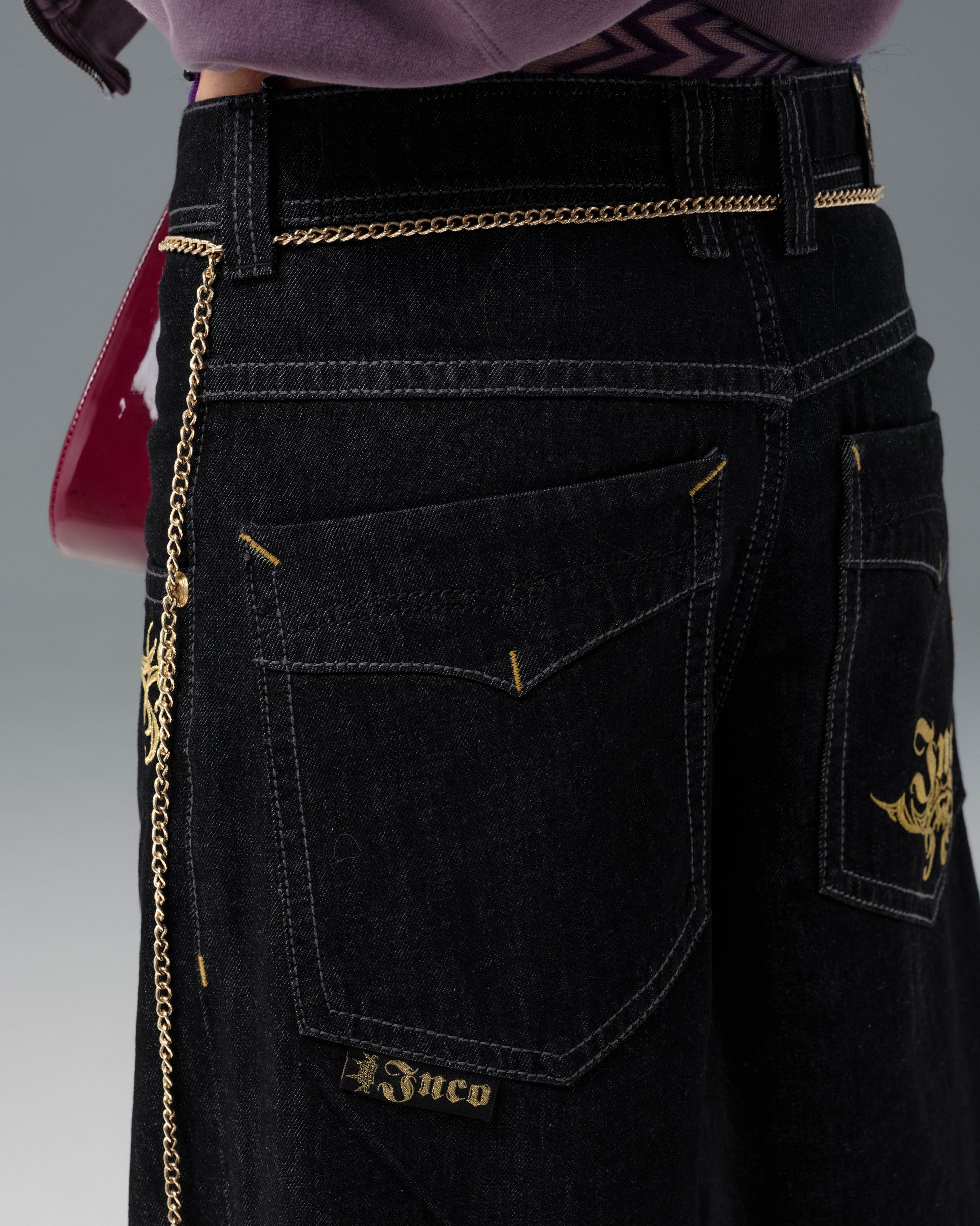 From the famous Tribal Collection. 13.5oz ring-spun denim in a rich Laser Black wash with an authentic marbled finish. 23" bottom opening with contrast stitching and a wide-leg fit. Features Celtic-inspired tribal embroidery on back pocket in antique gold metallic thread, with indigo-accented hems, front corner details, and a signature four-suit rivet. Collectible flasher included.