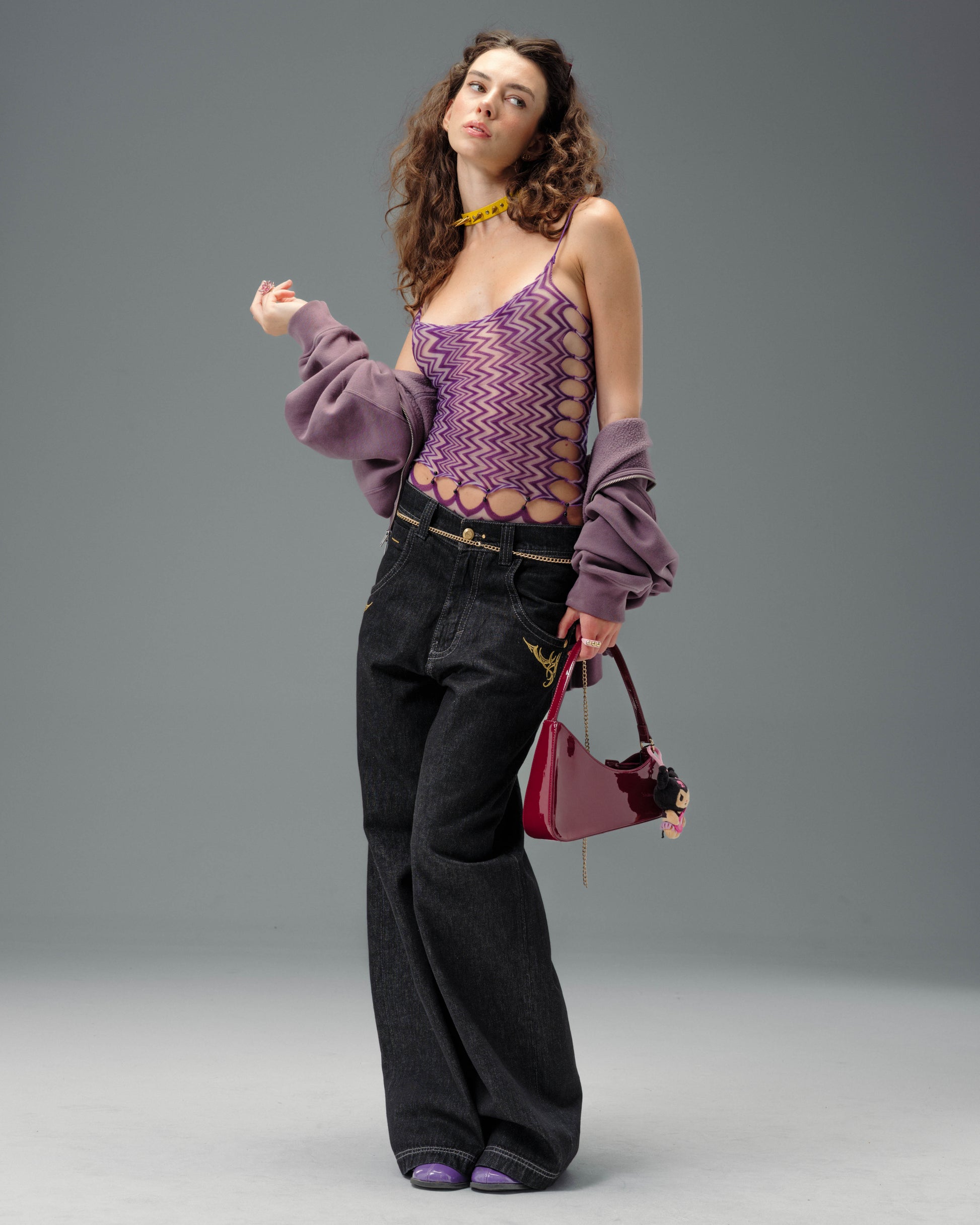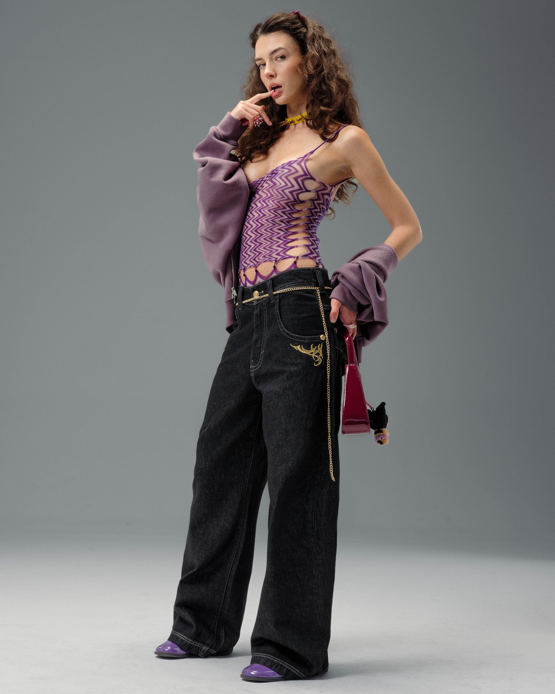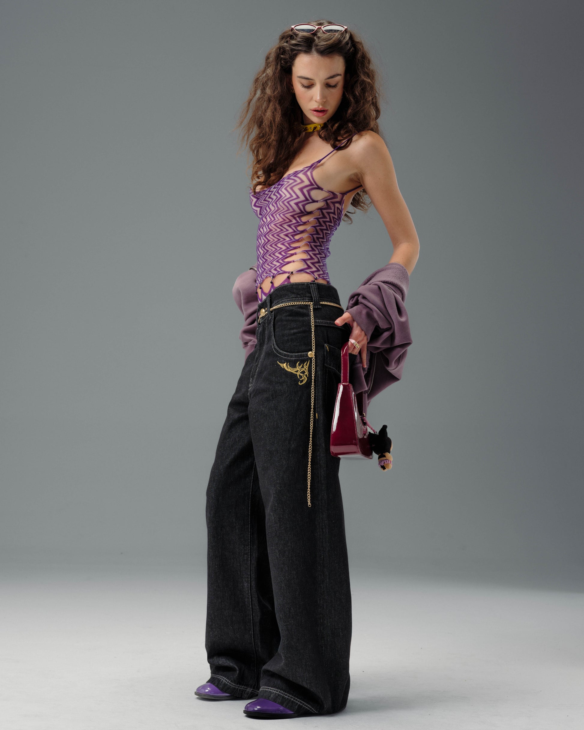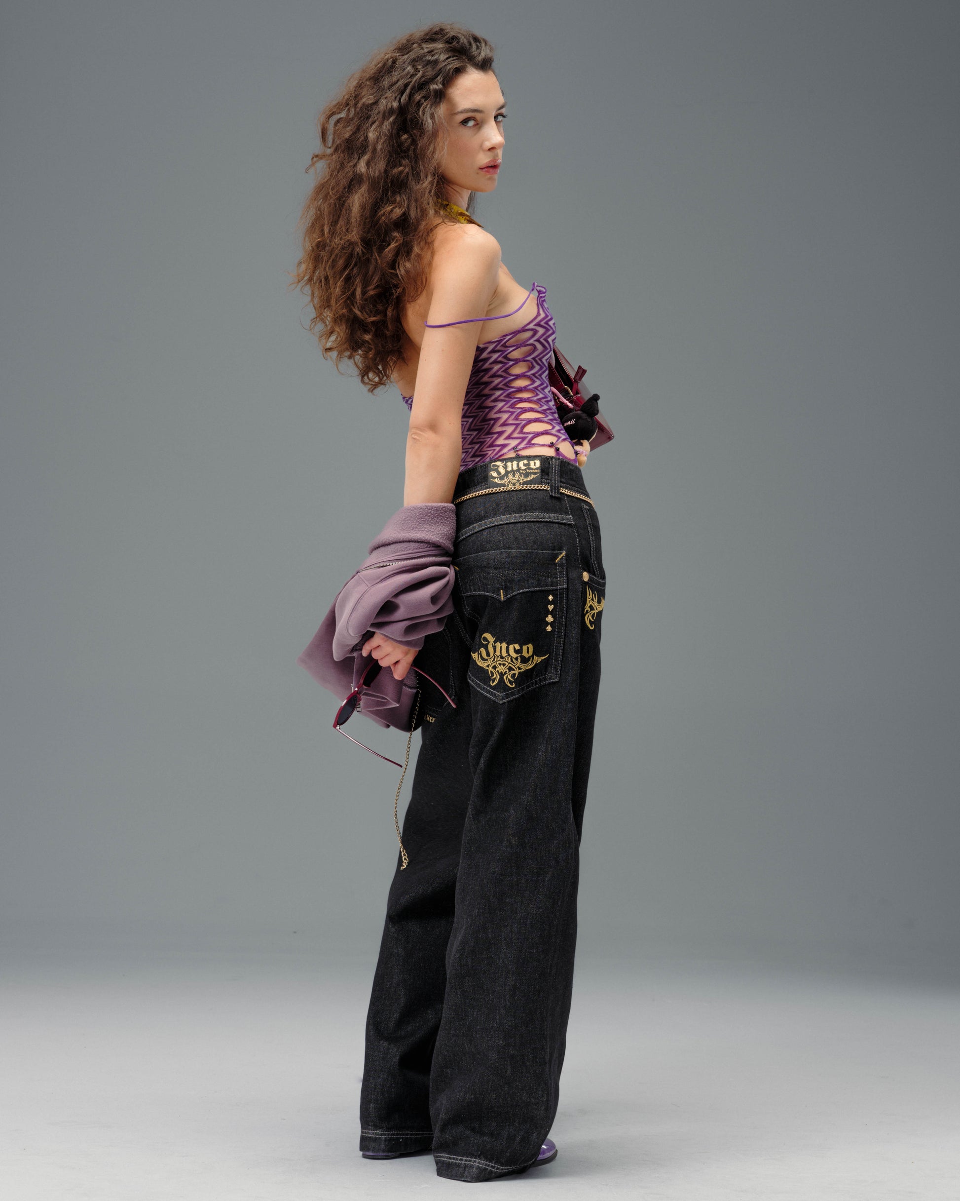 From the famous Tribal Collection. 13.5oz ring-spun denim in a rich Laser Black wash with an authentic marbled finish. 23" bottom opening with contrast stitching and a wide-leg fit. Features Celtic-inspired tribal embroidery on back pocket in antique gold metallic thread, with indigo-accented hems, front corner details, and a signature four-suit rivet. Collectible flasher included.