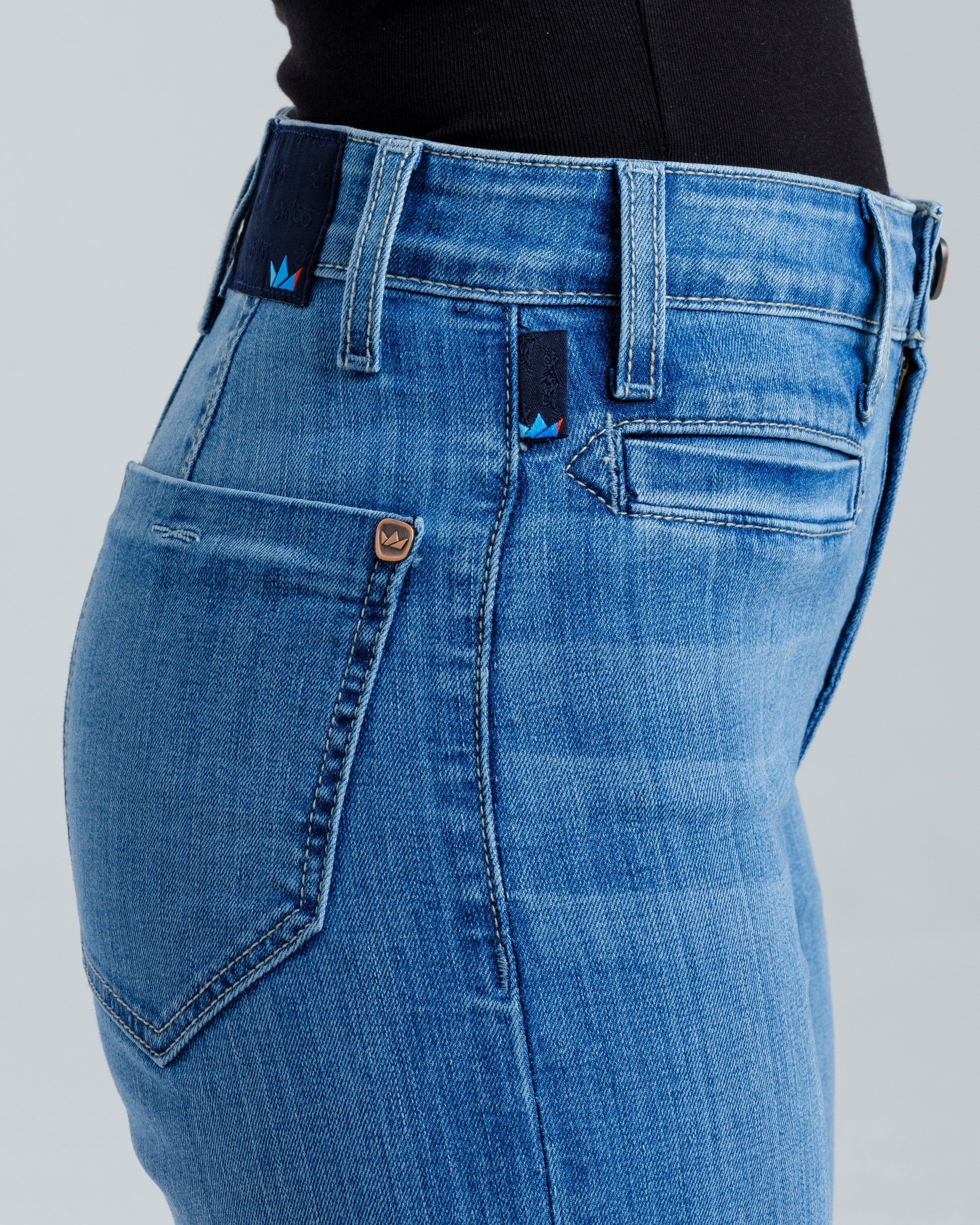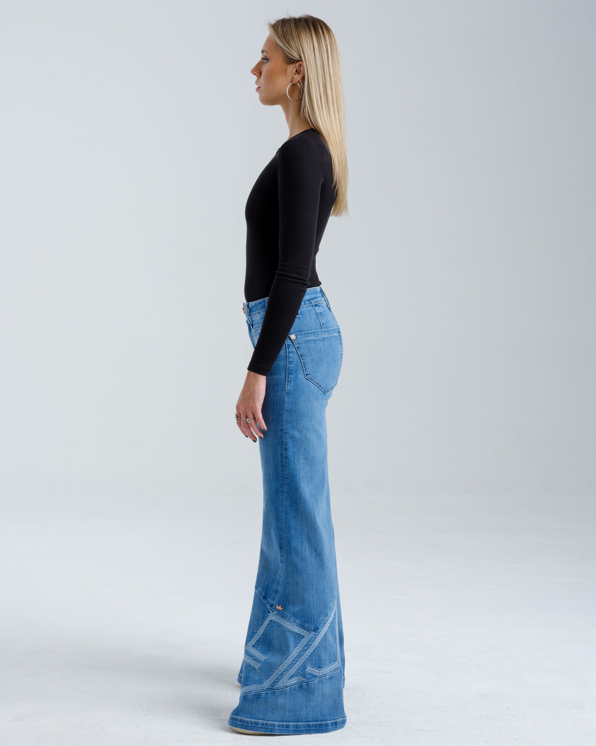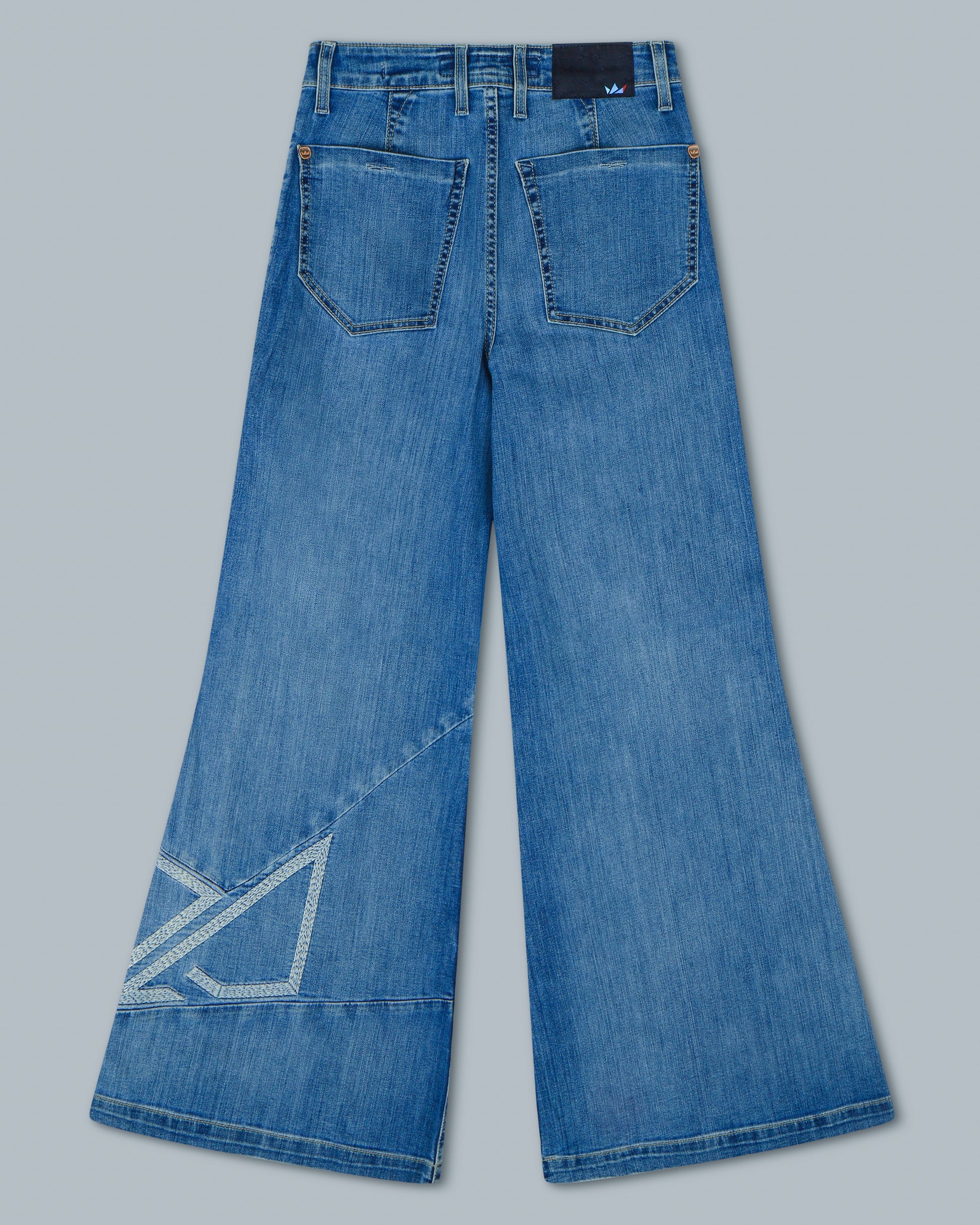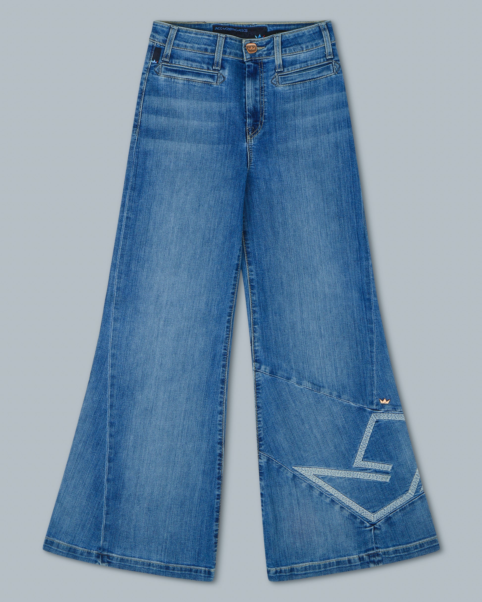 A bold high-rise, wide-flare jean blending vintage charm with modern sophistication. Crafted from soft stretch denim with S-Gene® technology and REPREVE® recycled yarns for a luxurious, comfortable fit. Features a high waist, front double welt pockets, and fashion darts at the back for a flattering shape. Geometric paneling and a unique cutout on the left leg showcase the new crown embroidery. Finished with contrast stitching, premium hardware, and an antique wash.