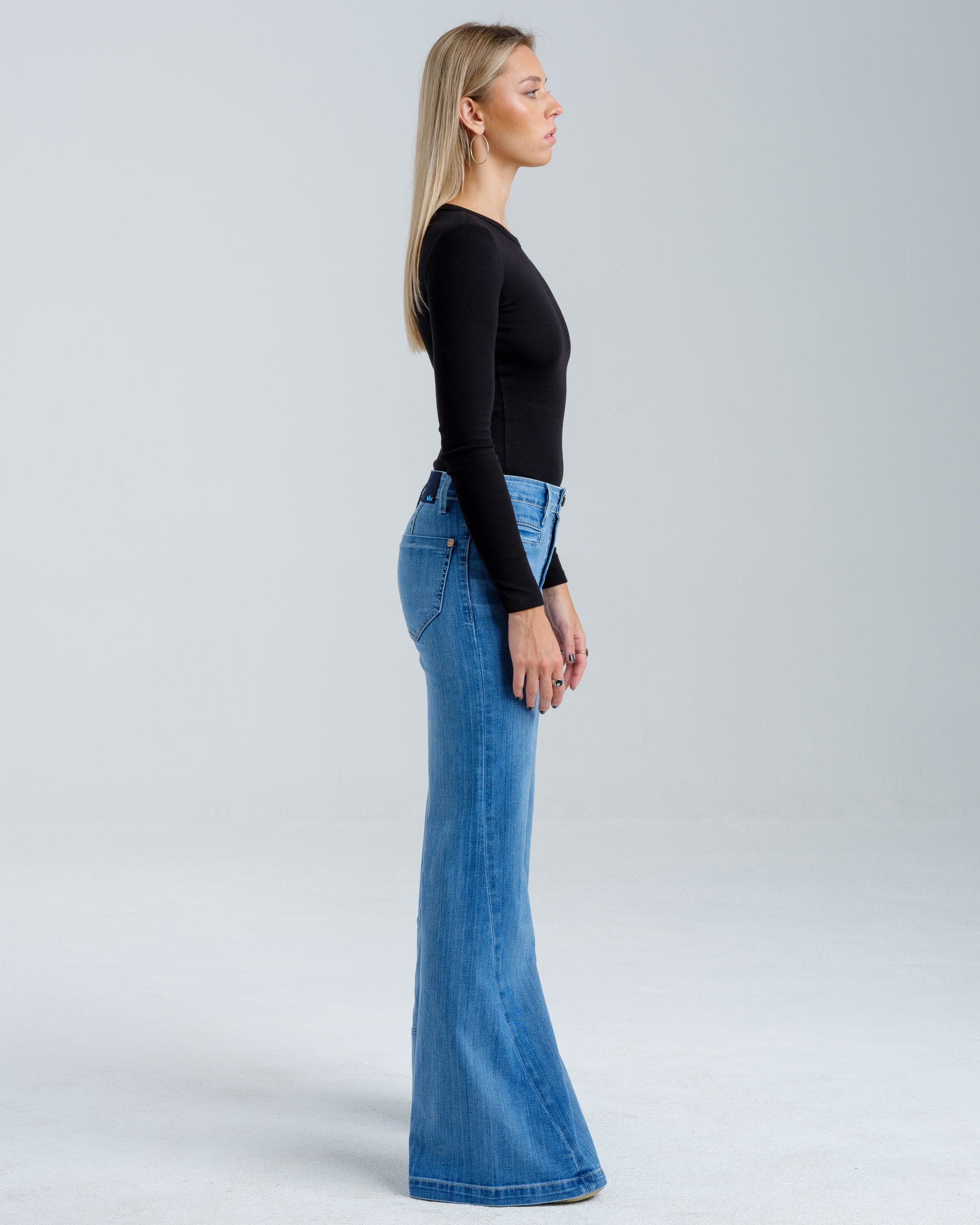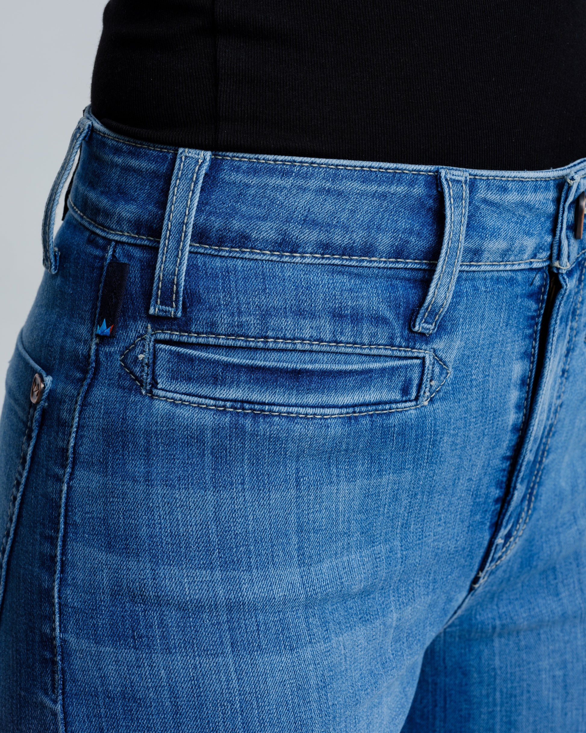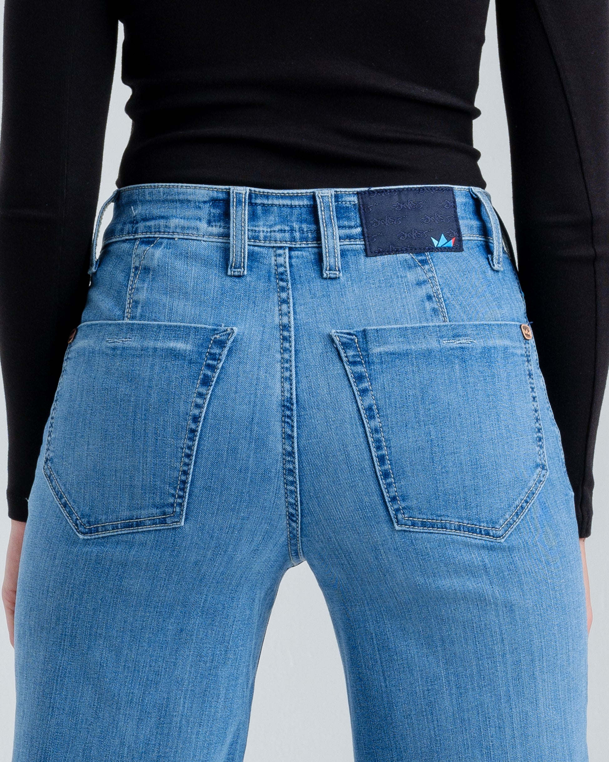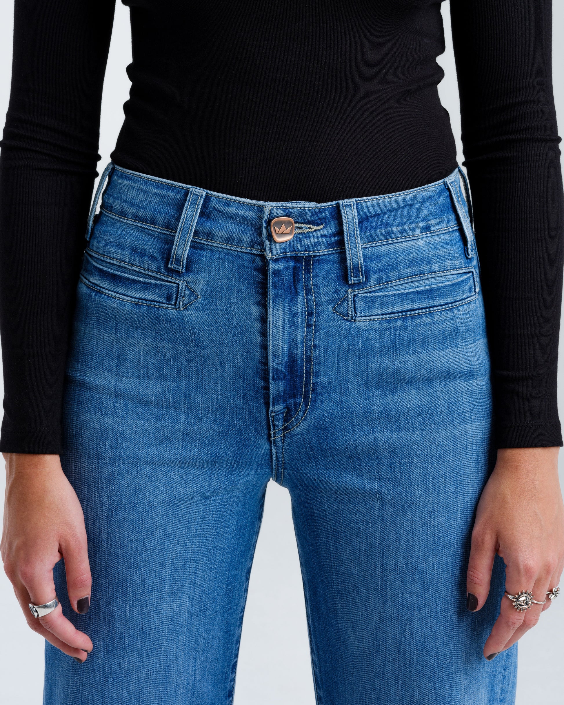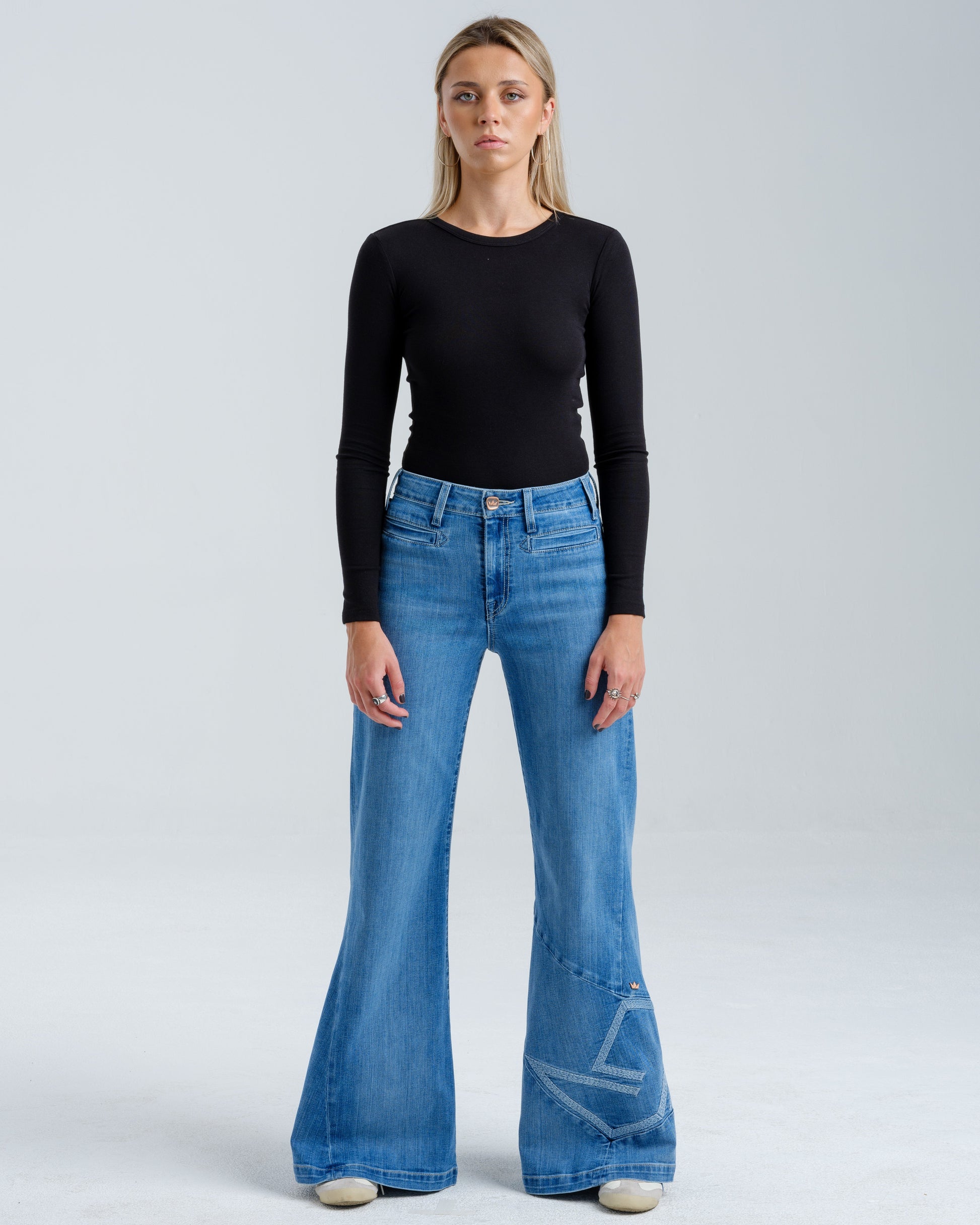 A bold high-rise, wide-flare jean blending vintage charm with modern sophistication. Crafted from soft stretch denim with S-Gene® technology and REPREVE® recycled yarns for a luxurious, comfortable fit. Features a high waist, front double welt pockets, and fashion darts at the back for a flattering shape. Geometric paneling and a unique cutout on the left leg showcase the new crown embroidery. Finished with contrast stitching, premium hardware, and an antique wash.
