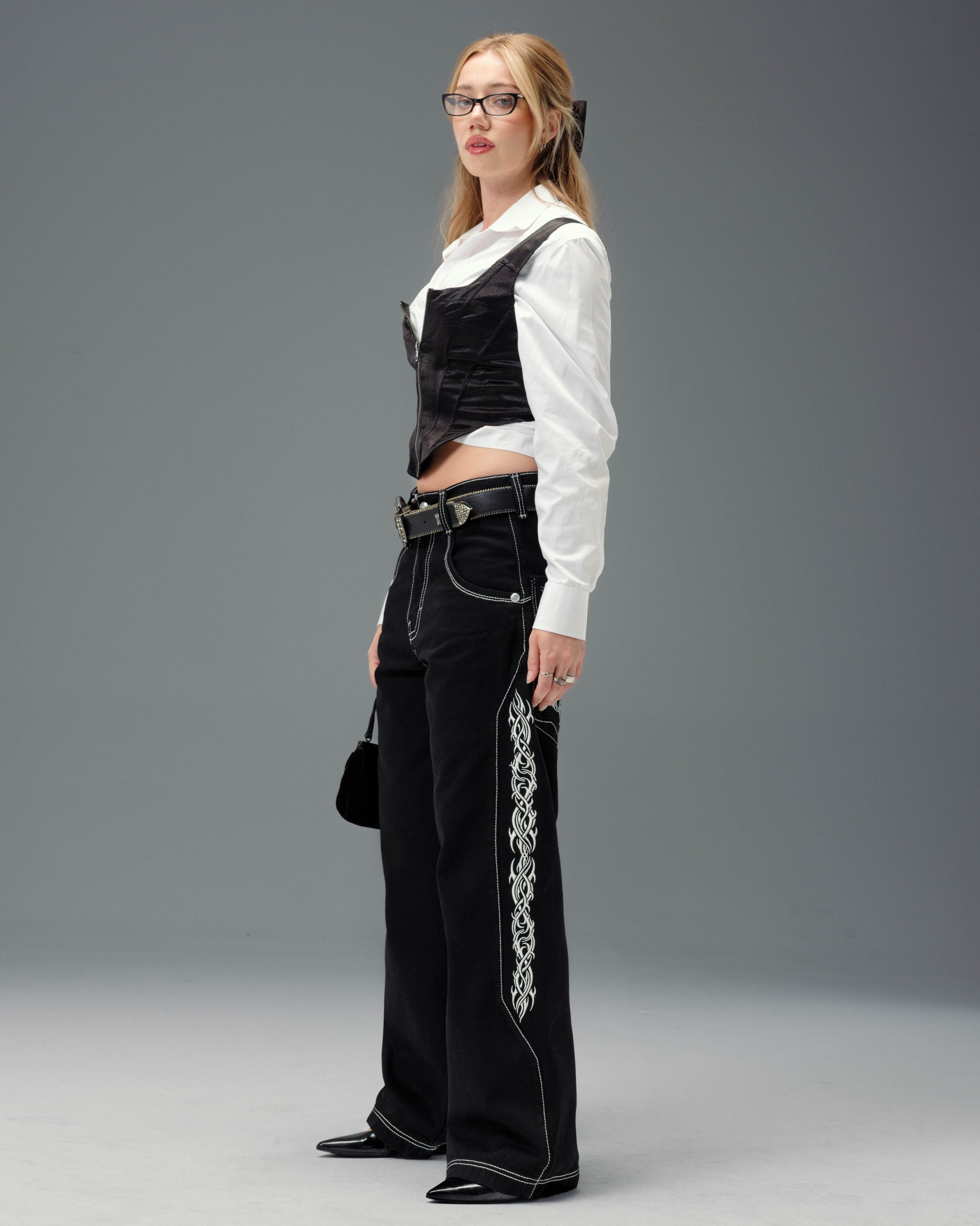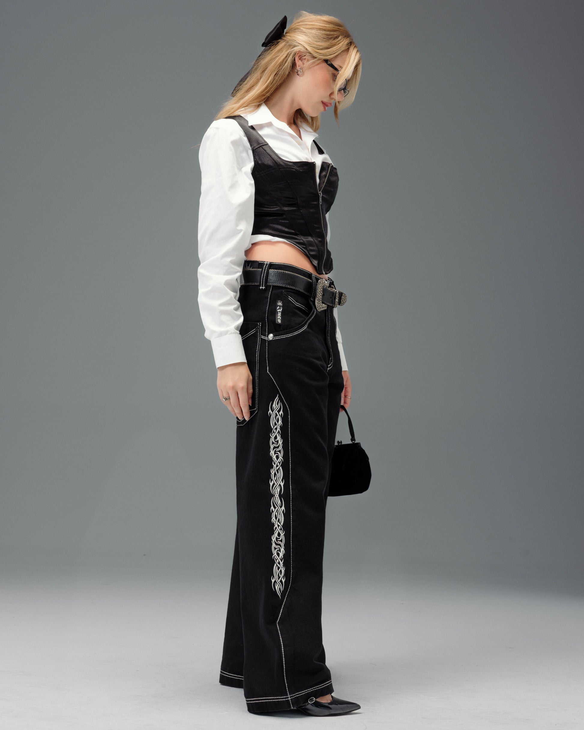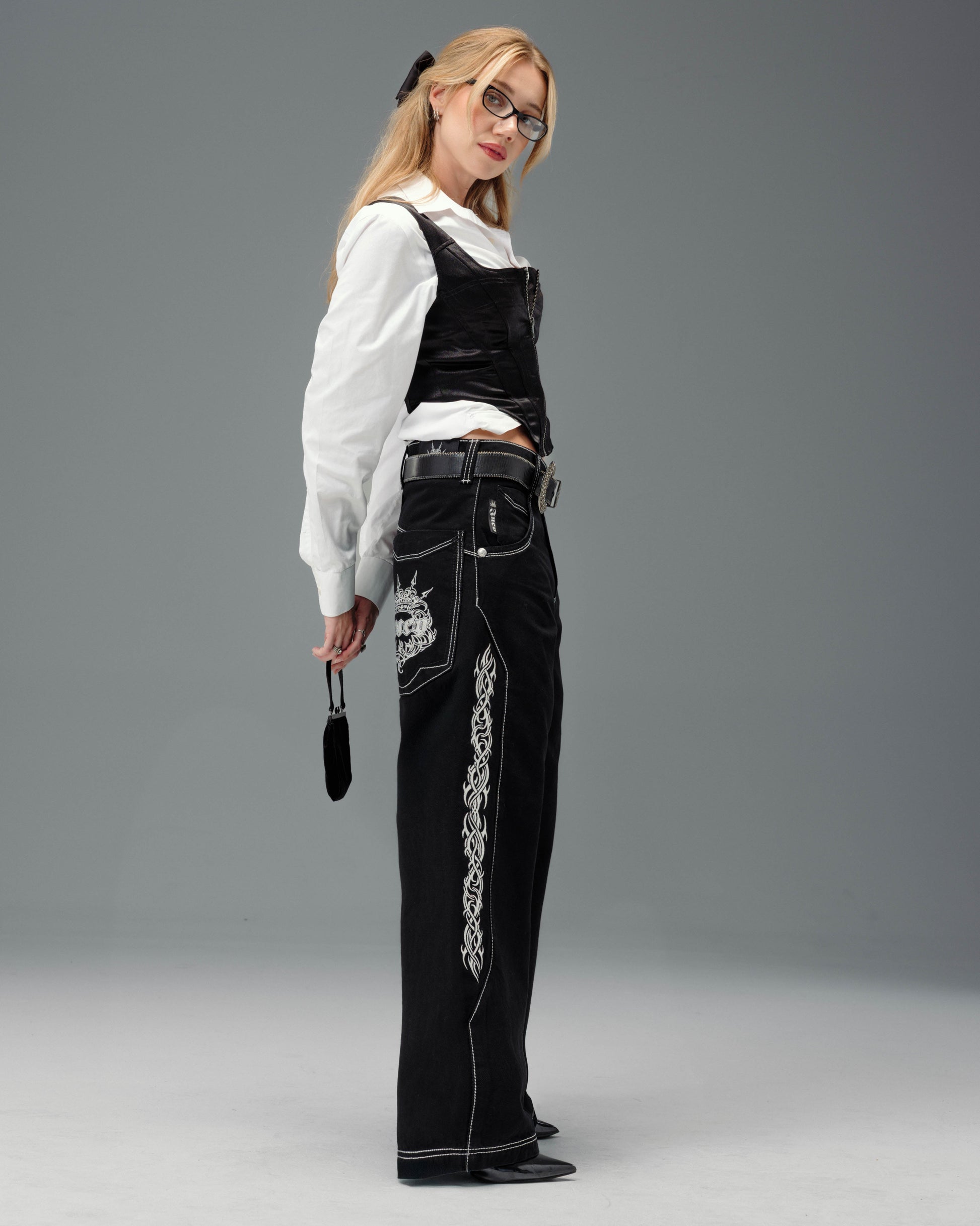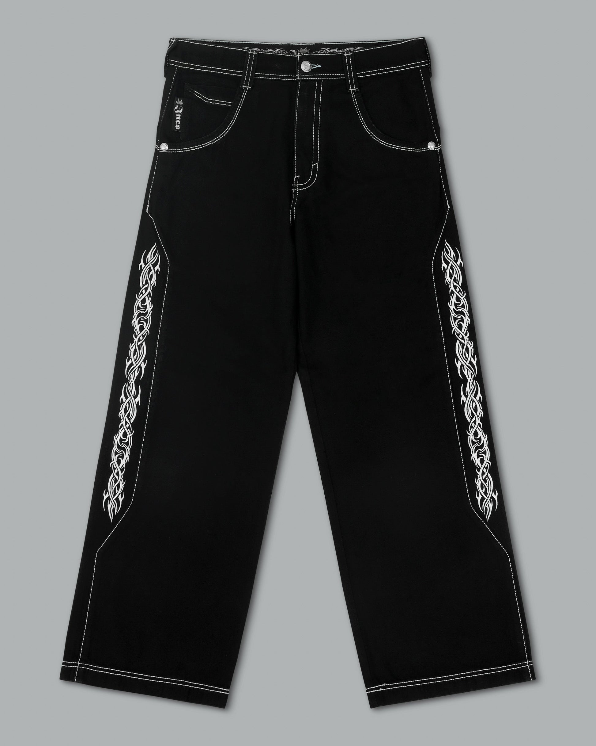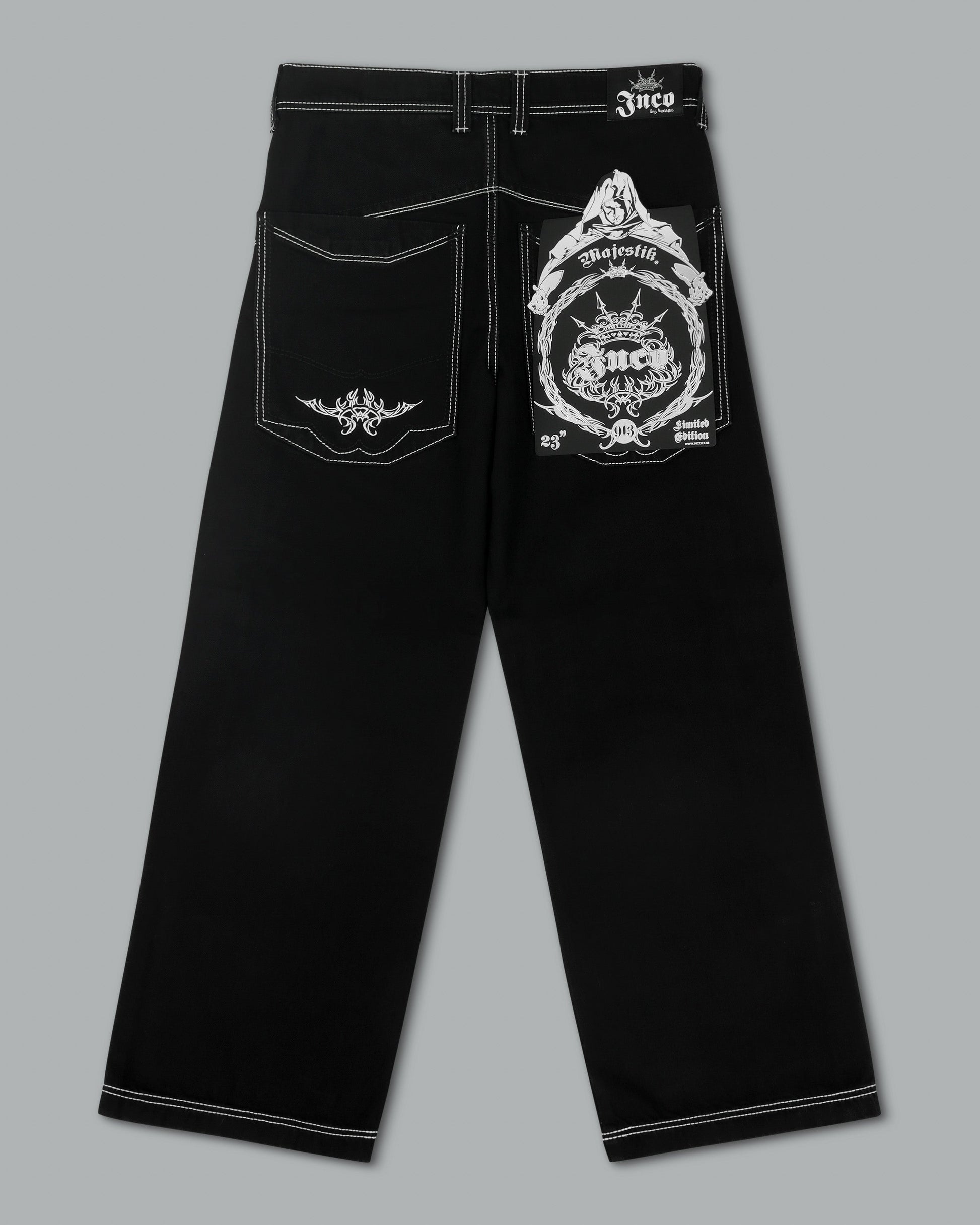 From the famous Tribal Collection. 13.5oz ring-spun denim in a sleek Jet Black wash with a structured, smooth silhouette. 23" bottom opening with contrast stitching and engineered side seams. Features over 120,000 embroidered stitches, including long vertical tribal graphics, Celtic-inspired logos on the back pockets, and heritage crown symbolism. Two-tone off-white and indigo thread adds depth to pocket details, reinforced with angled double stitching. Finished with premium custom hardware. Collectible flasher included.