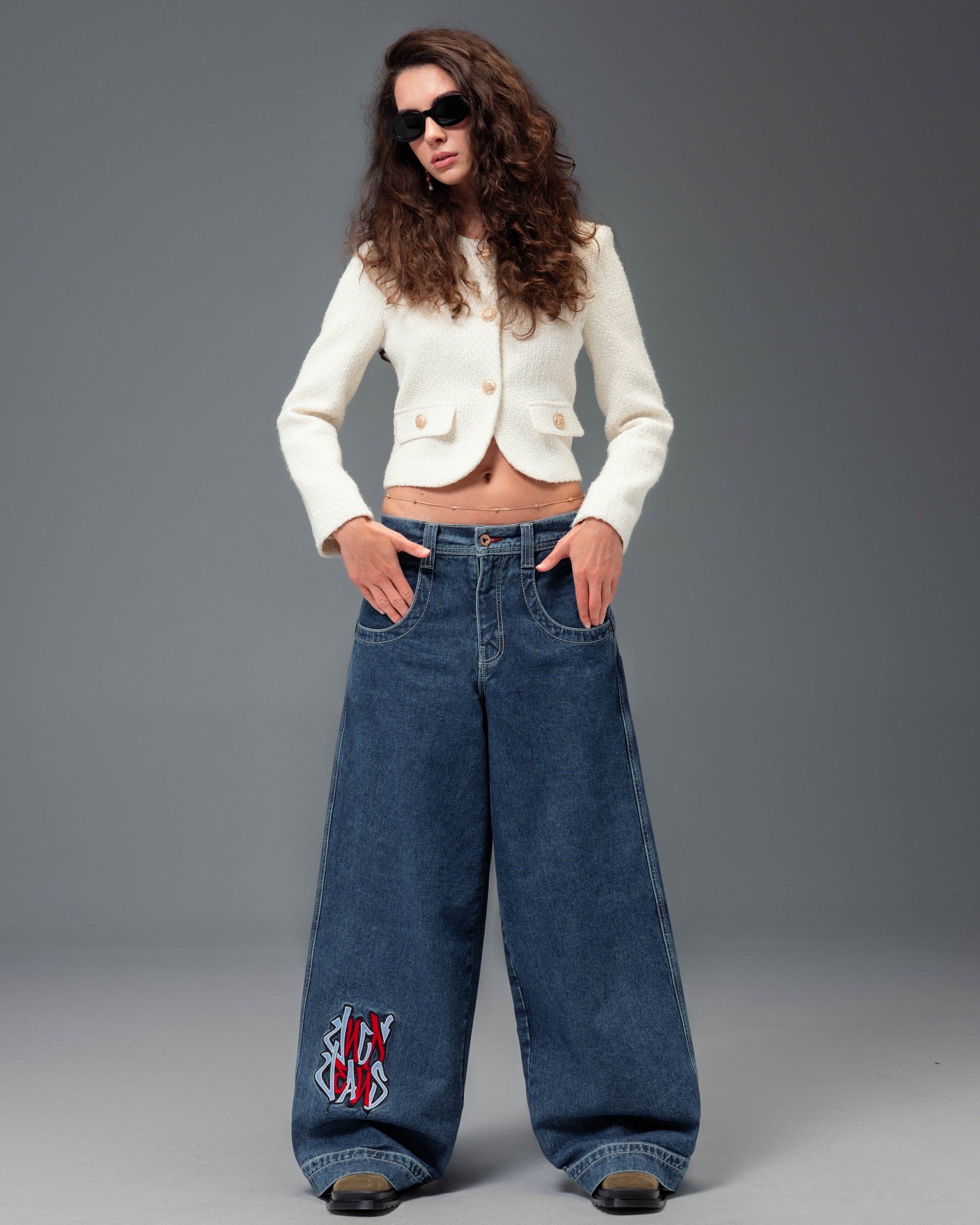 Collector’s item from the iconic JNCO Roots Collection. Dark Stone Wash, 14oz 100% cotton denim with a 3x1 left-hand weave. Classic 26" bottom opening and heavy double contrast stitching. Features “Rollin' Style 360” graffiti embroidery on front leg with nearly 78,000 stitches. Collectible Rollin' flasher included. Limited Edition – limited stock.