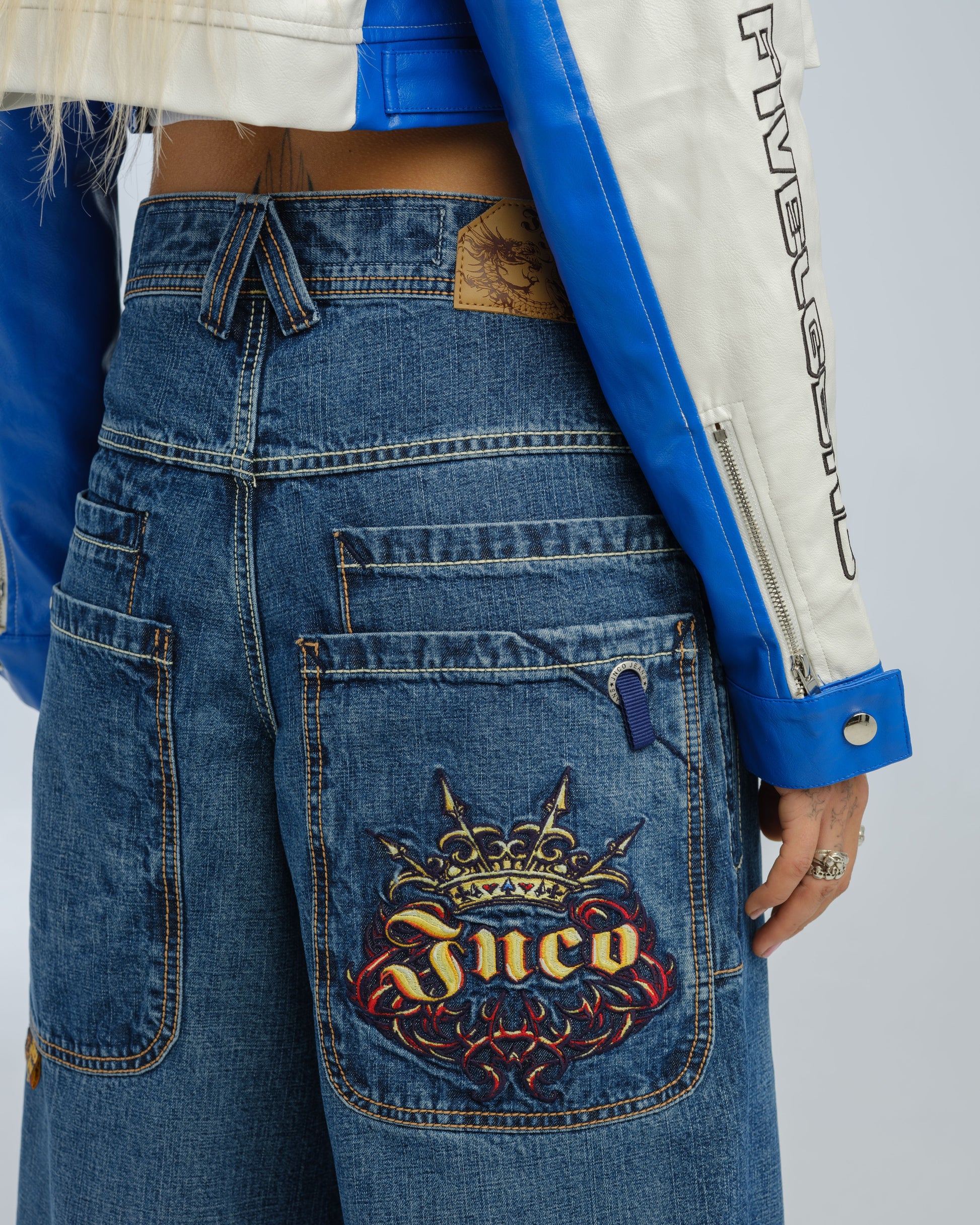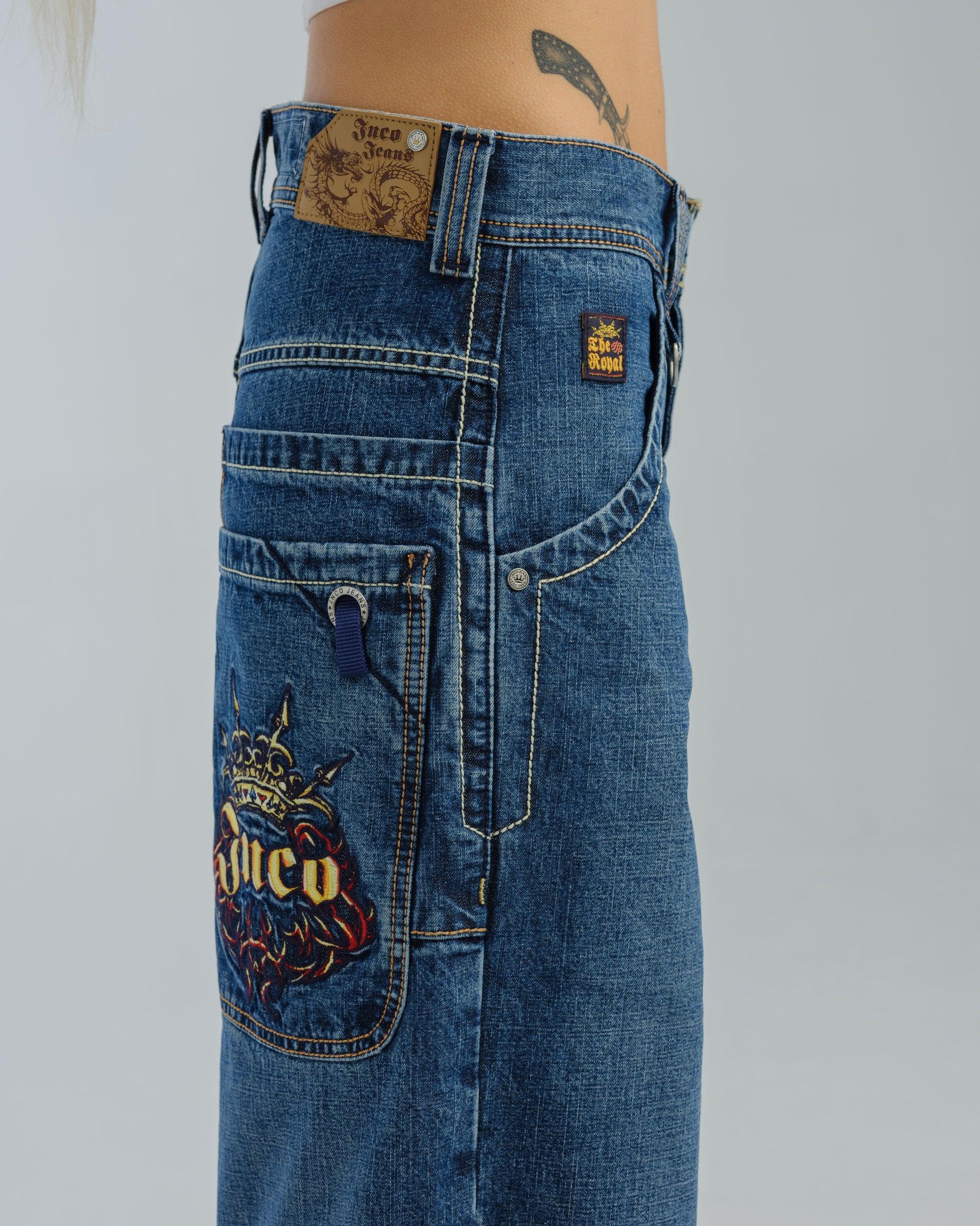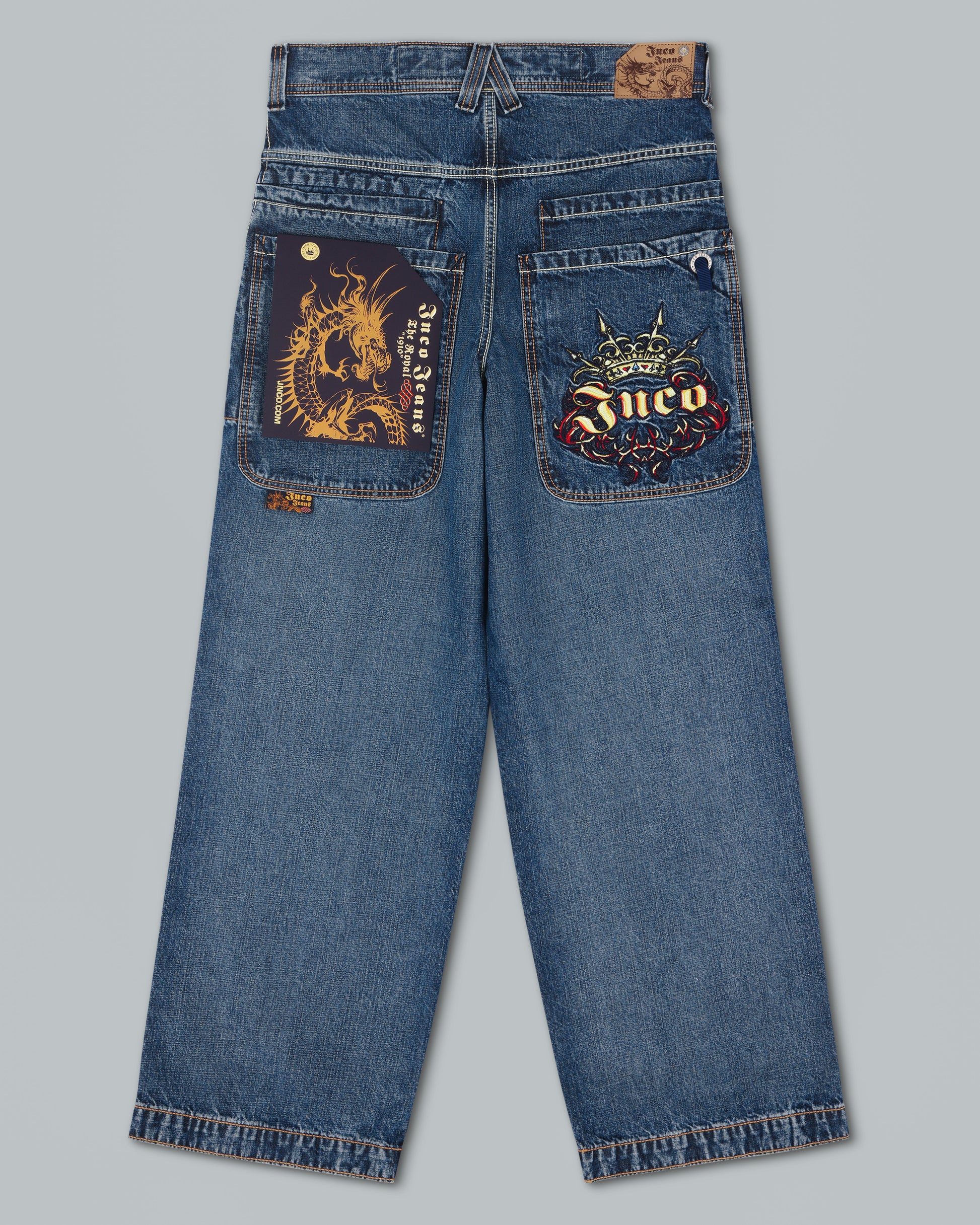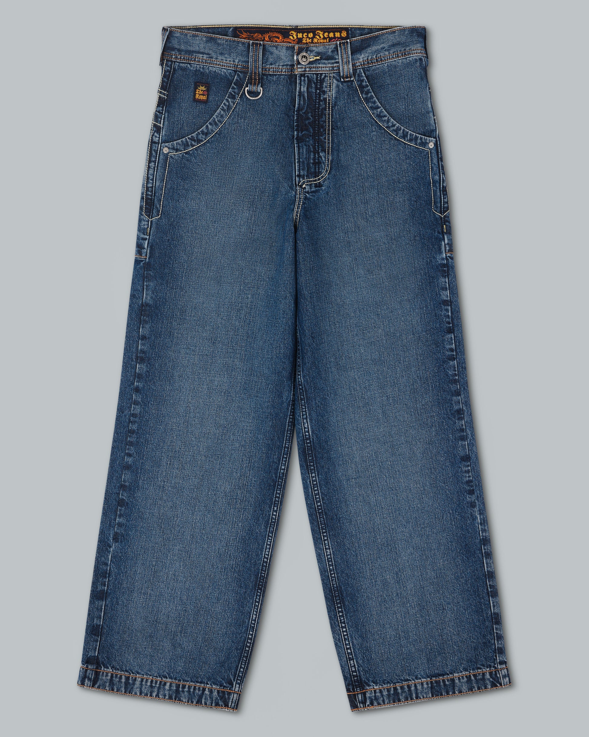 Collector’s item from JNCO’s workwear-inspired line. Hand-Sand Medium Dark Stone Wash, 23" bottom opening. 12.5oz 100% cotton cross-hatch denim with four-thread contrast stitching. 4 back pockets, “JNCO Jeans '85” dragon patch, crown plaque, and chain loops (chain not included). Original “JNCO Royal” embroidery with 80,000 stitches. Collectible matte and gloss flasher included. Limited Edition – very limited stock.