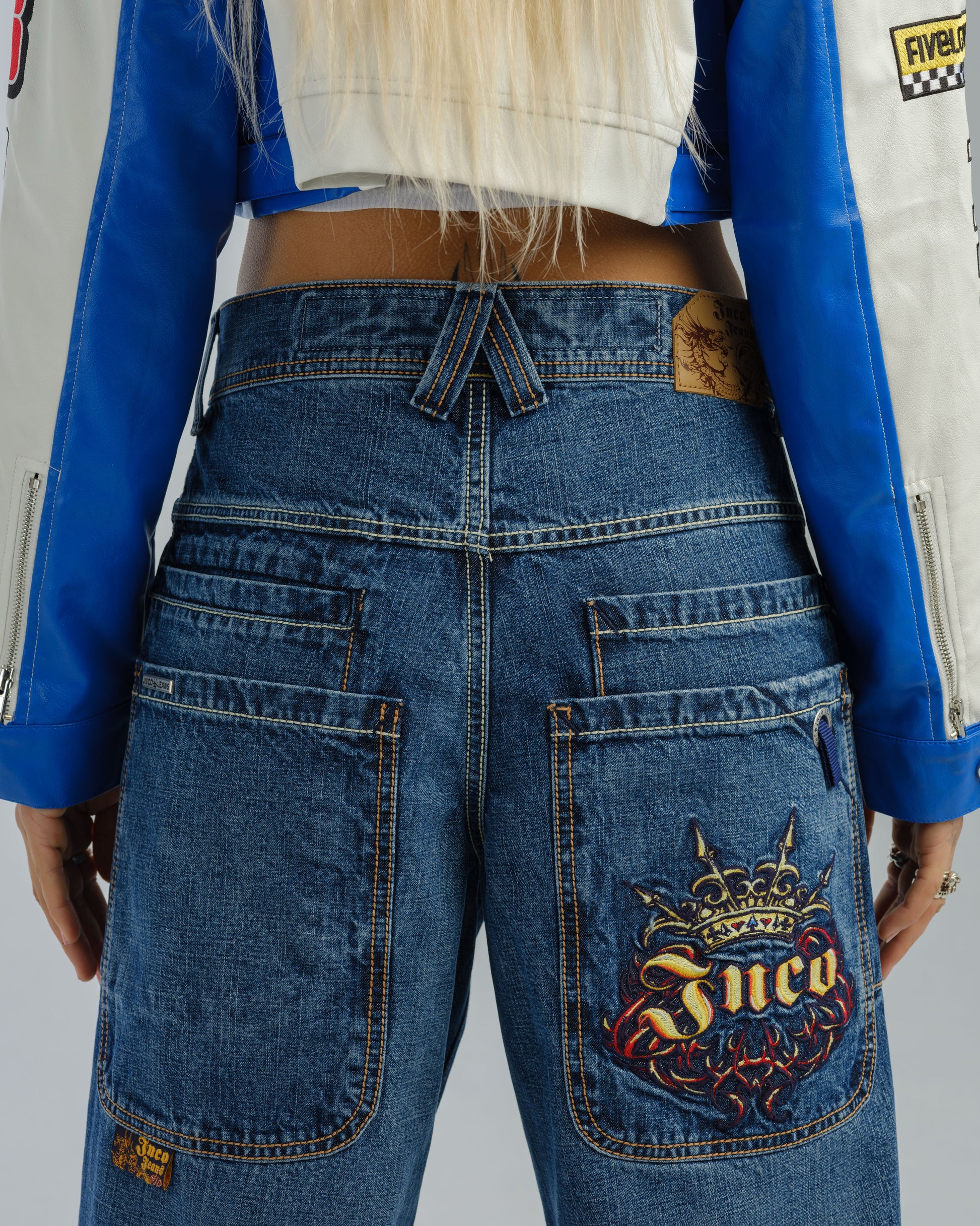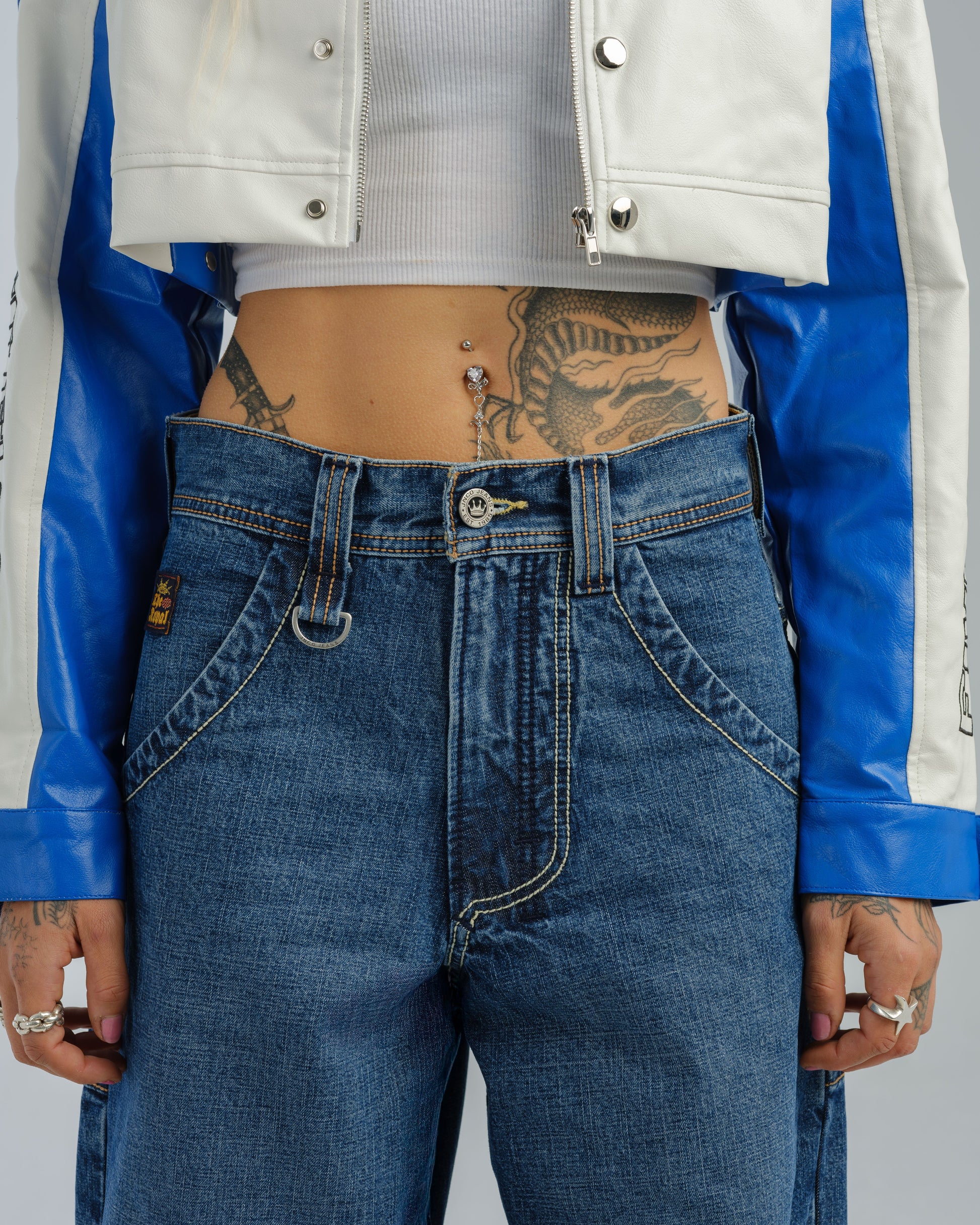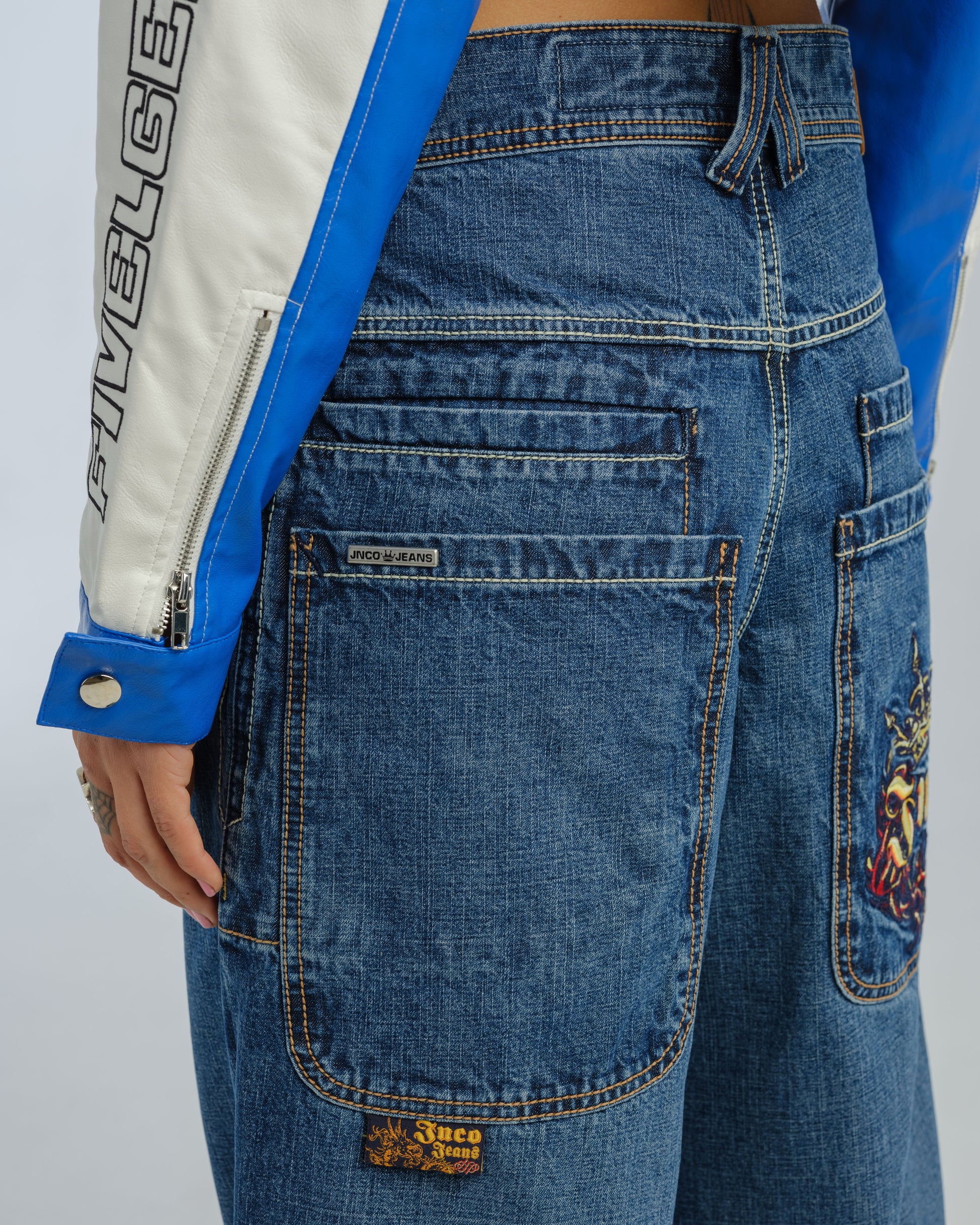 Collector’s item from JNCO’s workwear-inspired line. Hand-Sand Medium Dark Stone Wash, 23" bottom opening. 12.5oz 100% cotton cross-hatch denim with four-thread contrast stitching. 4 back pockets, “JNCO Jeans '85” dragon patch, crown plaque, and chain loops (chain not included). Original “JNCO Royal” embroidery with 80,000 stitches. Collectible matte and gloss flasher included. Limited Edition – very limited stock.