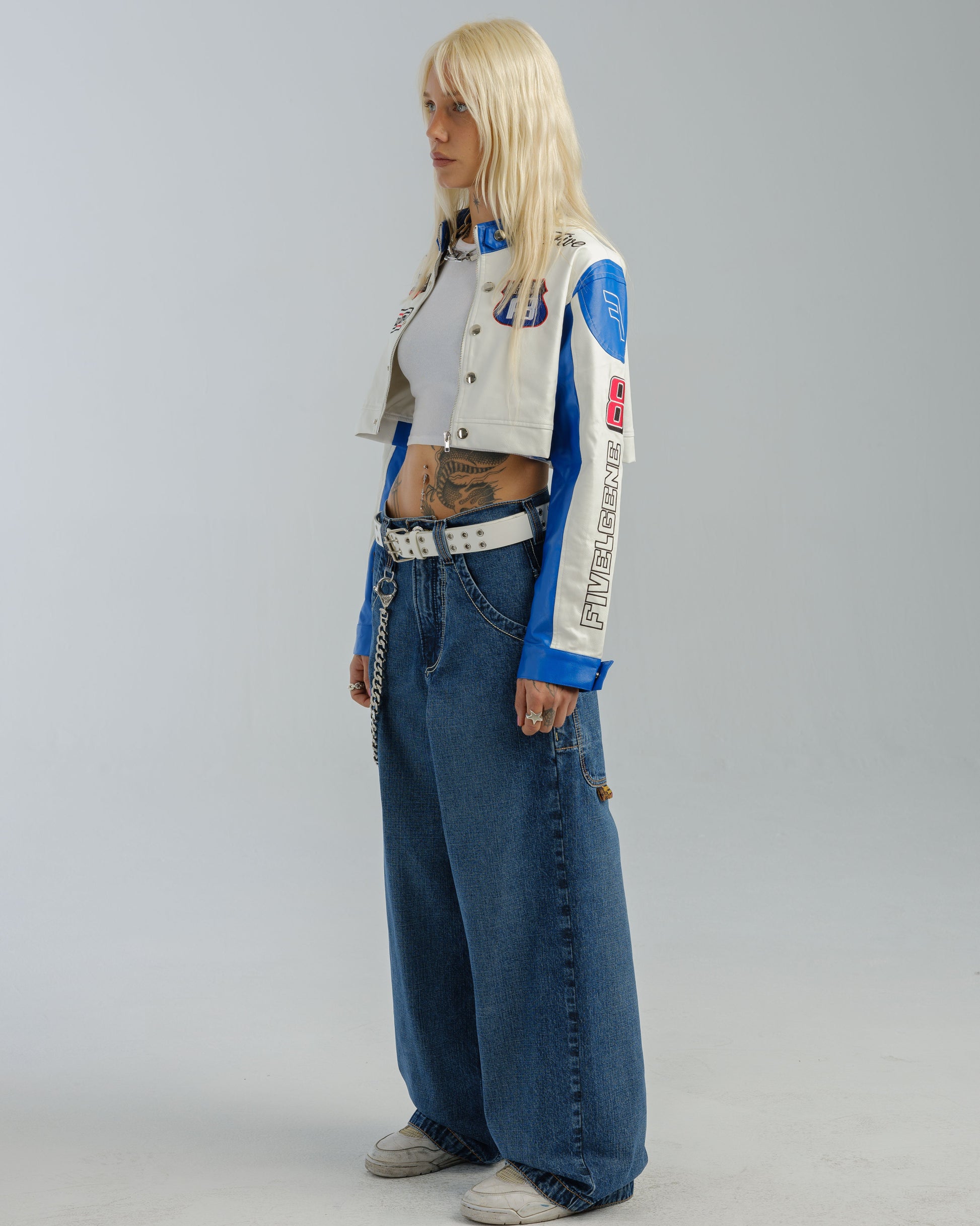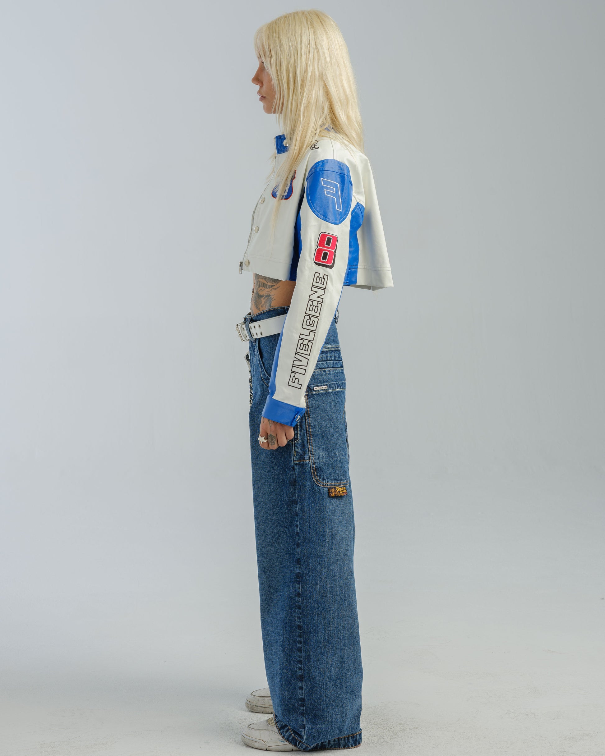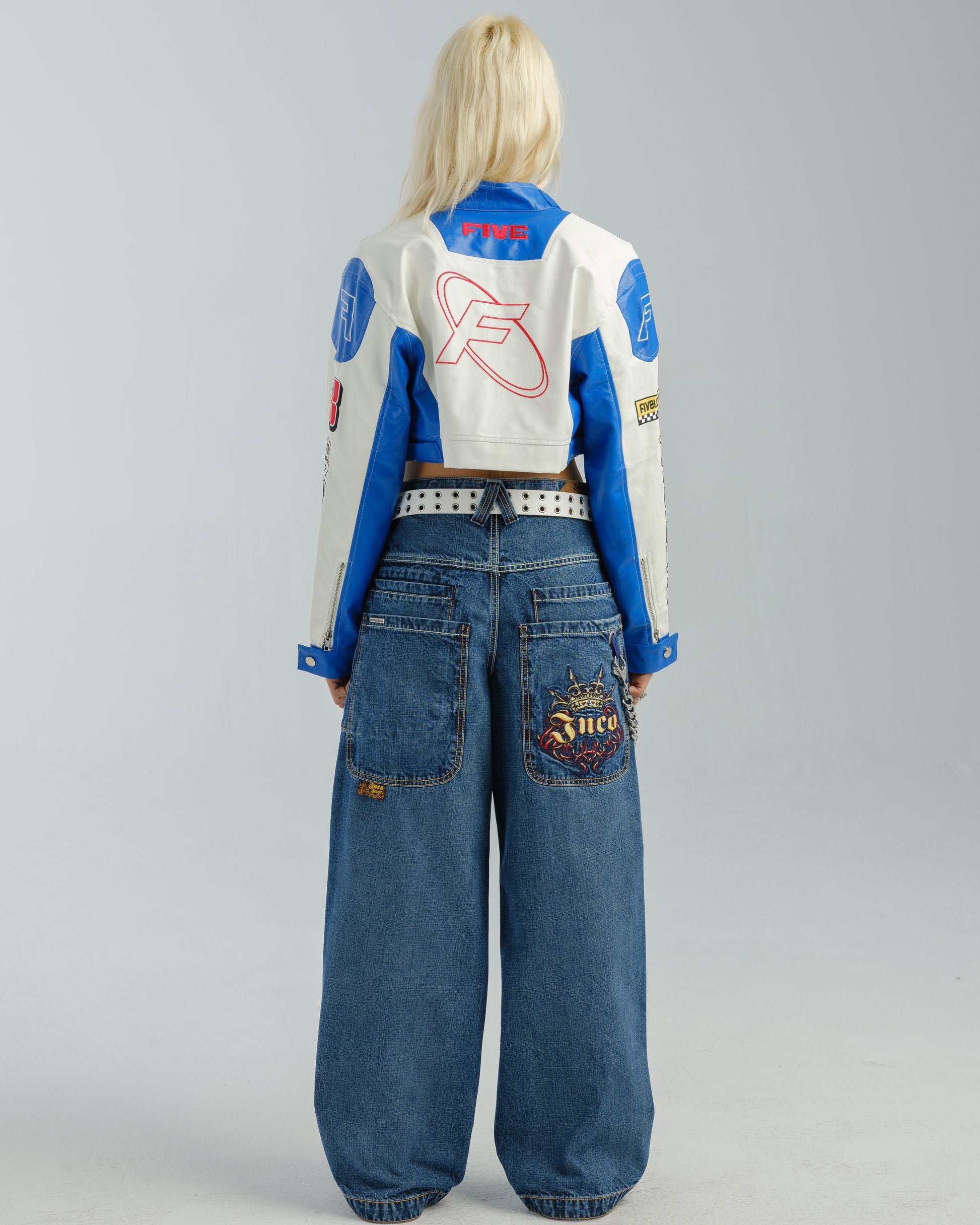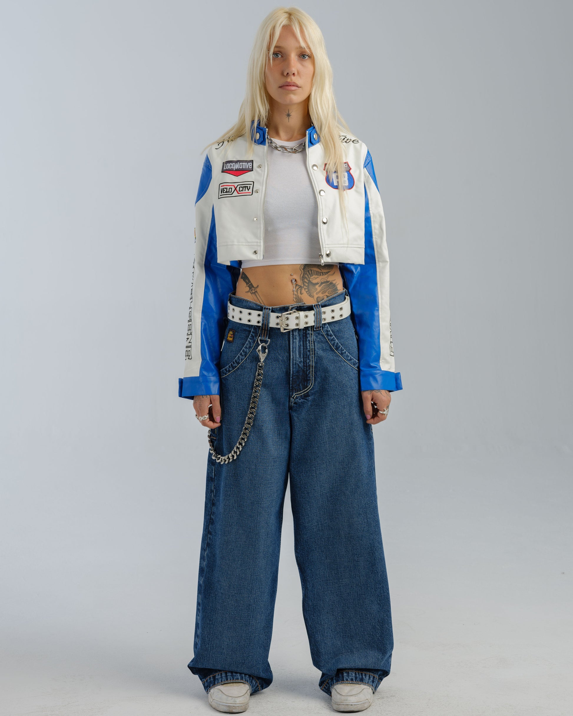 Collector’s item from JNCO’s workwear-inspired line. Hand-Sand Medium Dark Stone Wash, 23" bottom opening. 12.5oz 100% cotton cross-hatch denim with four-thread contrast stitching. 4 back pockets, “JNCO Jeans '85” dragon patch, crown plaque, and chain loops (chain not included). Original “JNCO Royal” embroidery with 80,000 stitches. Collectible matte and gloss flasher included. Limited Edition – very limited stock.
