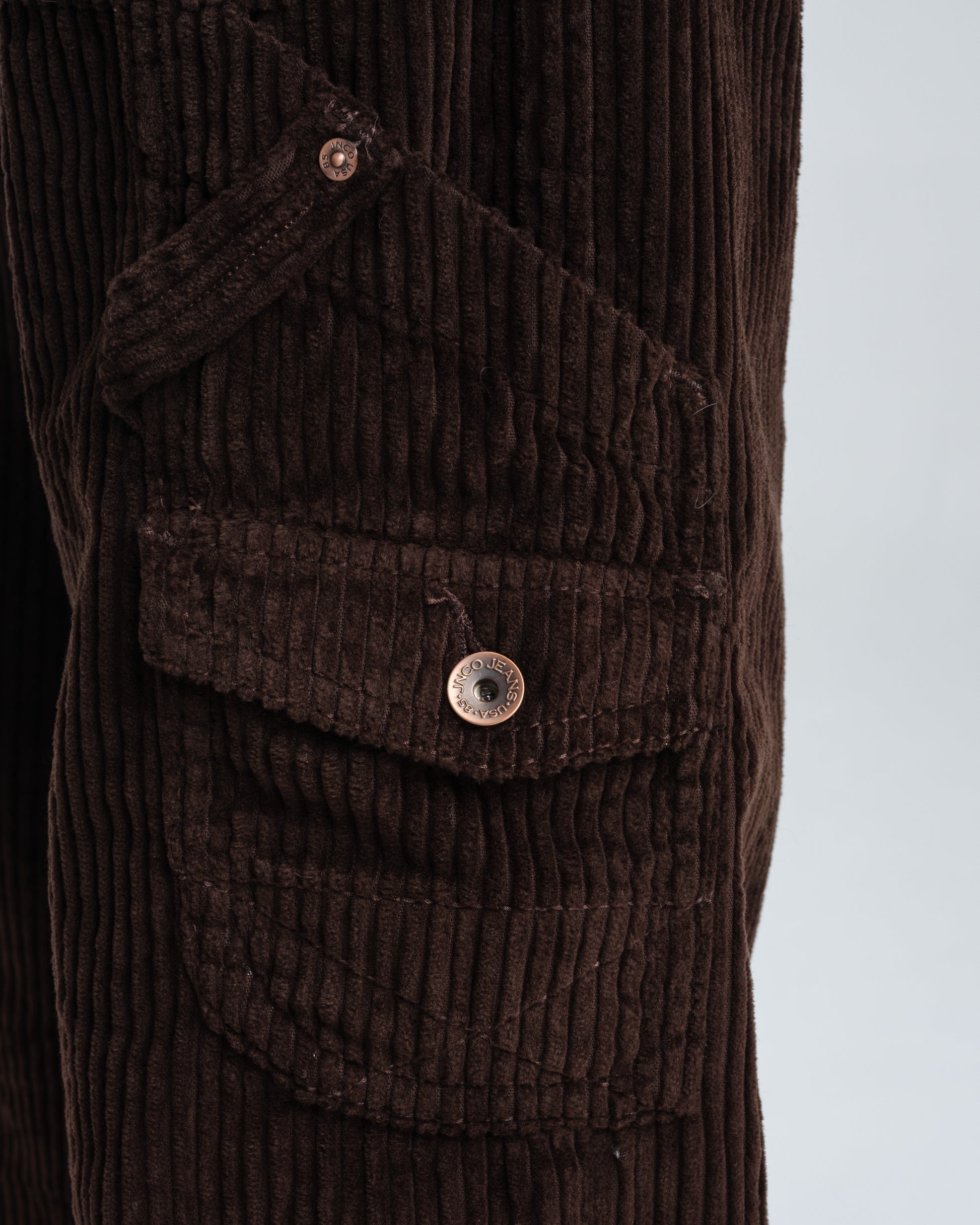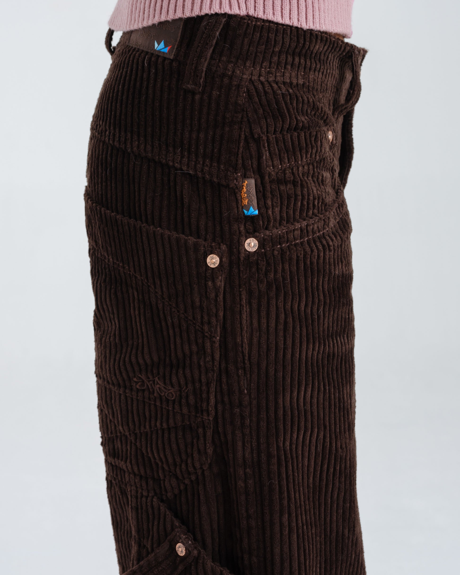 A modern twist on a classic workwear staple. 12oz 100% 4-Wale Corduroy in rich Java Brown. 23" stove-pipe bottom opening with a relaxed, wide-leg fit. Features a signature carpenter pocket and asymmetrical cargo pocket, and vintage-inspired details like angled front pockets, a hand-watch pocket, and oversized back patch pockets with mitered corners and “X” stitching. Finished with tonal stitching, reinforced utility belt loops, and premium hardware.