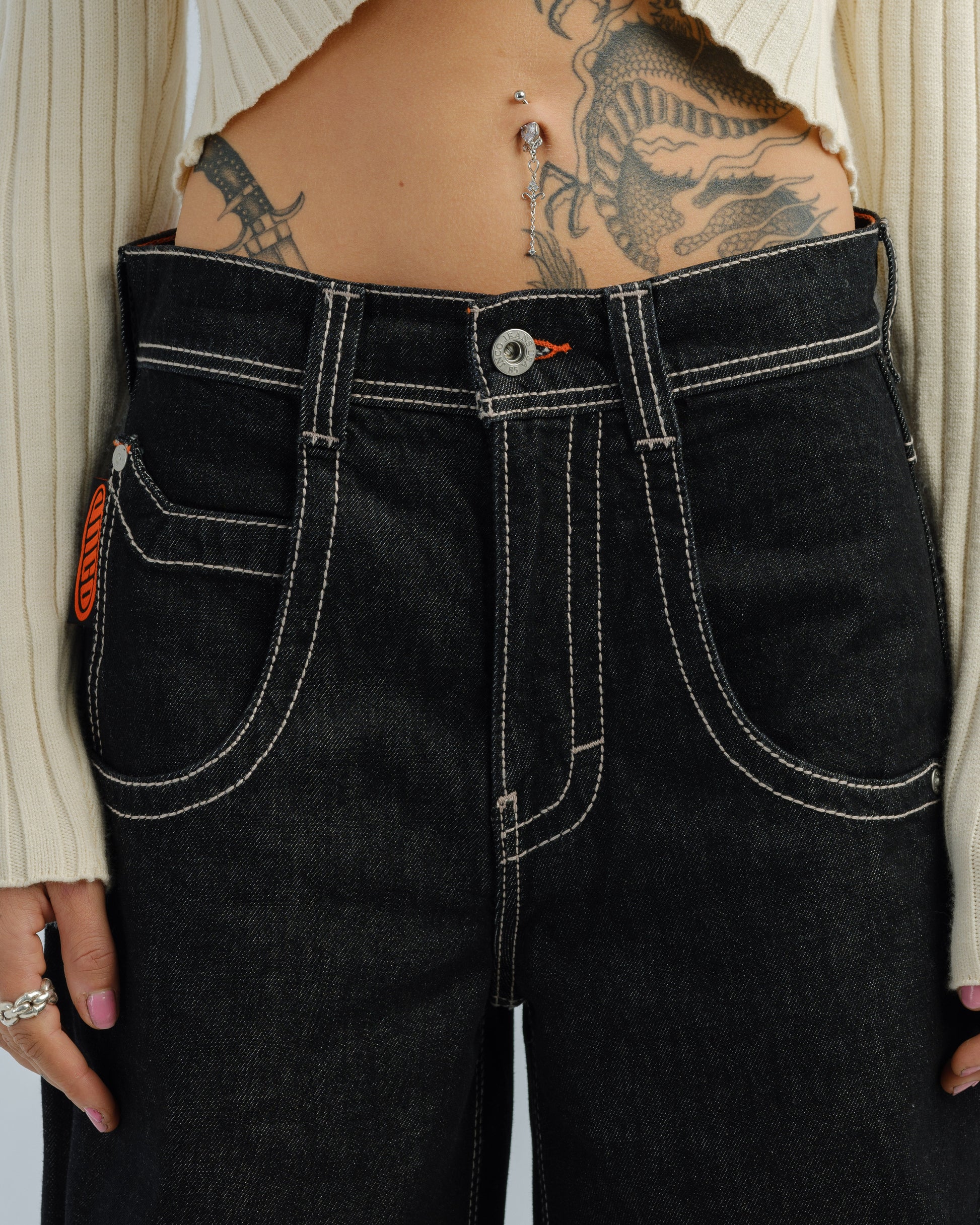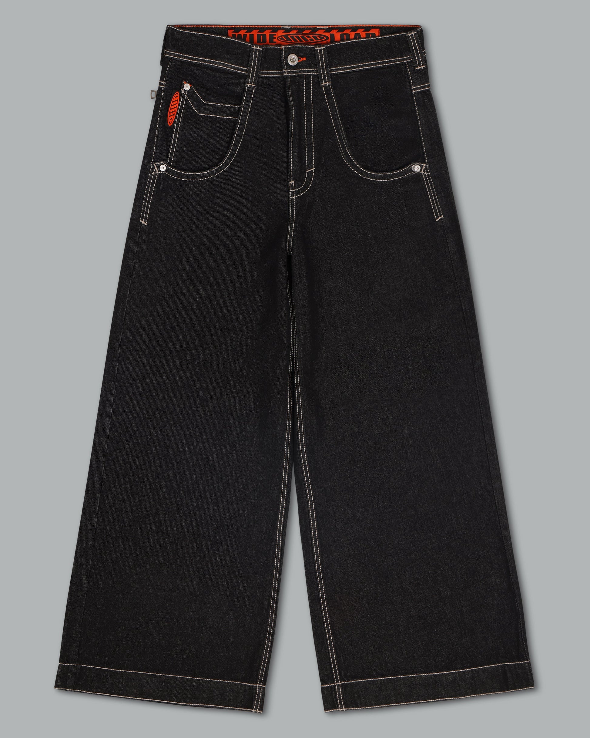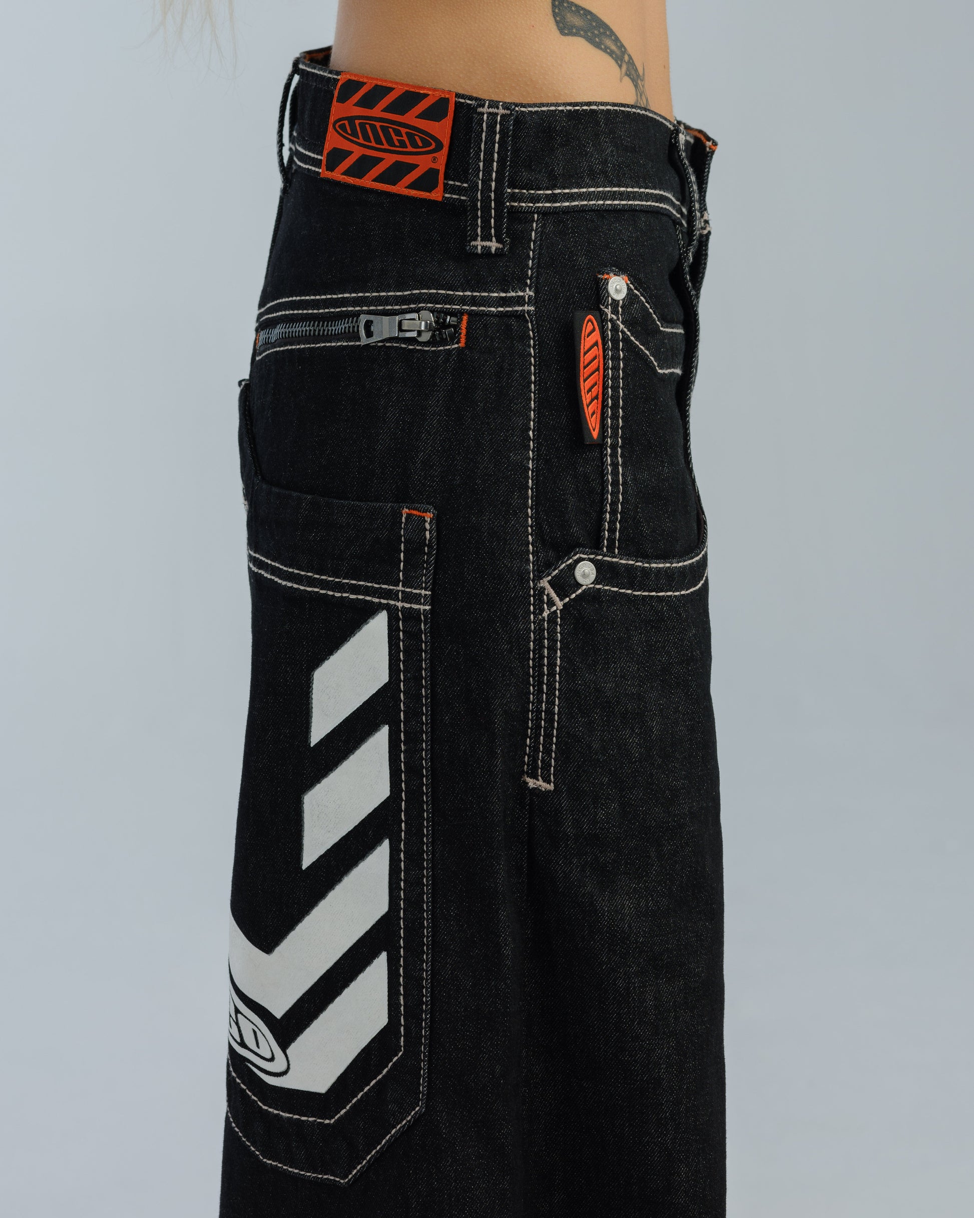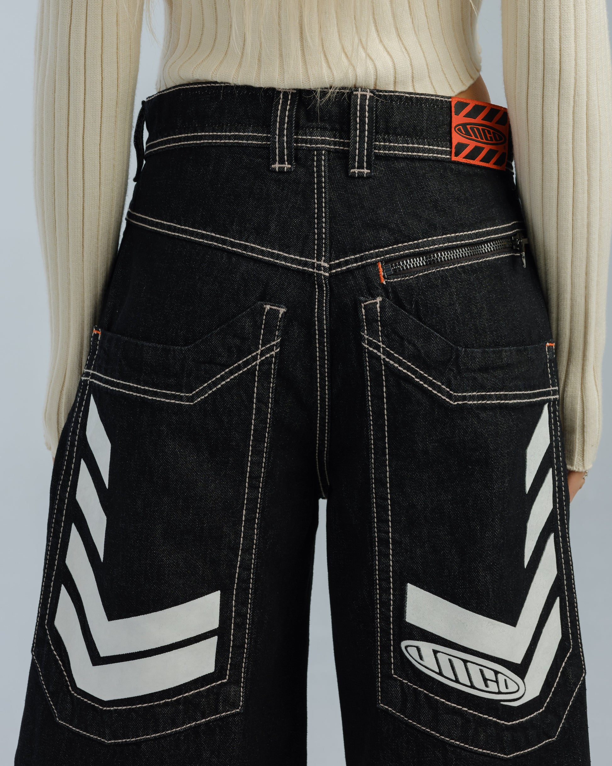 One-of-a-kind collector’s piece in Laser Black with White Warp. 30" bottom opening, 100% cotton rope-dyed denim with a luxe wax finish. Features glow-in-the-dark JNCO caution print on elongated back pocket—charge in sunlight to activate. Orange zipper and stitching, and back yoke zipper pocket. Includes extra-long collectible hangtag sticker. Old School Edition – Tested to Meet Needs.