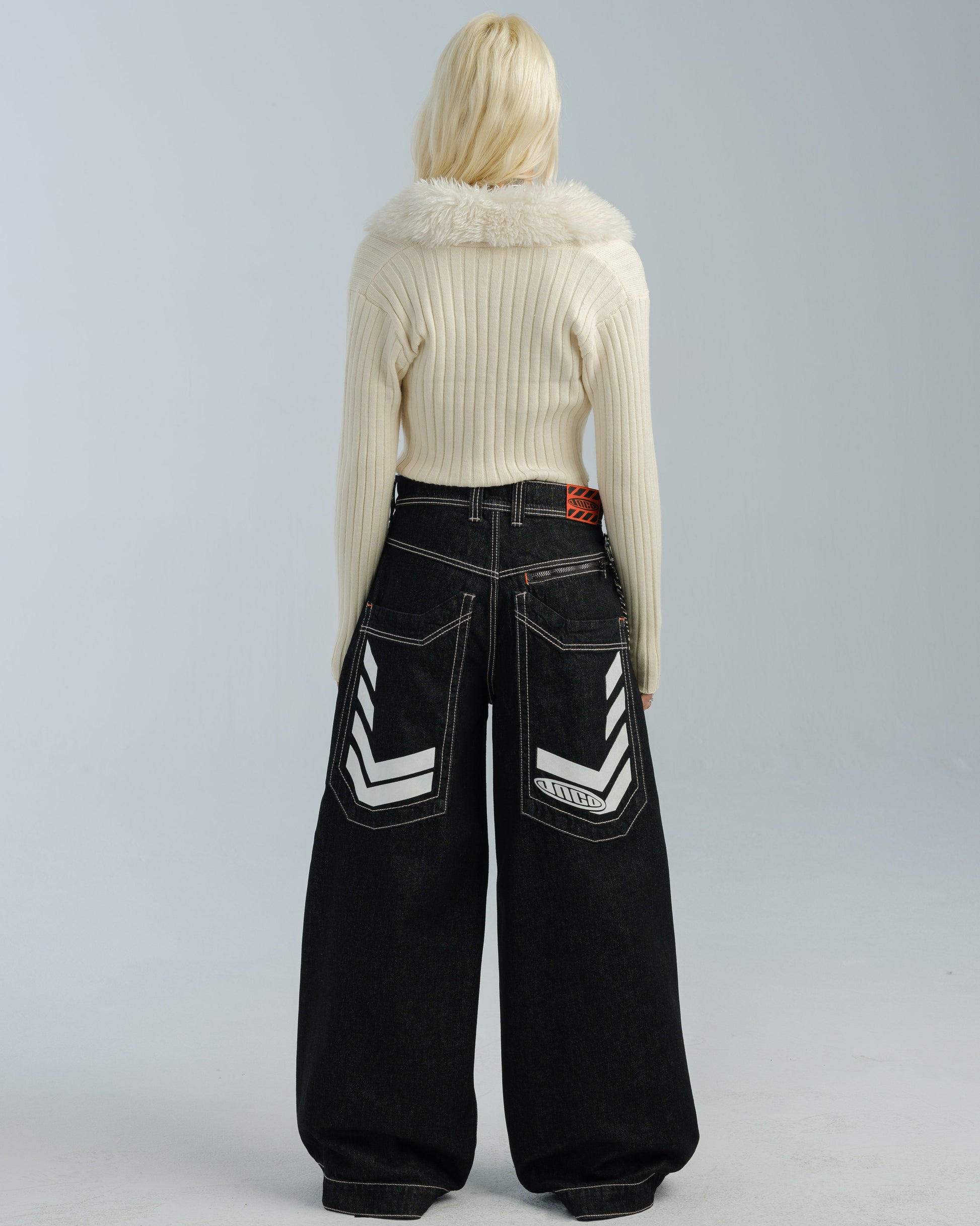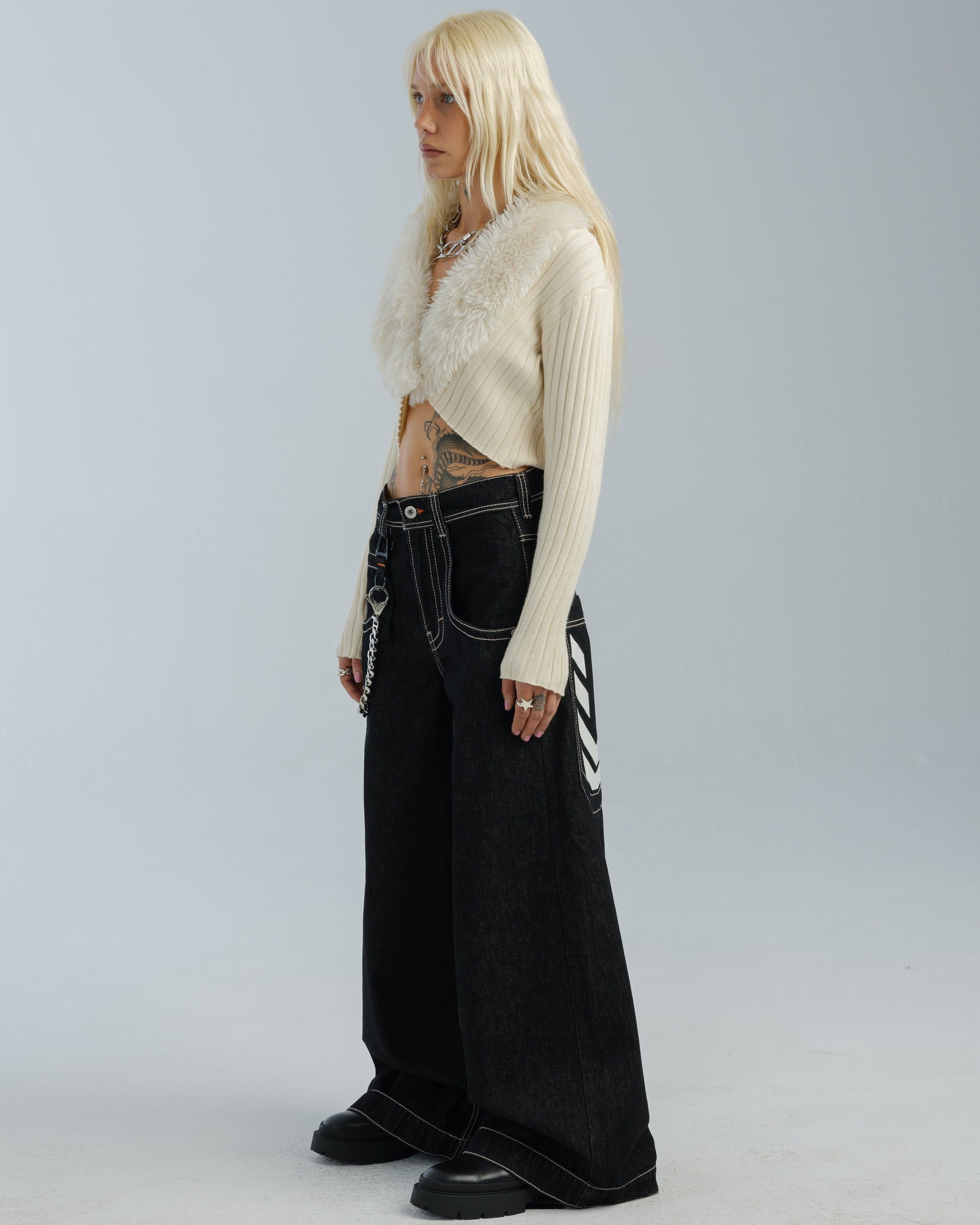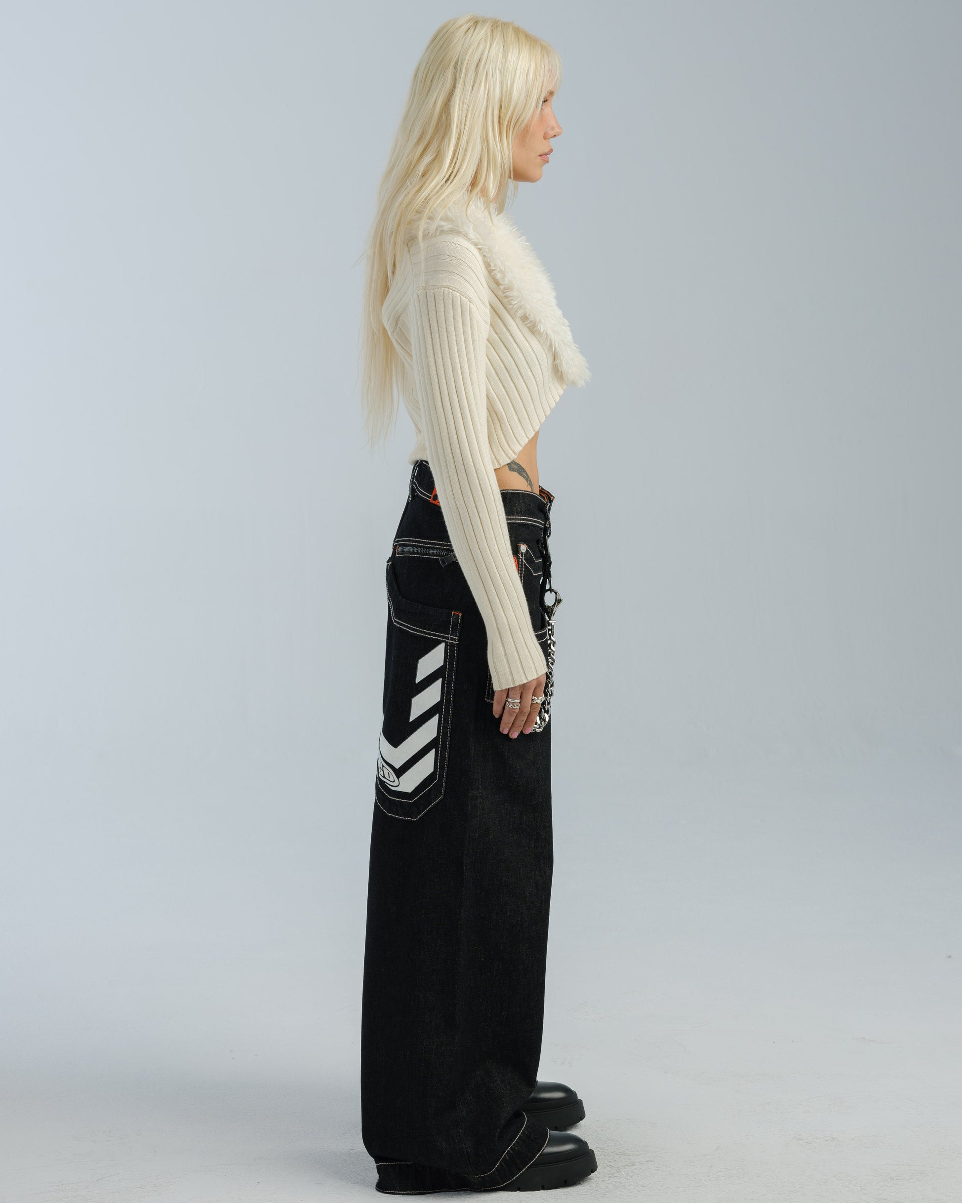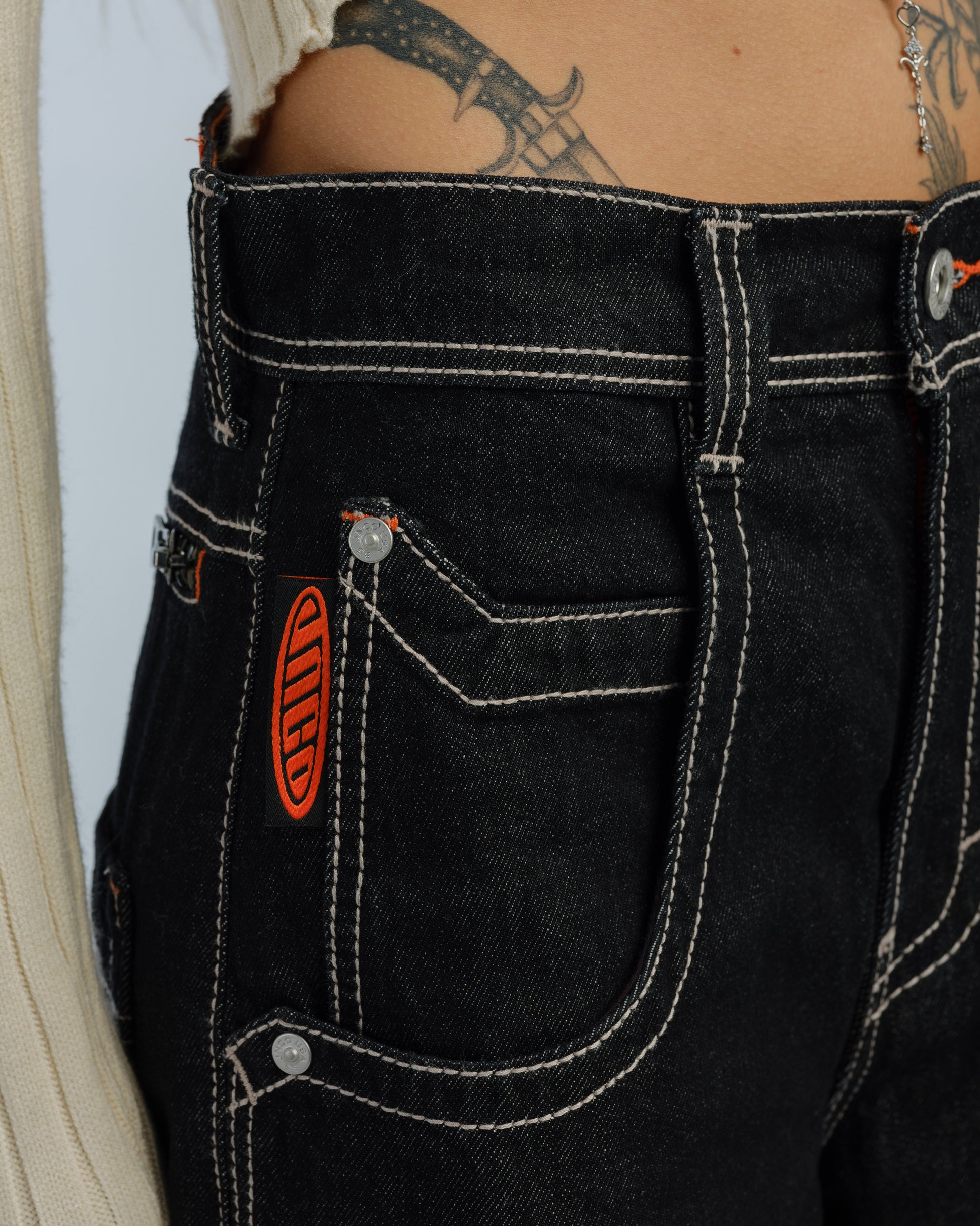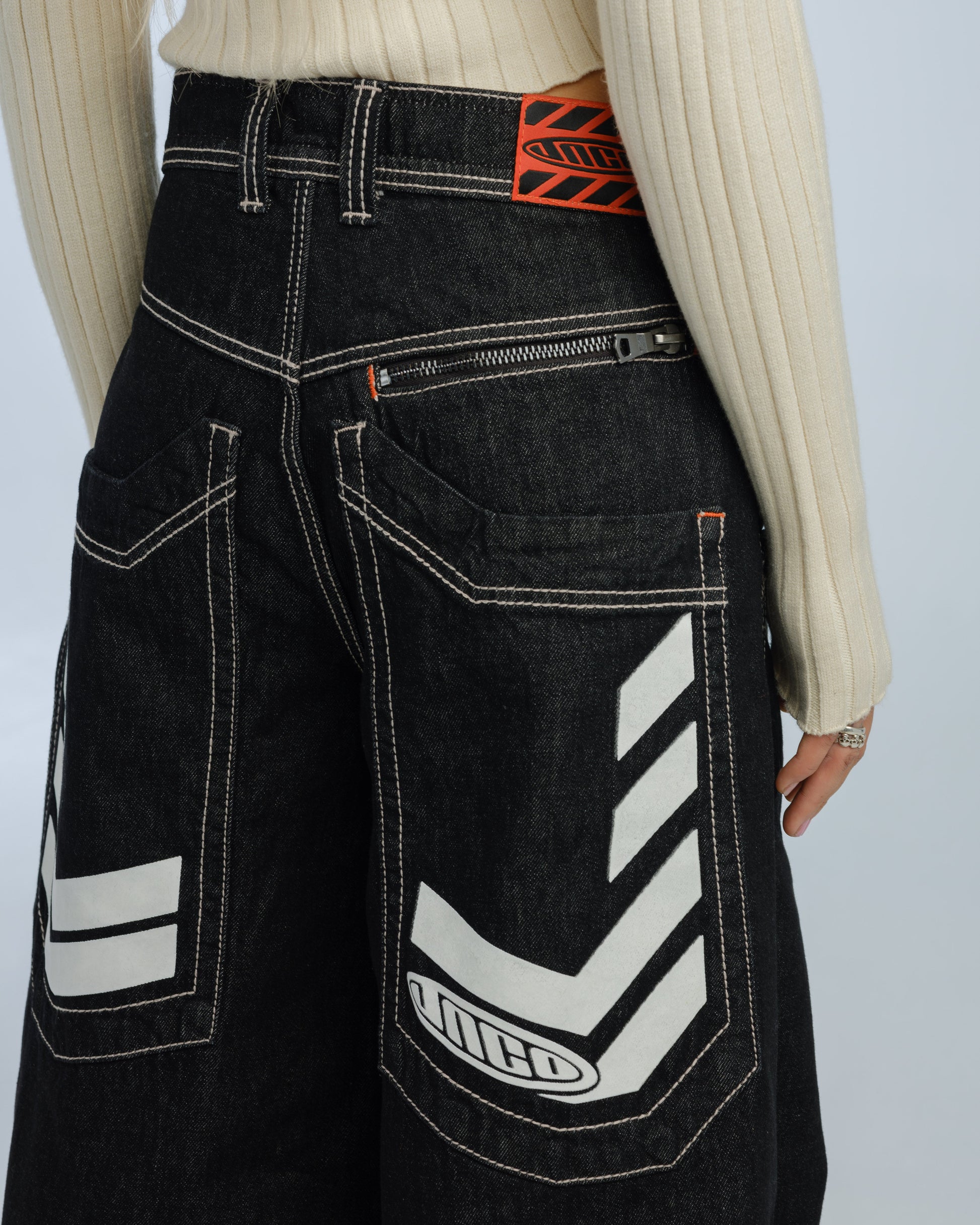 One-of-a-kind collector’s piece in Laser Black with White Warp. 30" bottom opening, 100% cotton rope-dyed denim with a luxe wax finish. Features glow-in-the-dark JNCO caution print on elongated back pocket—charge in sunlight to activate. Orange zipper and stitching, and back yoke zipper pocket. Includes extra-long collectible hangtag sticker. Old School Edition – Tested to Meet Needs.