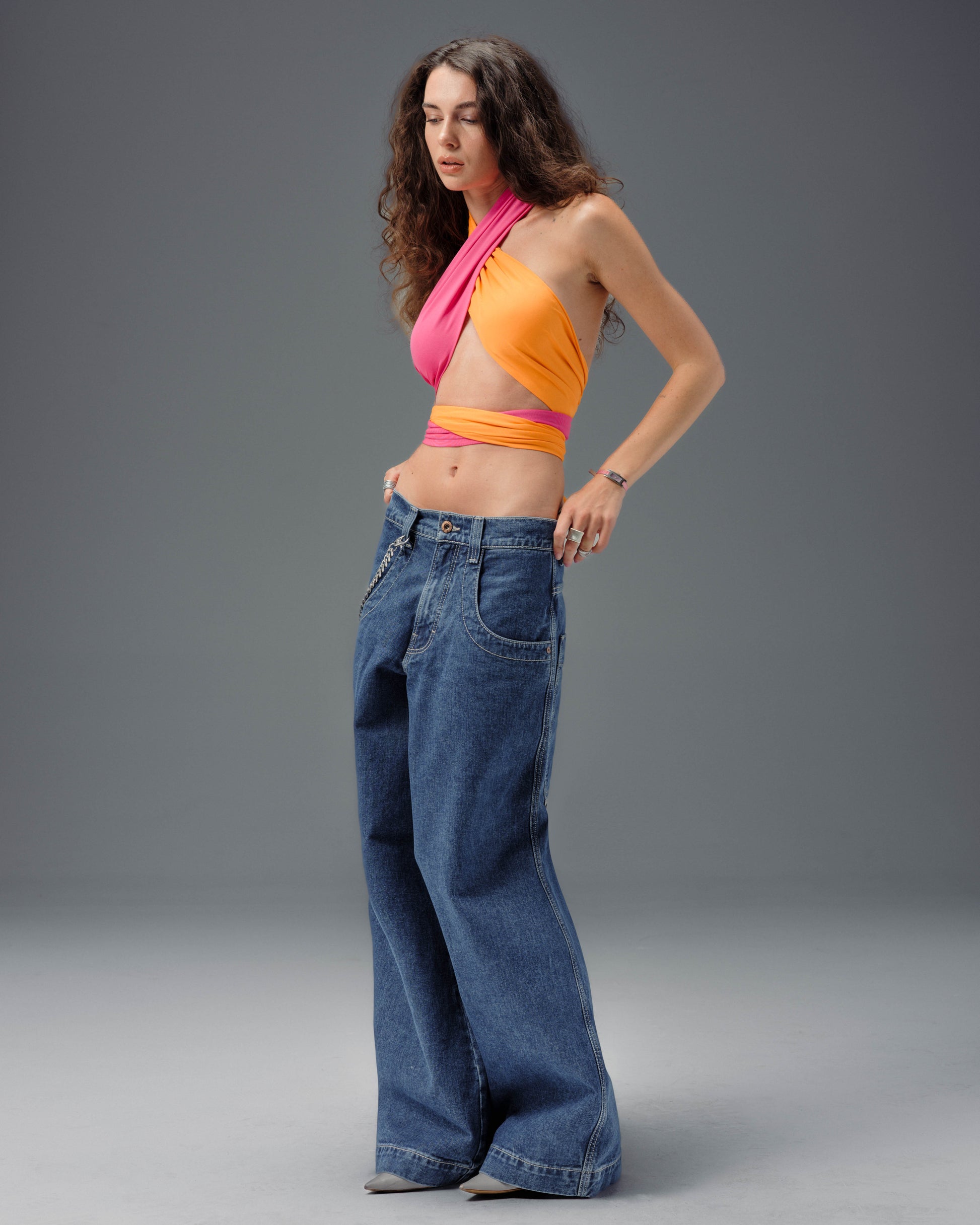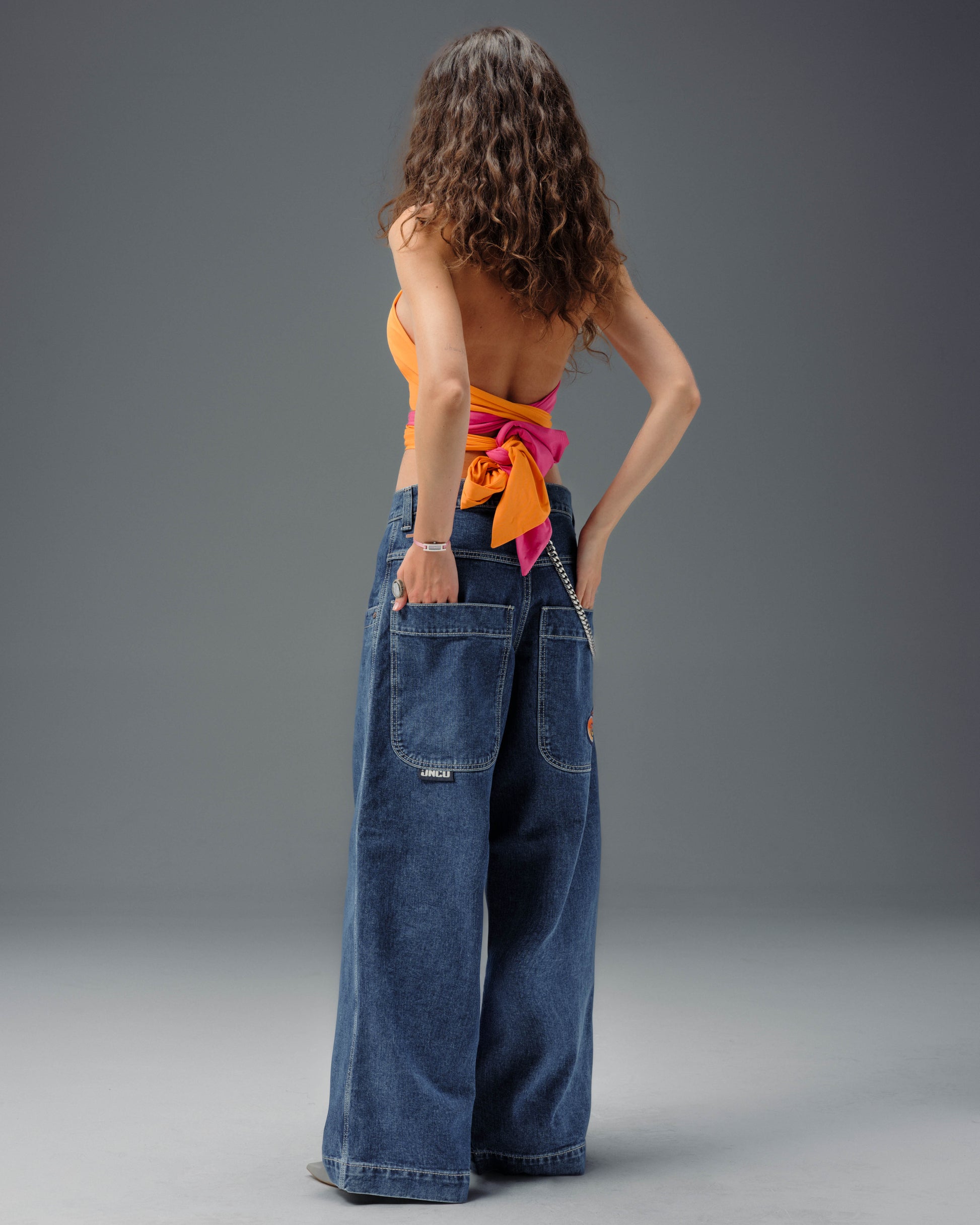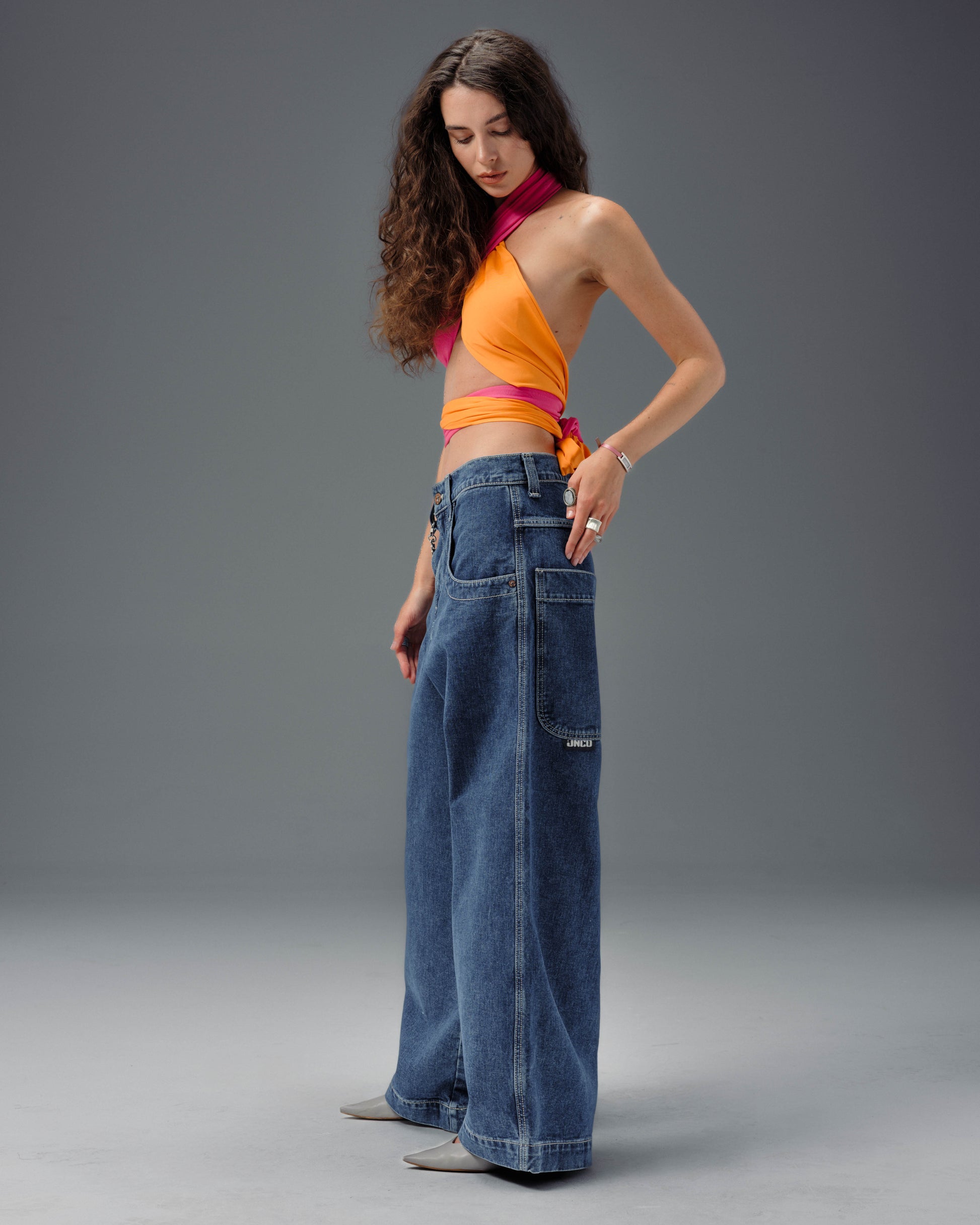A JNCO classic in Original Dark Stone Wash. 26" bottom opening with wide double-stitched scoop and back pockets. 14oz 100% cotton denim with a 3x1 left-hand weave and contrast stitching. Includes original artwork, labels, and swivel J embroidery on back pocket. Collectible flasher included.