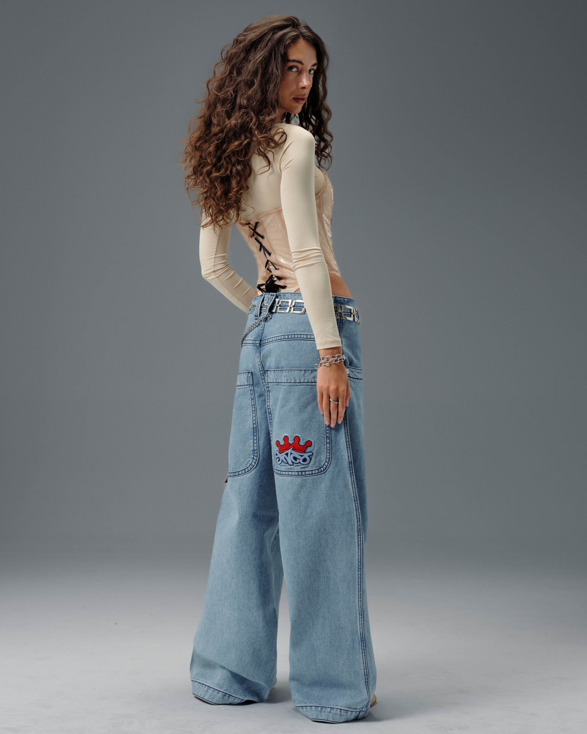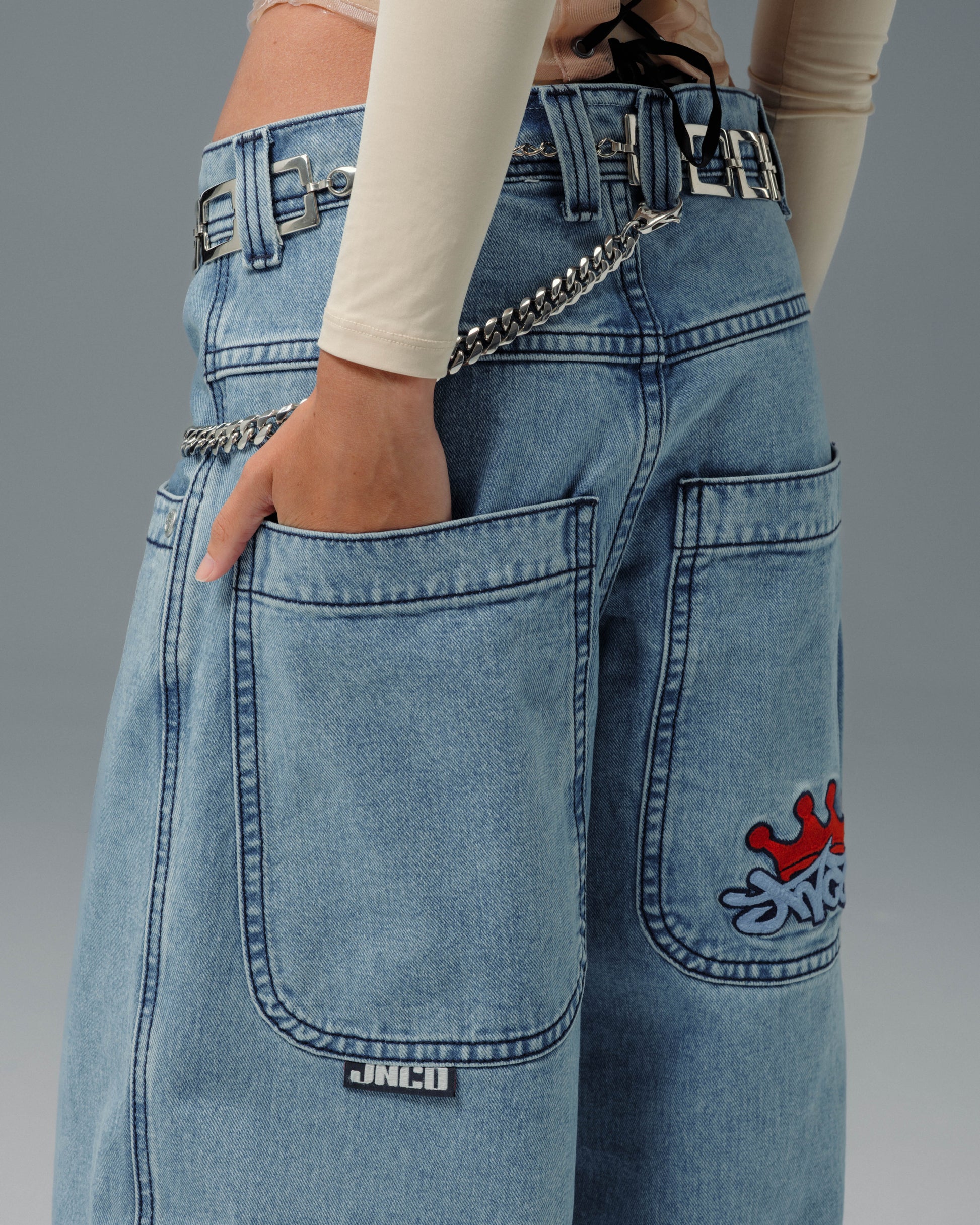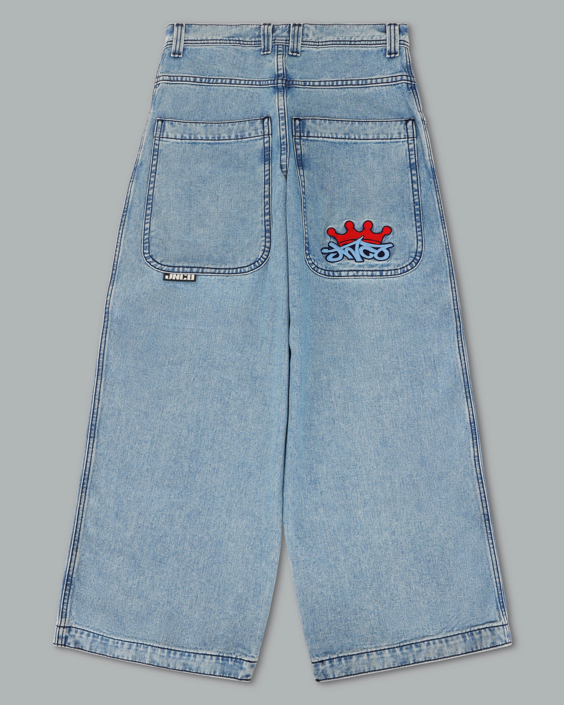 A revamped rendition of the original Twin Cannon in a classic Antique Wash. 14oz 100% cotton denim with a 3x1 left-hand weave and original contrast stitching. 26" bottom opening with double chain stitch detailing on the waistband and hem. Features the iconic JNCO Crown logo embroidery, and new custom buttons and rivets. Collectible new edition flasher included.