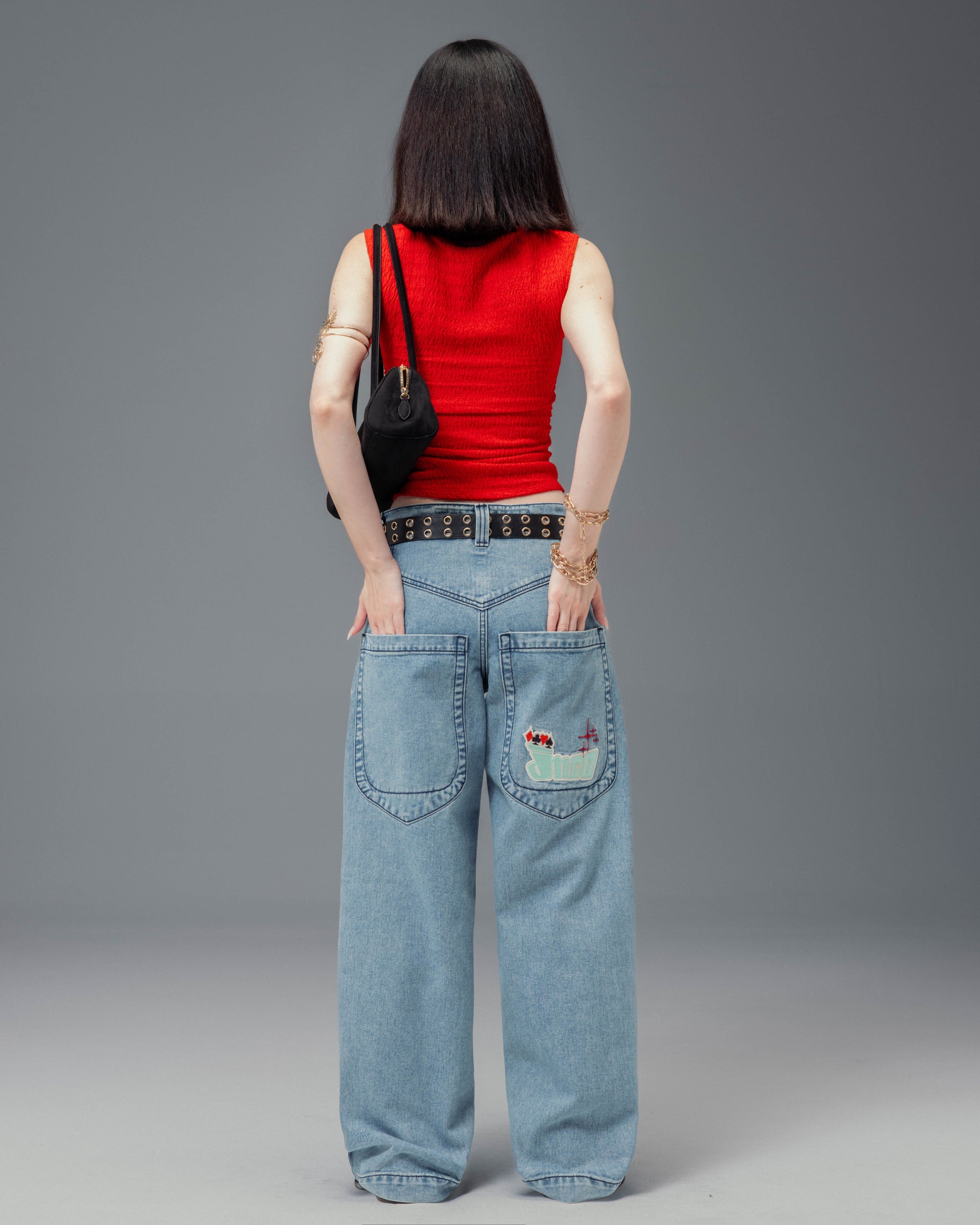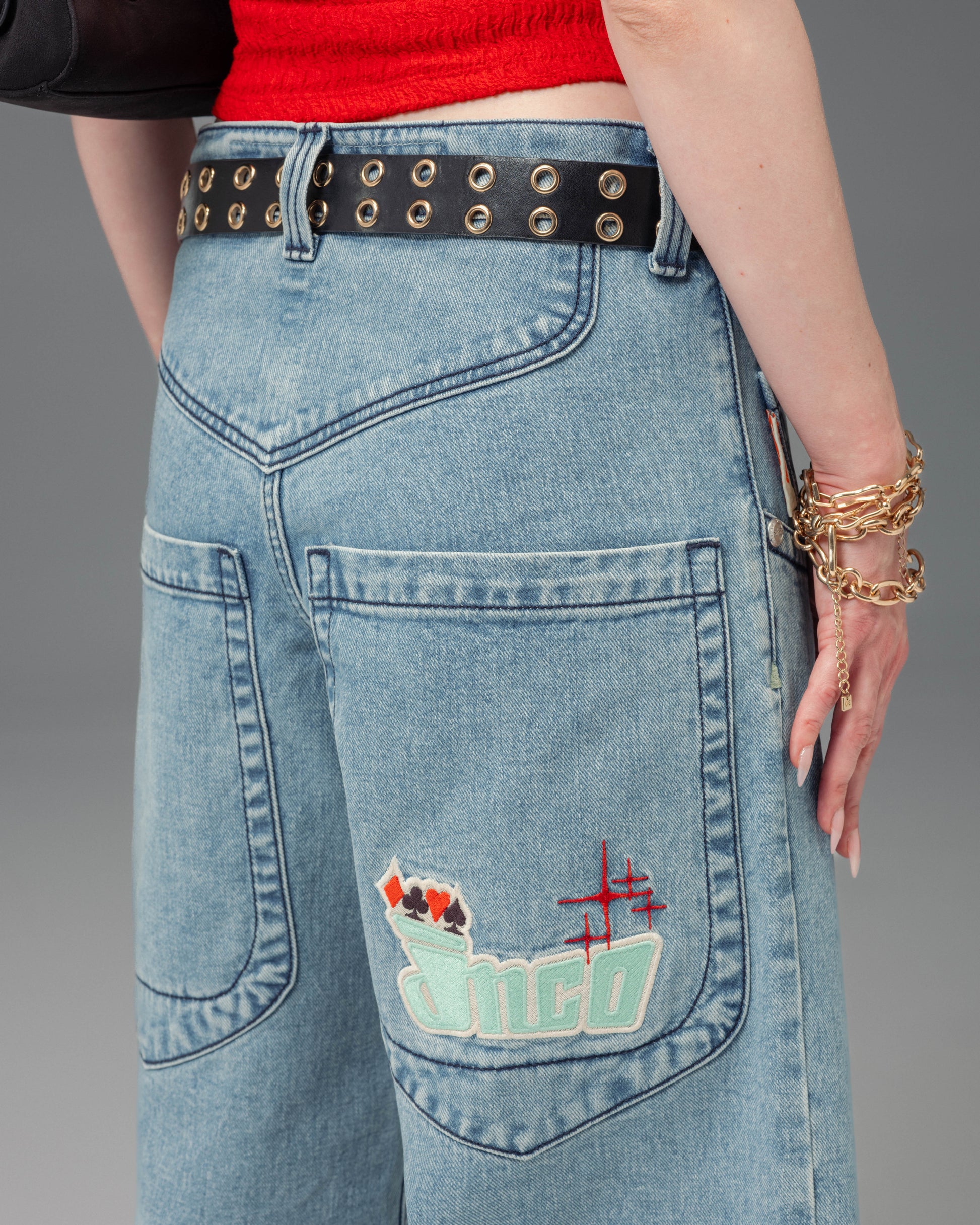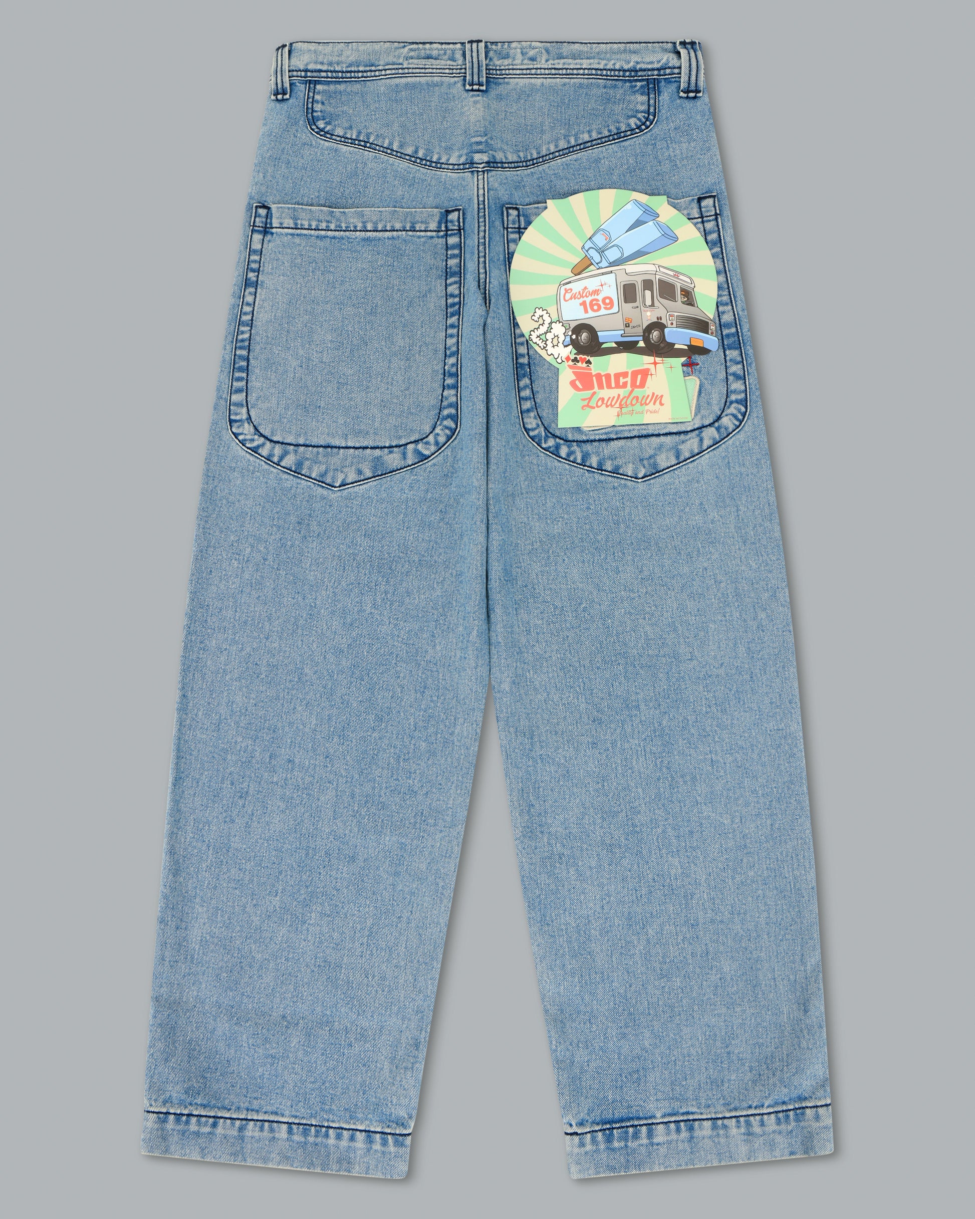 A revamped take of the original Low Down in a classic Antique Wash. 14oz 100% cotton denim with a 3x1 left-hand weave and contrast stitching. 20" bottom opening with double chain stitch detailing at the waistband and hem. Features the new JNCO Deck embroidery inspired by the four card suits, and custom buttons and rivets. Collectible new edition flasher included.