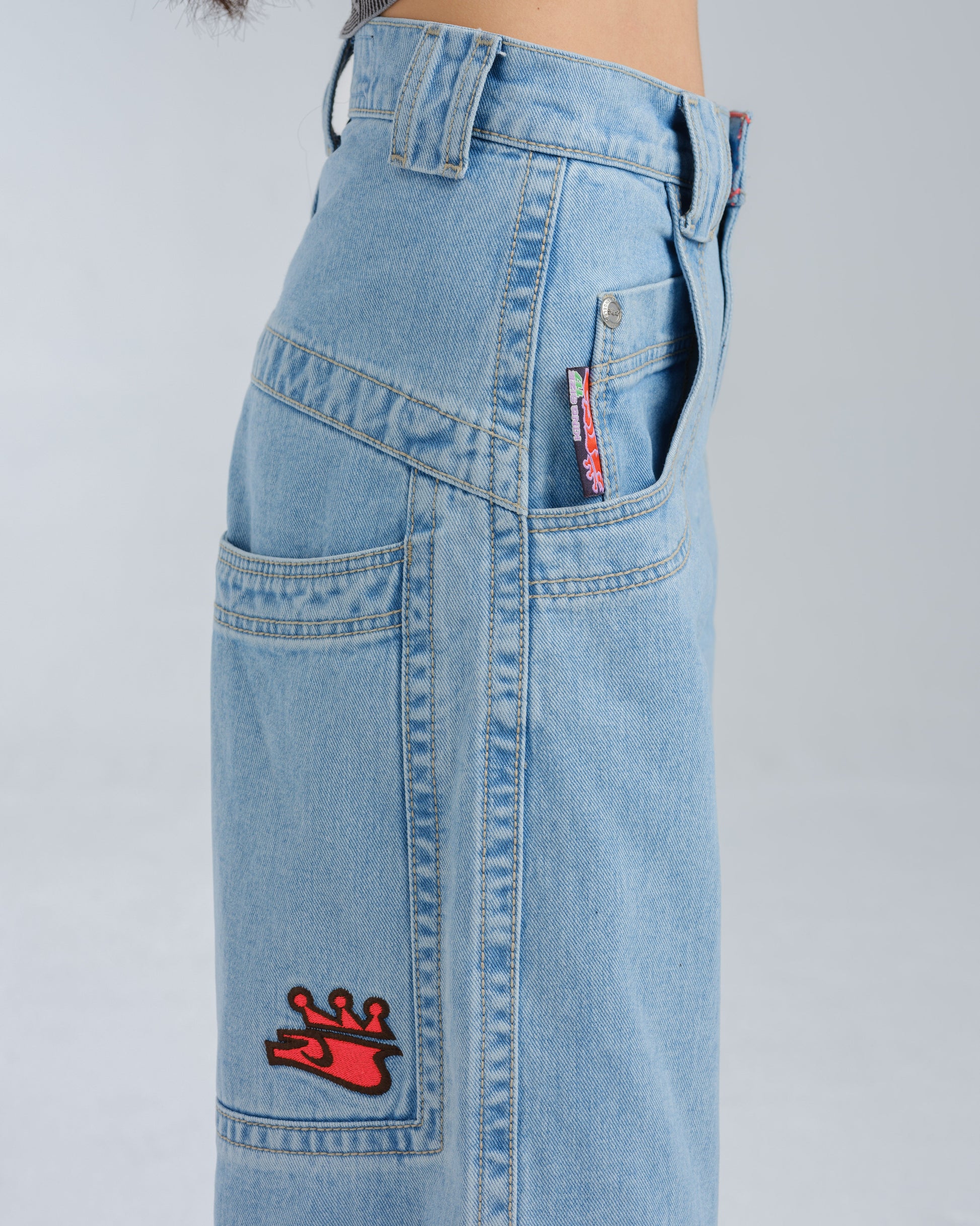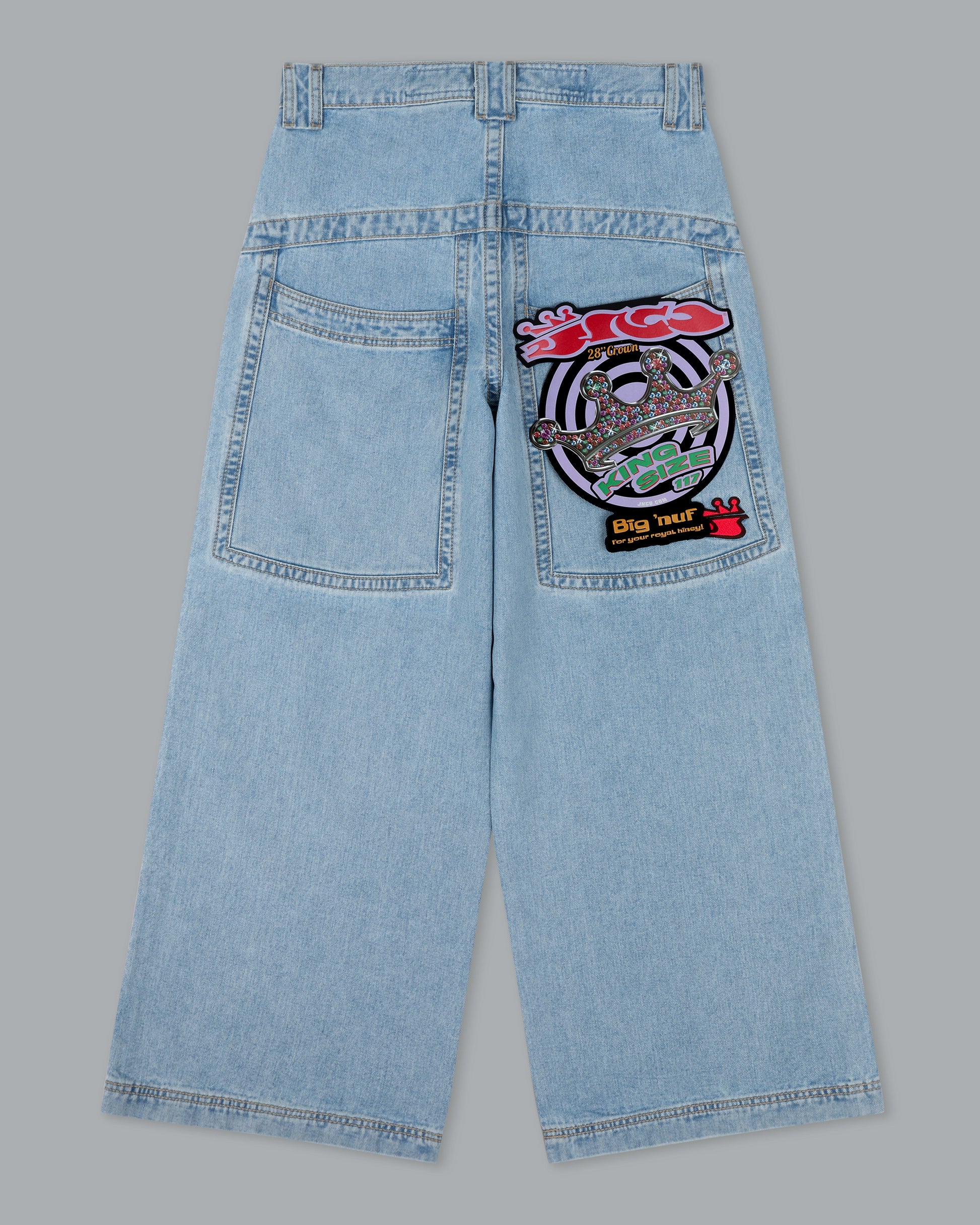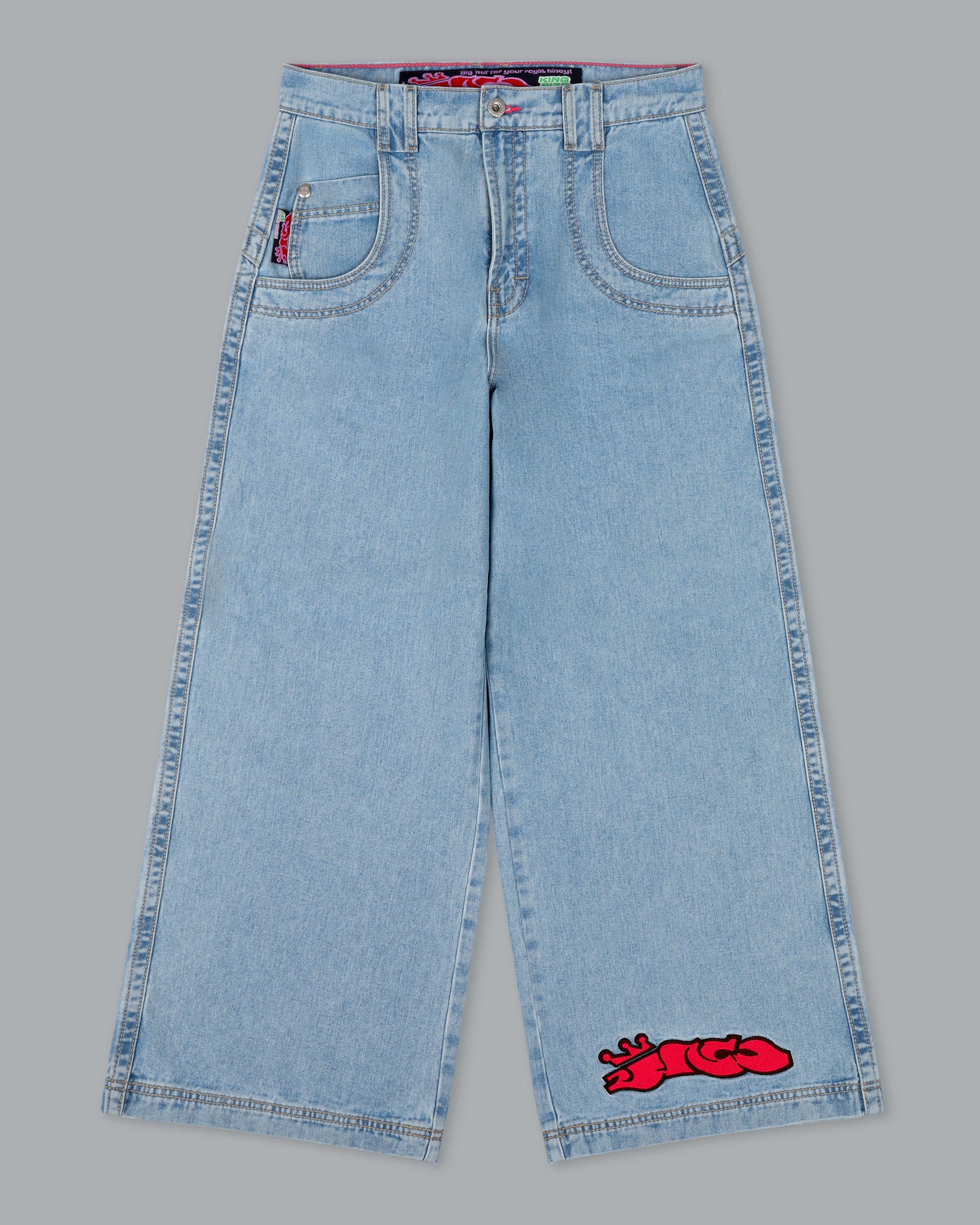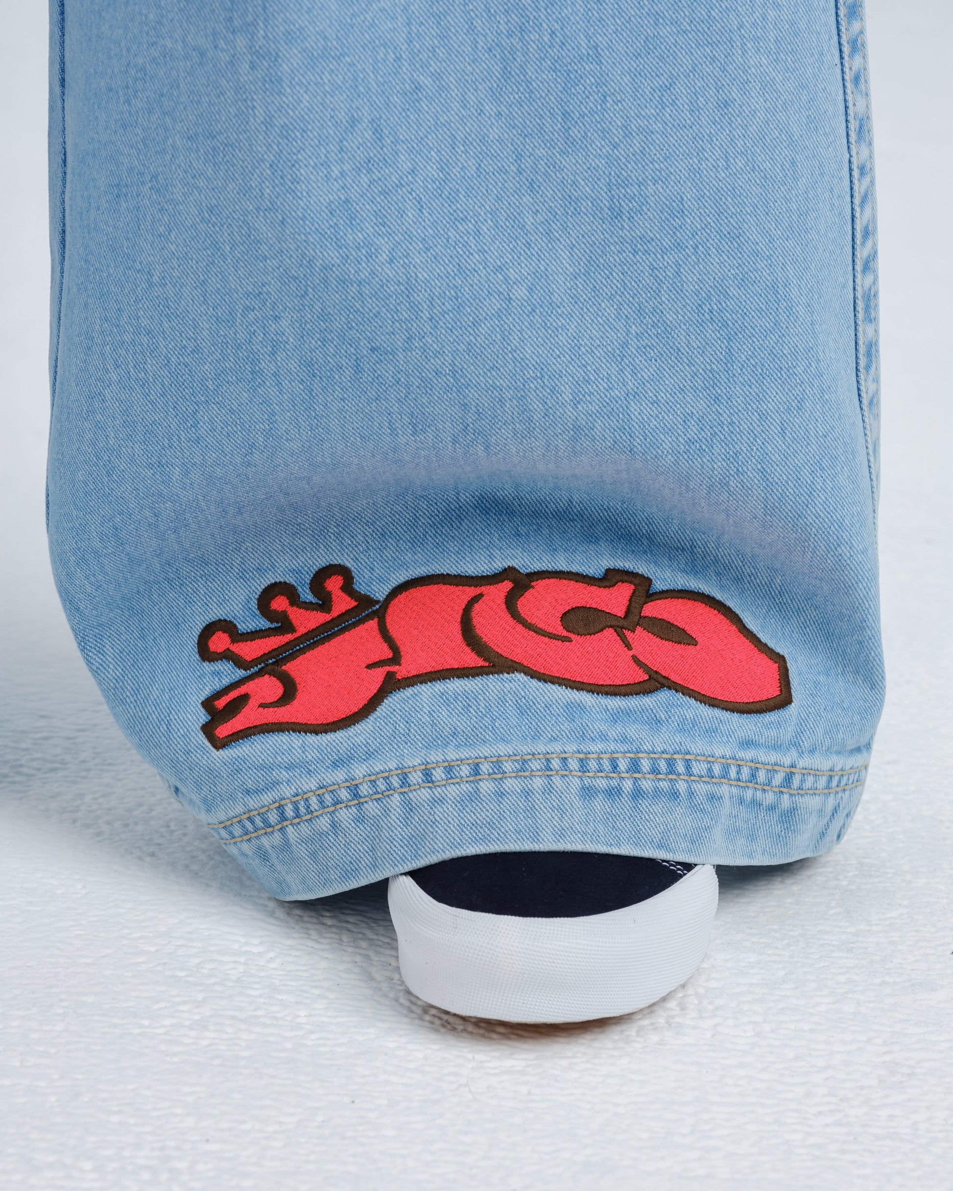 Classic 28" bottom opening in Original Vintage Wash. 14oz 100% cotton denim with heavy double contrast stitching. Features “Royal J” embroidery on back pocket and “Royal JNCO” on front leg. Includes collectible flasher. Limited Edition – limited stock.