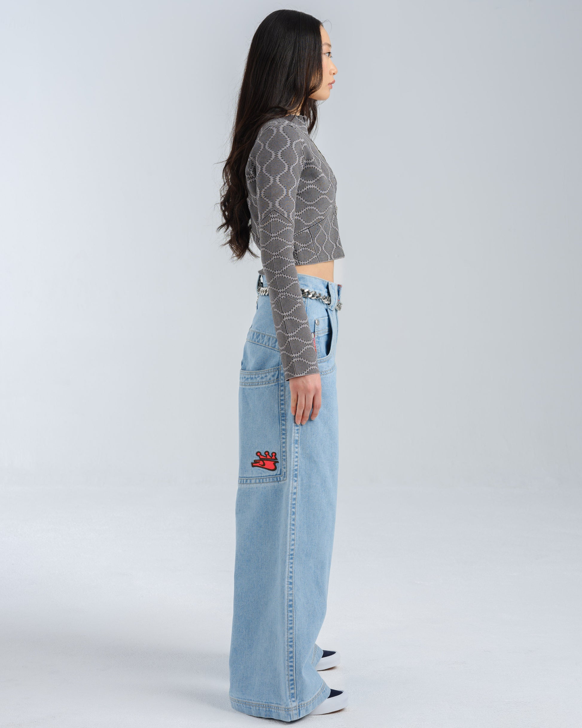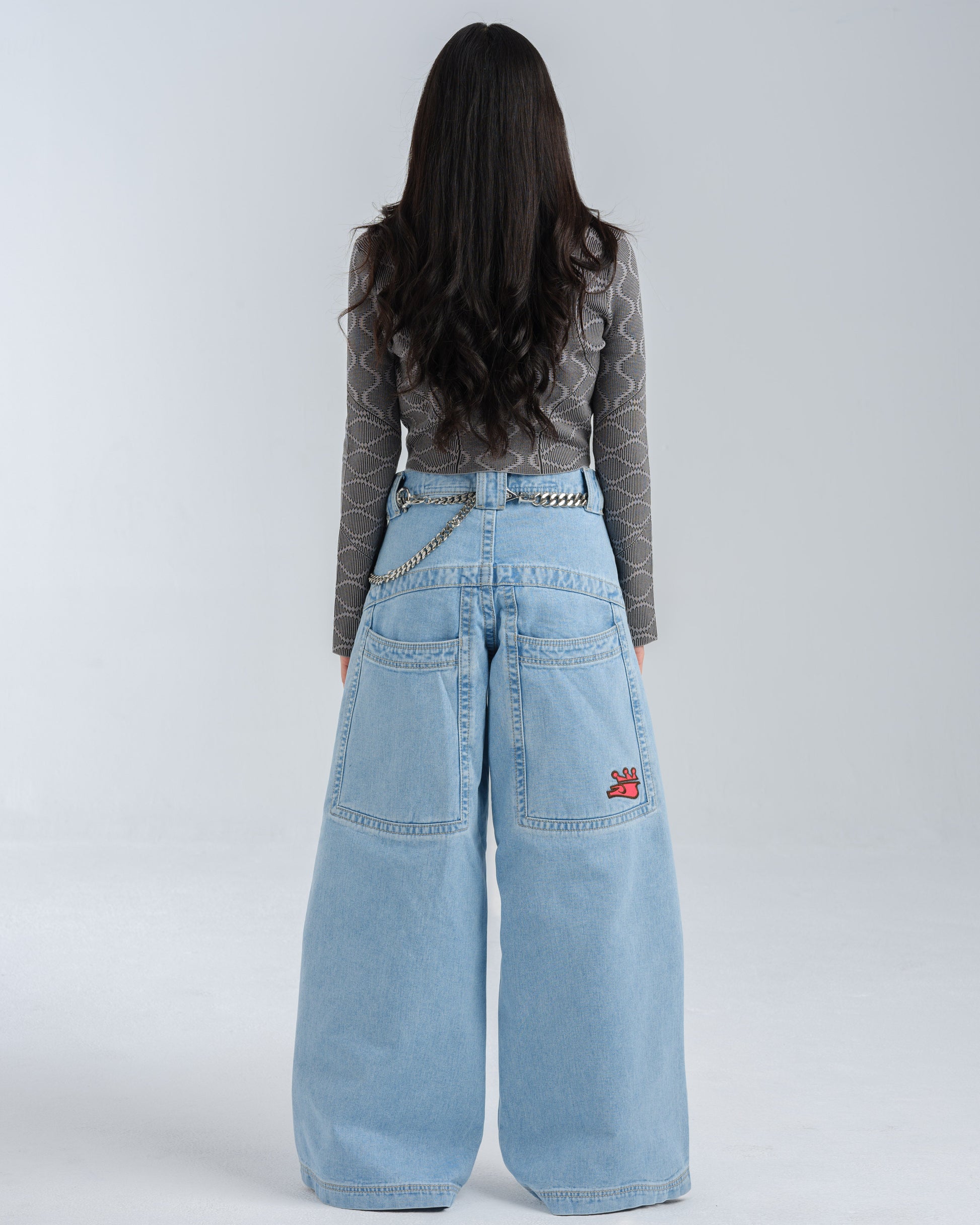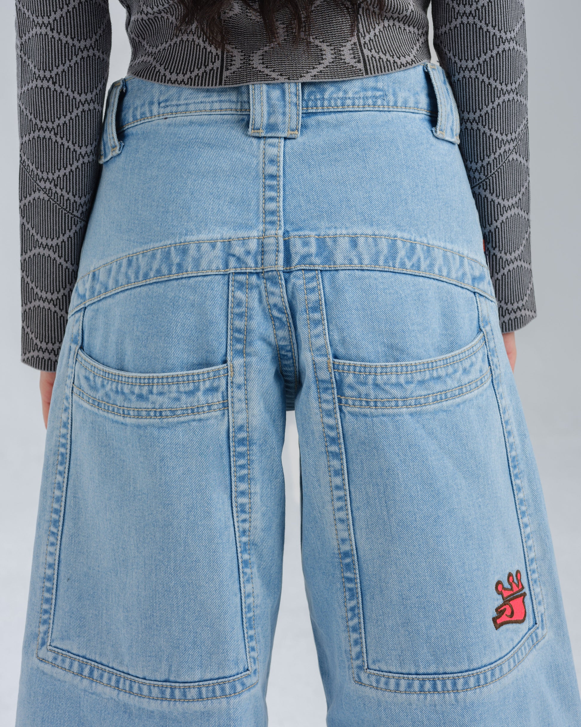 Classic 28" bottom opening in Original Vintage Wash. 14oz 100% cotton denim with heavy double contrast stitching. Features “Royal J” embroidery on back pocket and “Royal JNCO” on front leg. Includes collectible flasher. Limited Edition – limited stock.