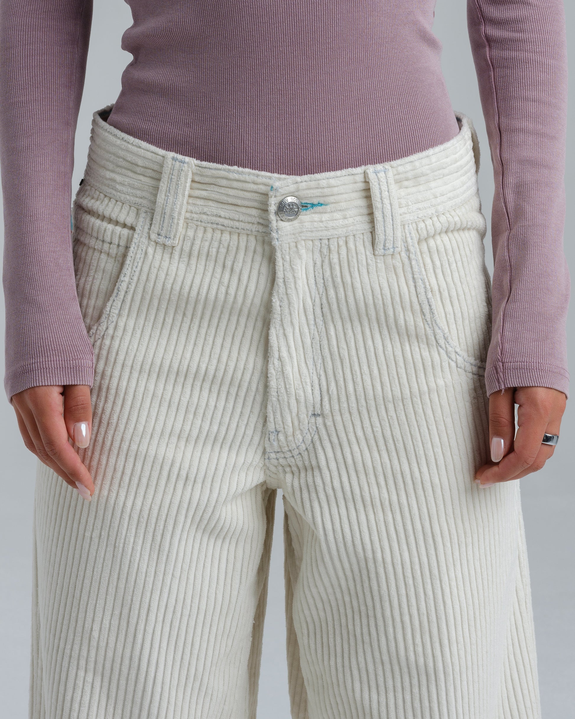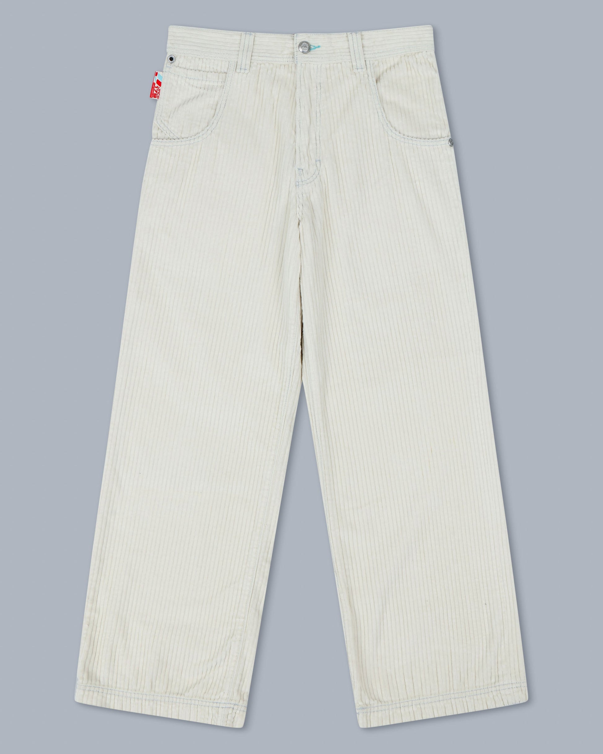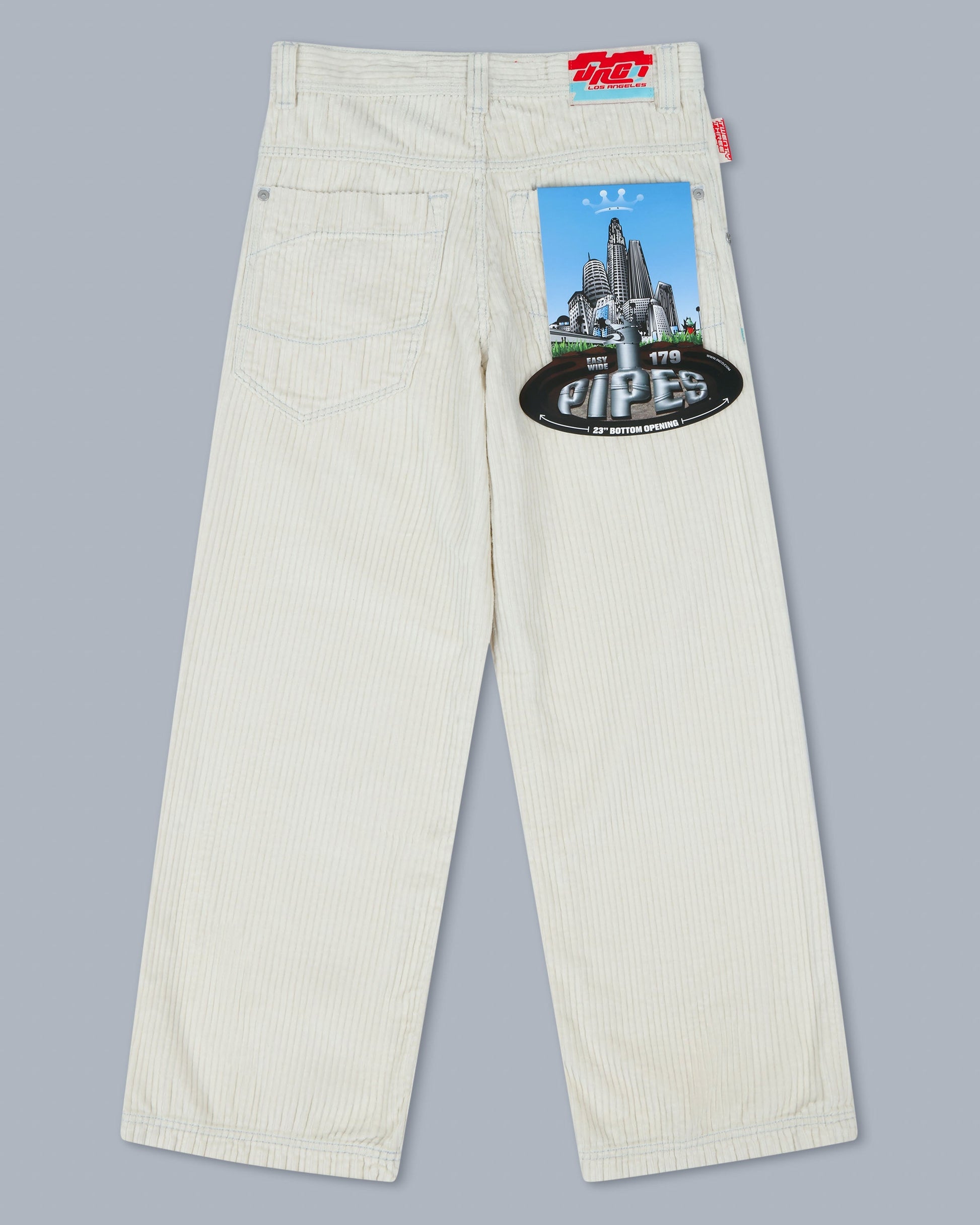 A refreshed take on the original Pipes in heavy 4-Wale Corduroy in tofu. 12oz 100% cotton corduroy with a soft feel and 23" bottom opening. Features the new Easy Wide Pipes embroidery, angular pockets, and double chain stitch detailing at the waistband and hem. Finished with contrast stitching, custom buttons and rivets, and a collectible new edition flasher.