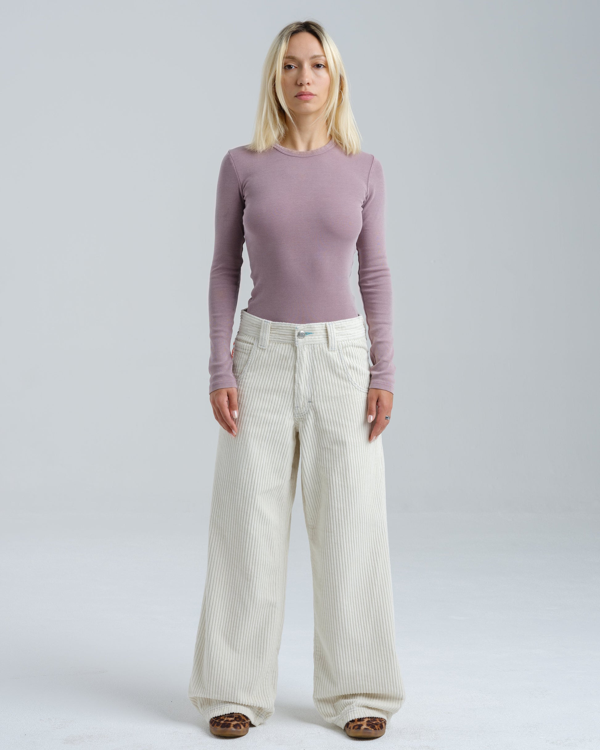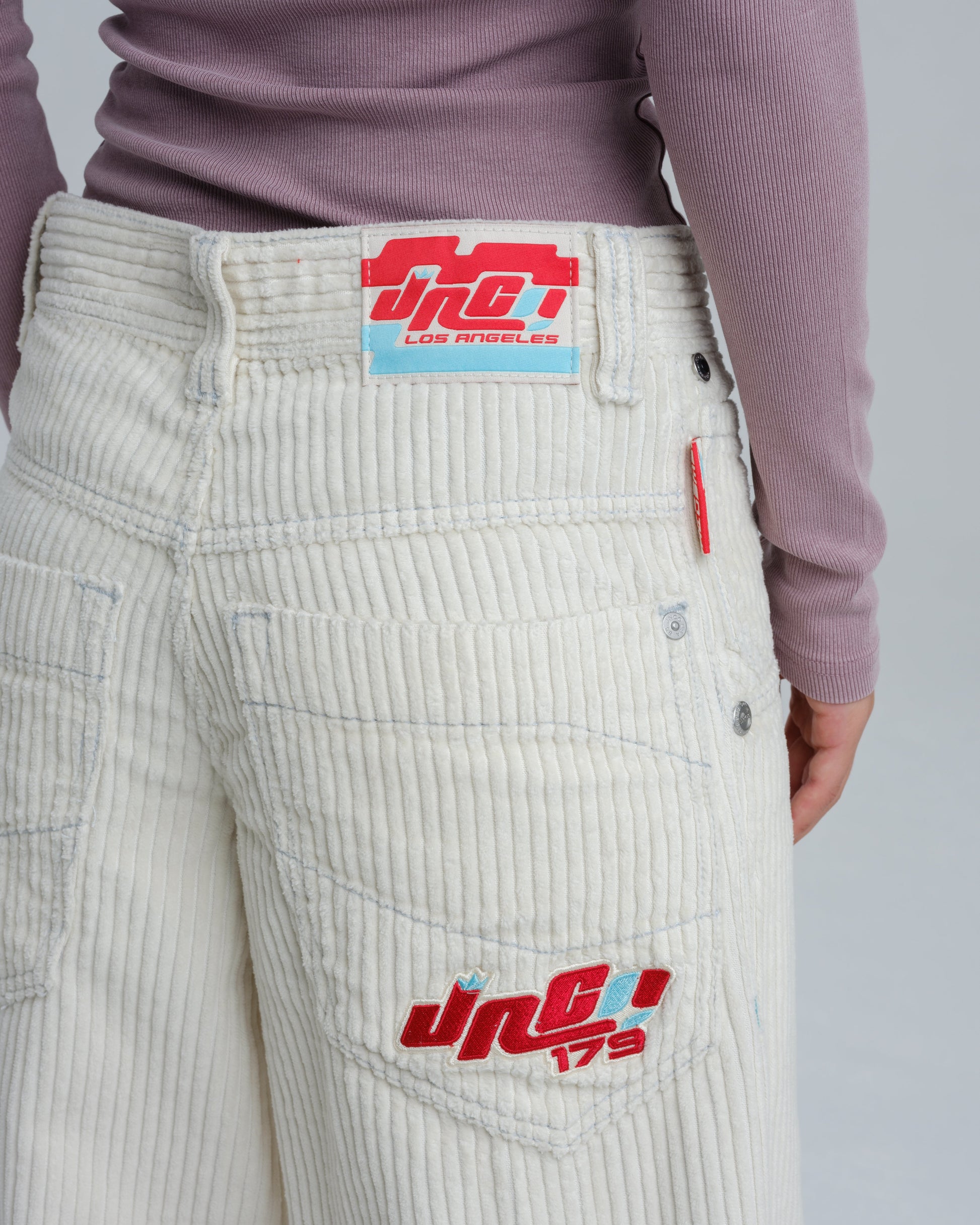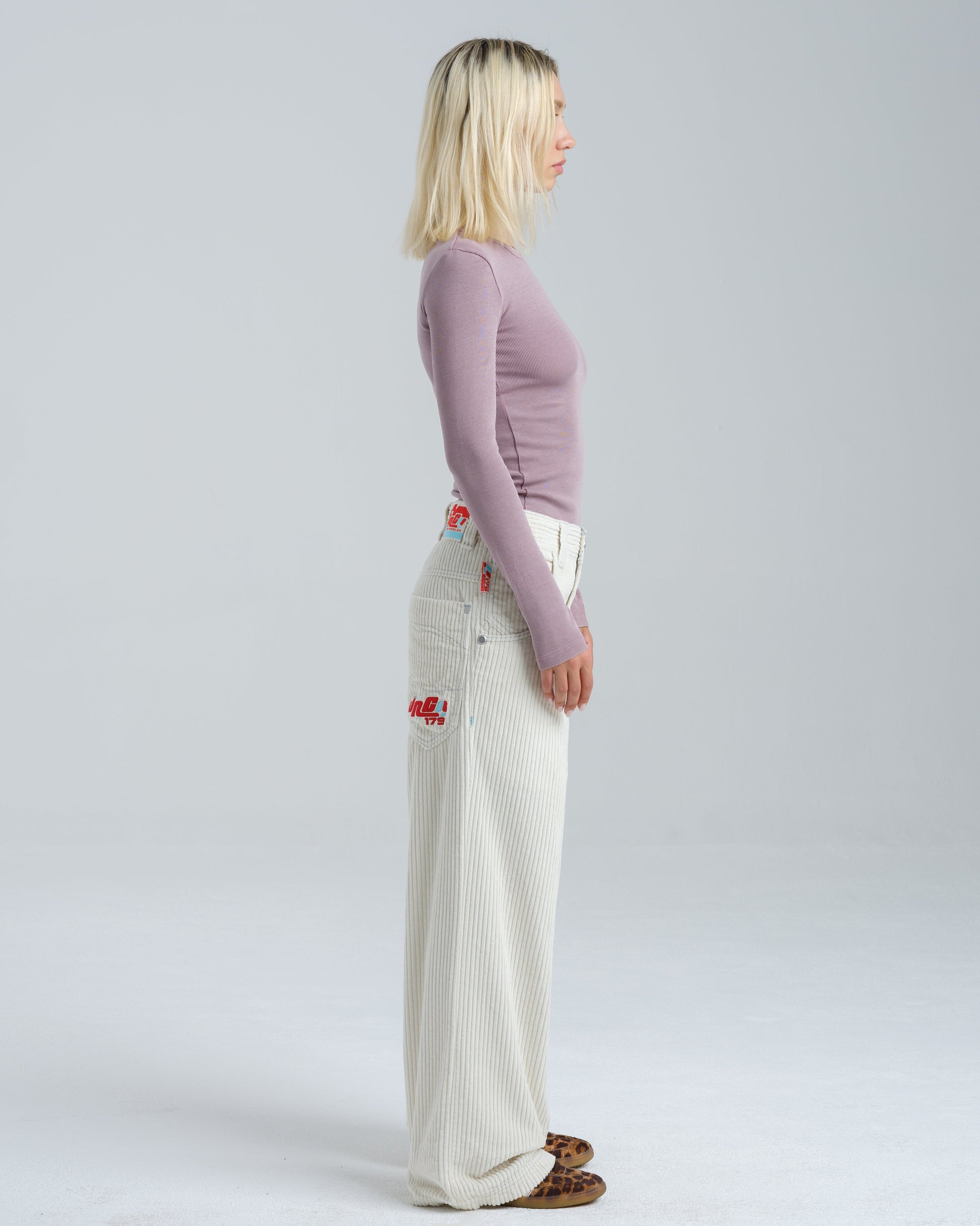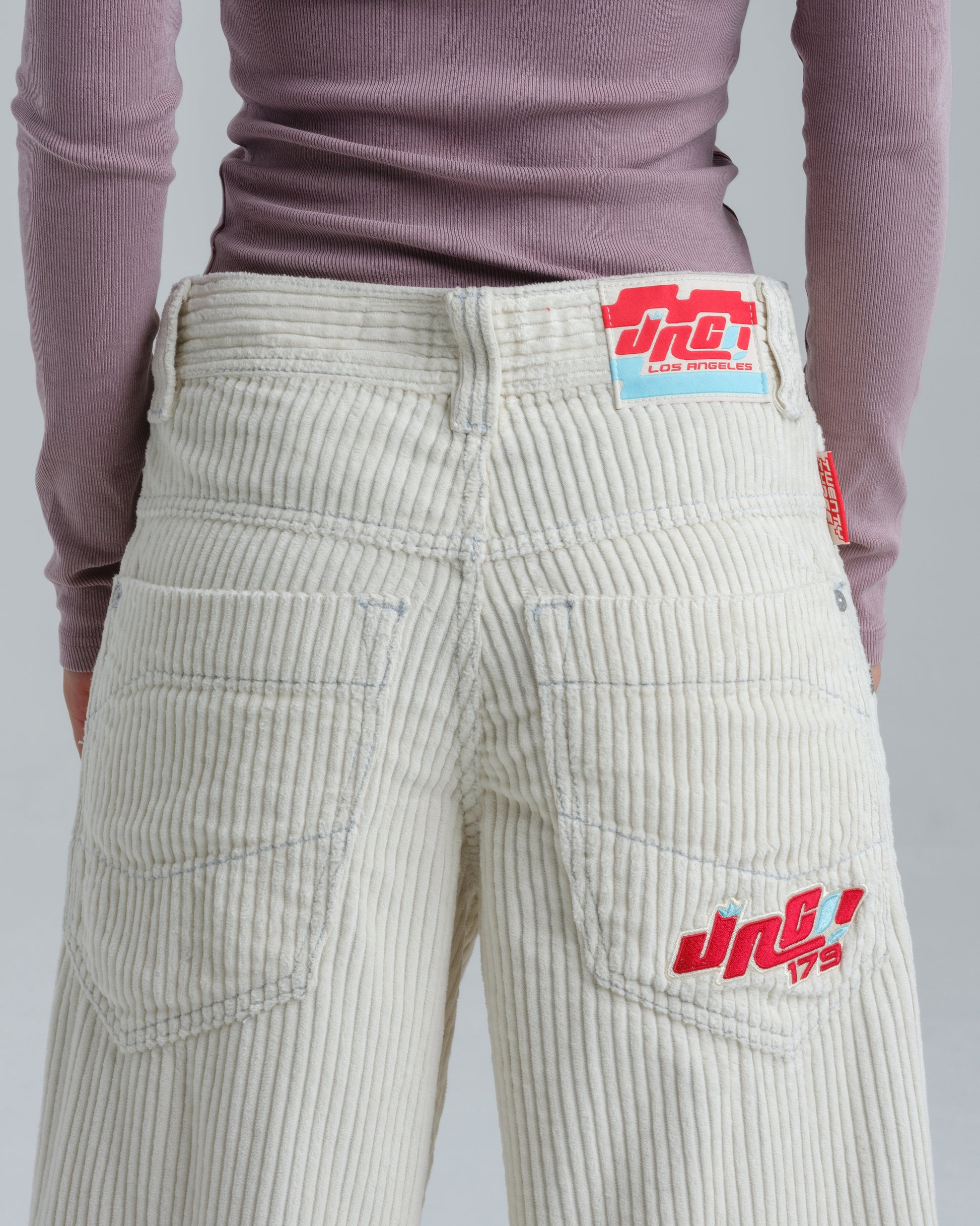 A refreshed take on the original Pipes in heavy 4-Wale Corduroy in tofu. 12oz 100% cotton corduroy with a soft feel and 23" bottom opening. Features the new Easy Wide Pipes embroidery, angular pockets, and double chain stitch detailing at the waistband and hem. Finished with contrast stitching, custom buttons and rivets, and a collectible new edition flasher.