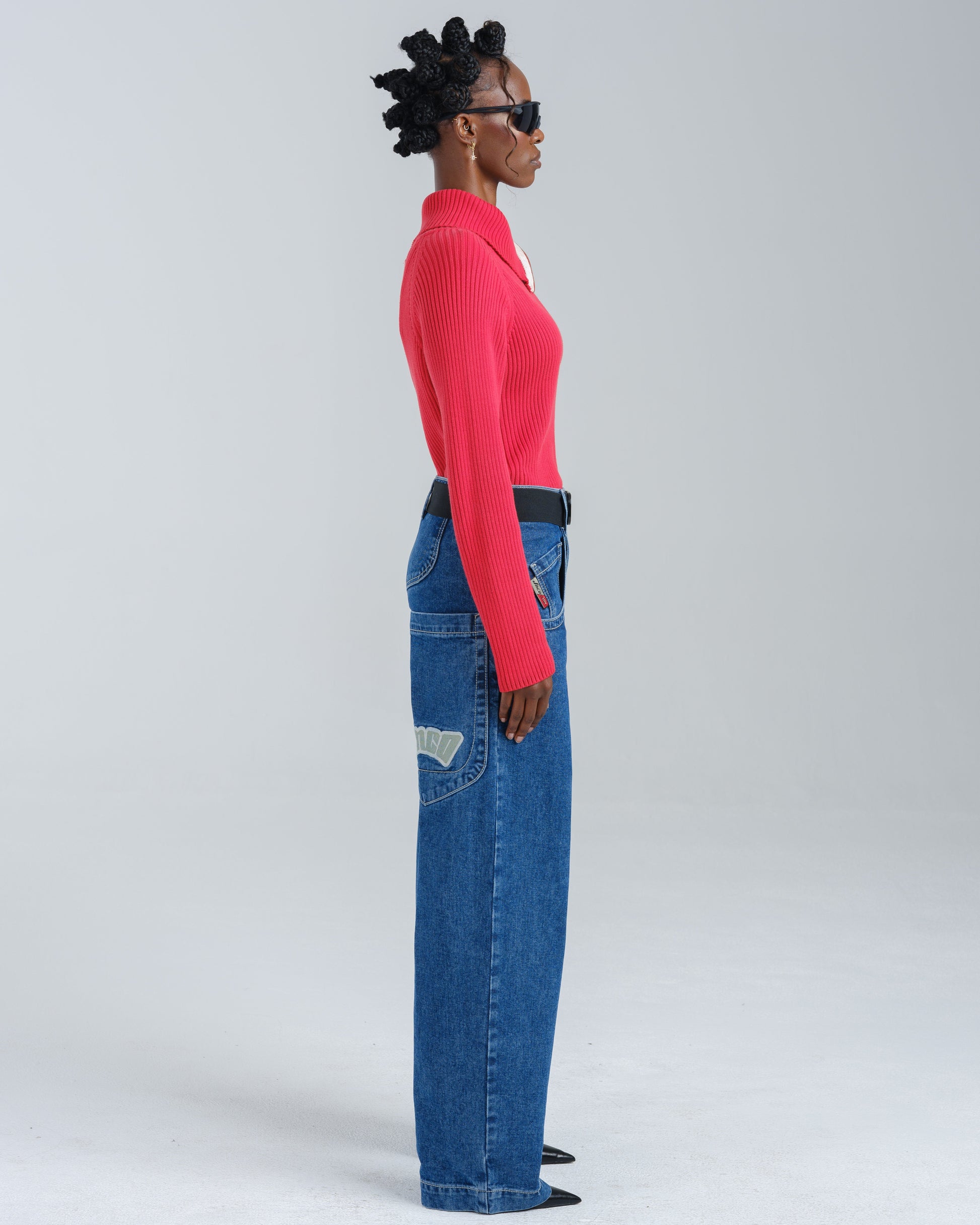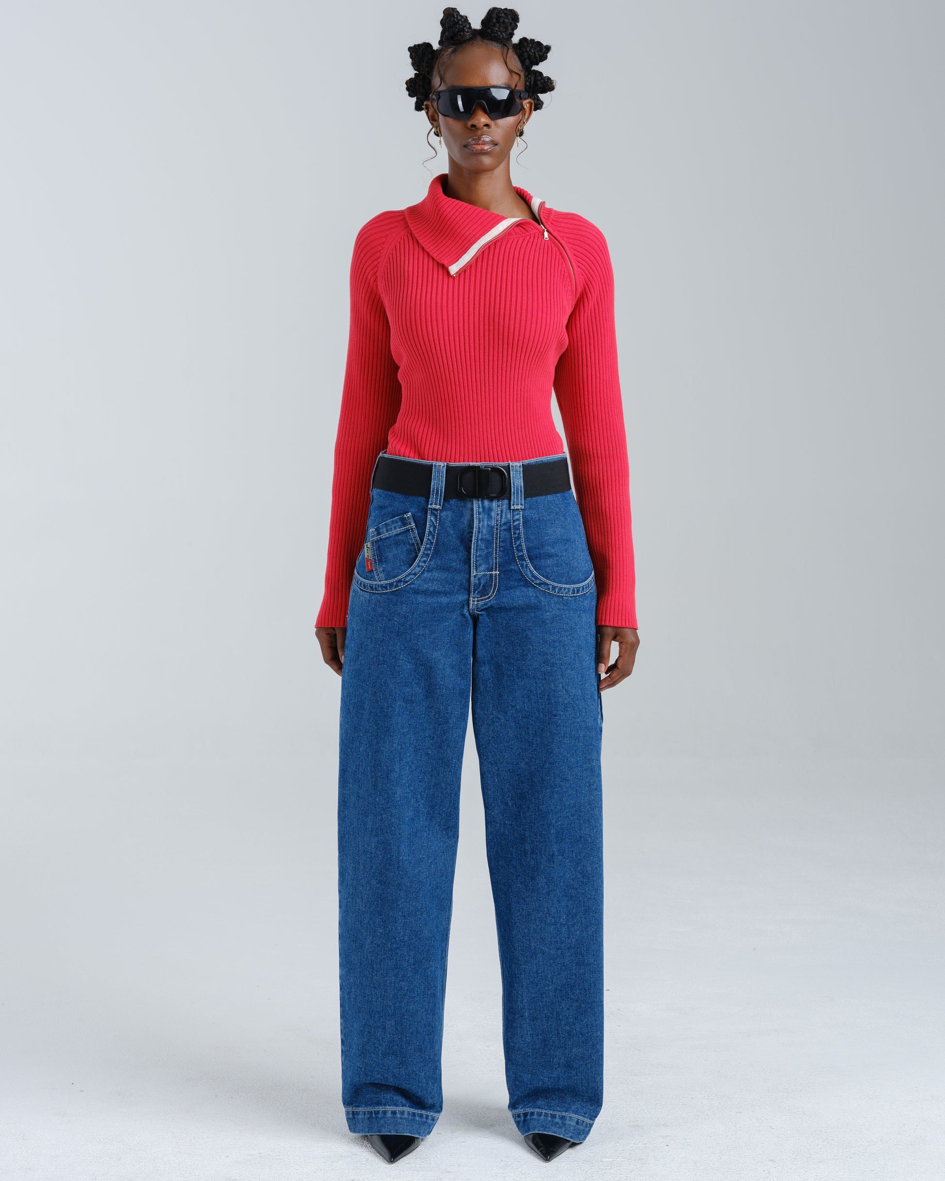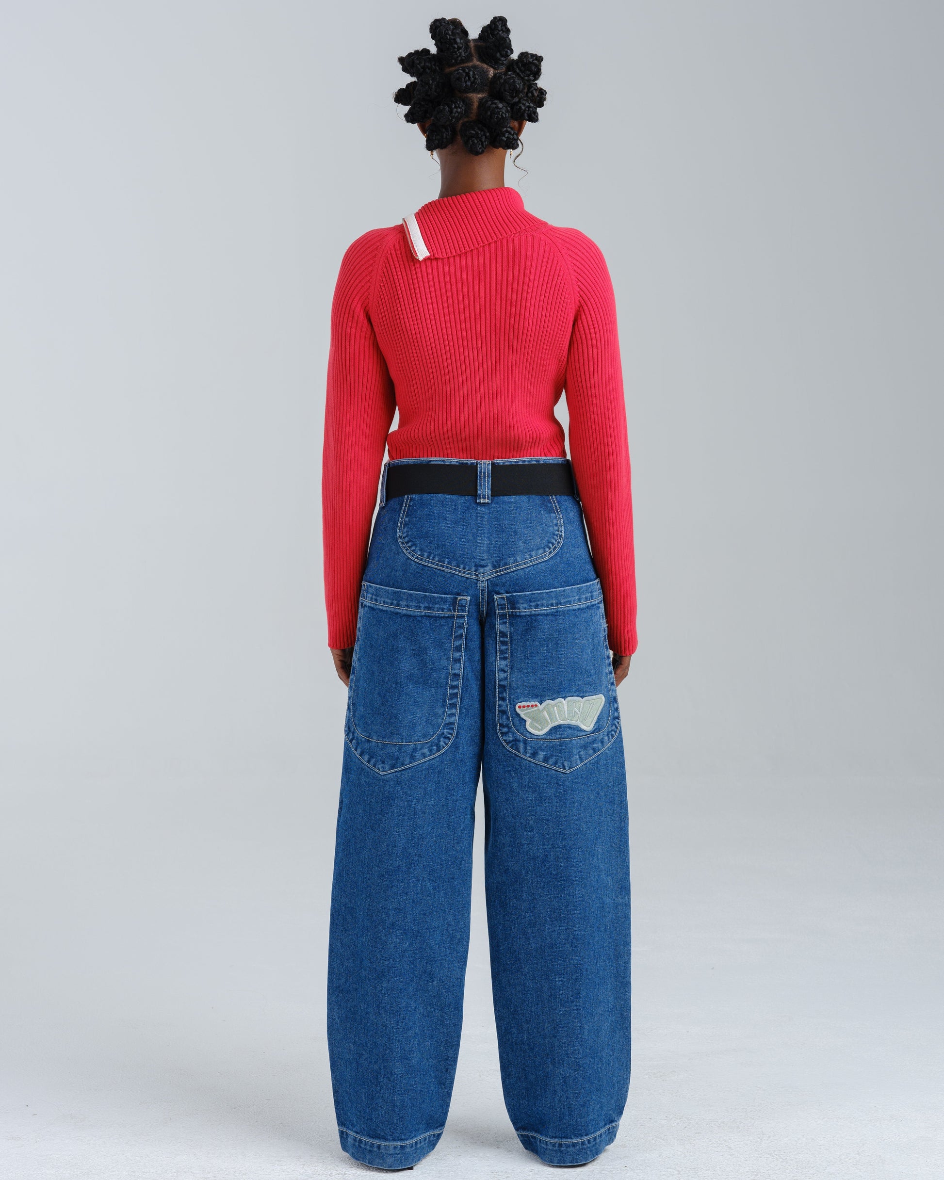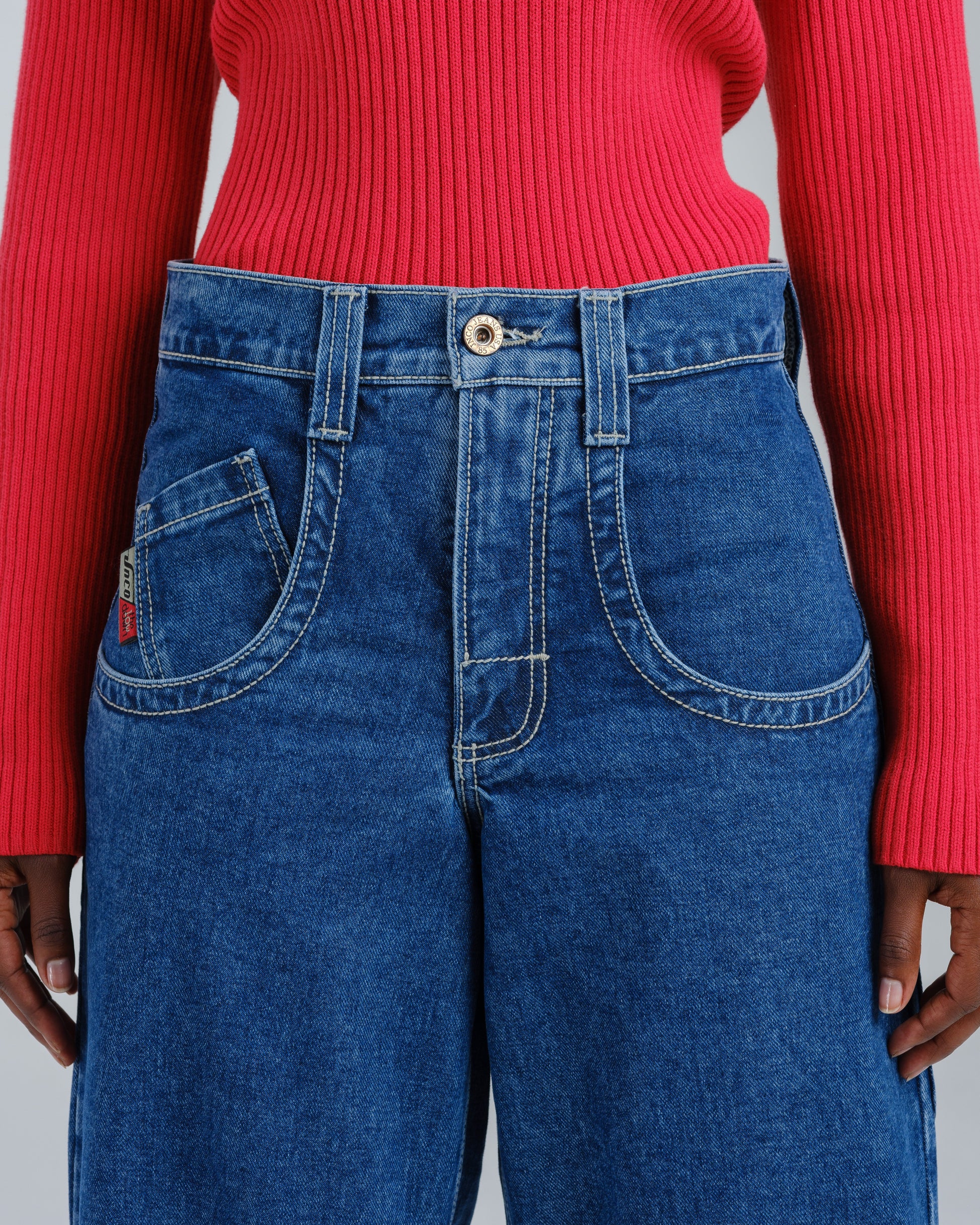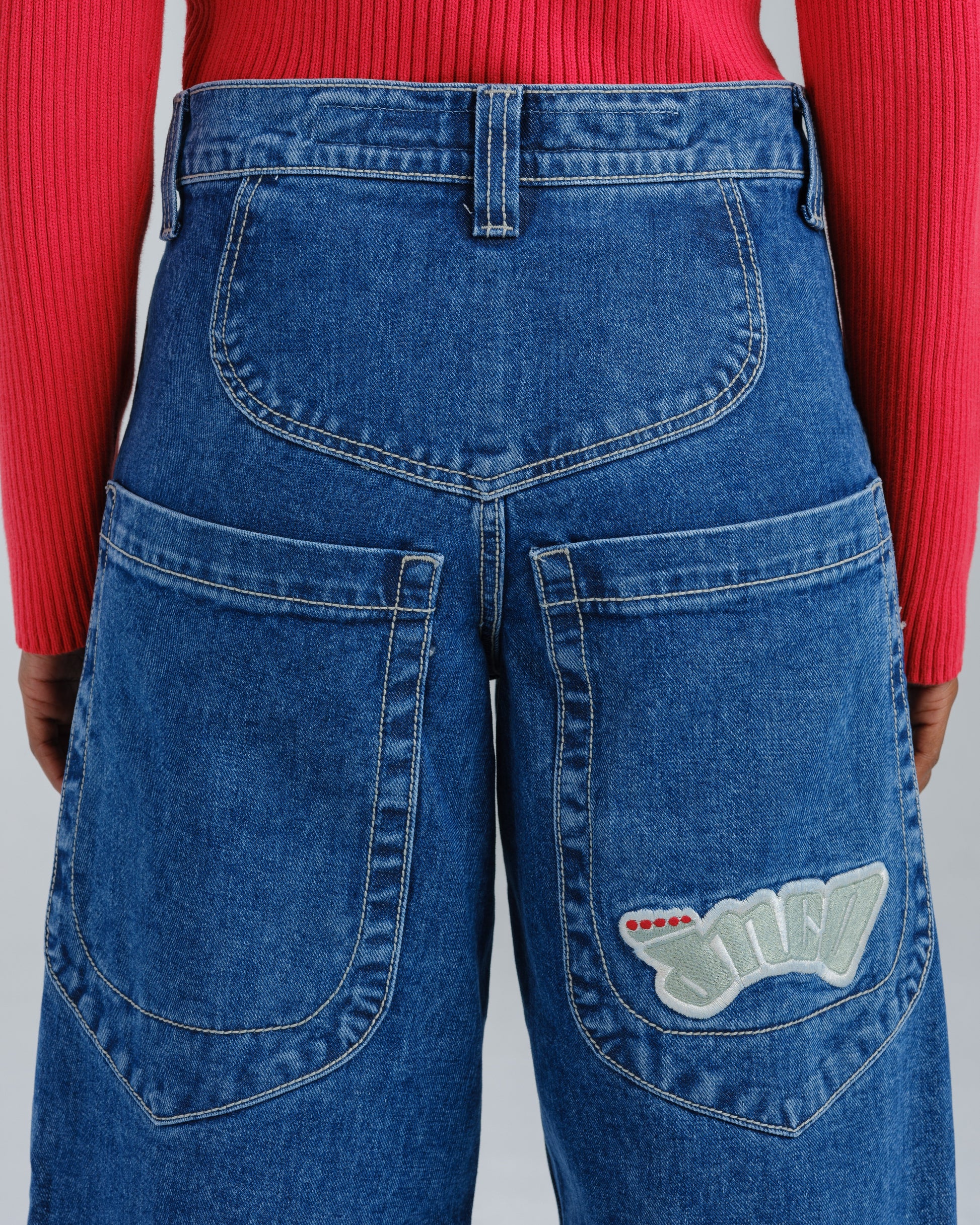 JNCO classic in Original Dark Stone Wash. 20" bottom opening with original artwork, labels, and back right pocket embroidery. 14oz 100% cotton denim with contrast stitching. Collectible flasher included.