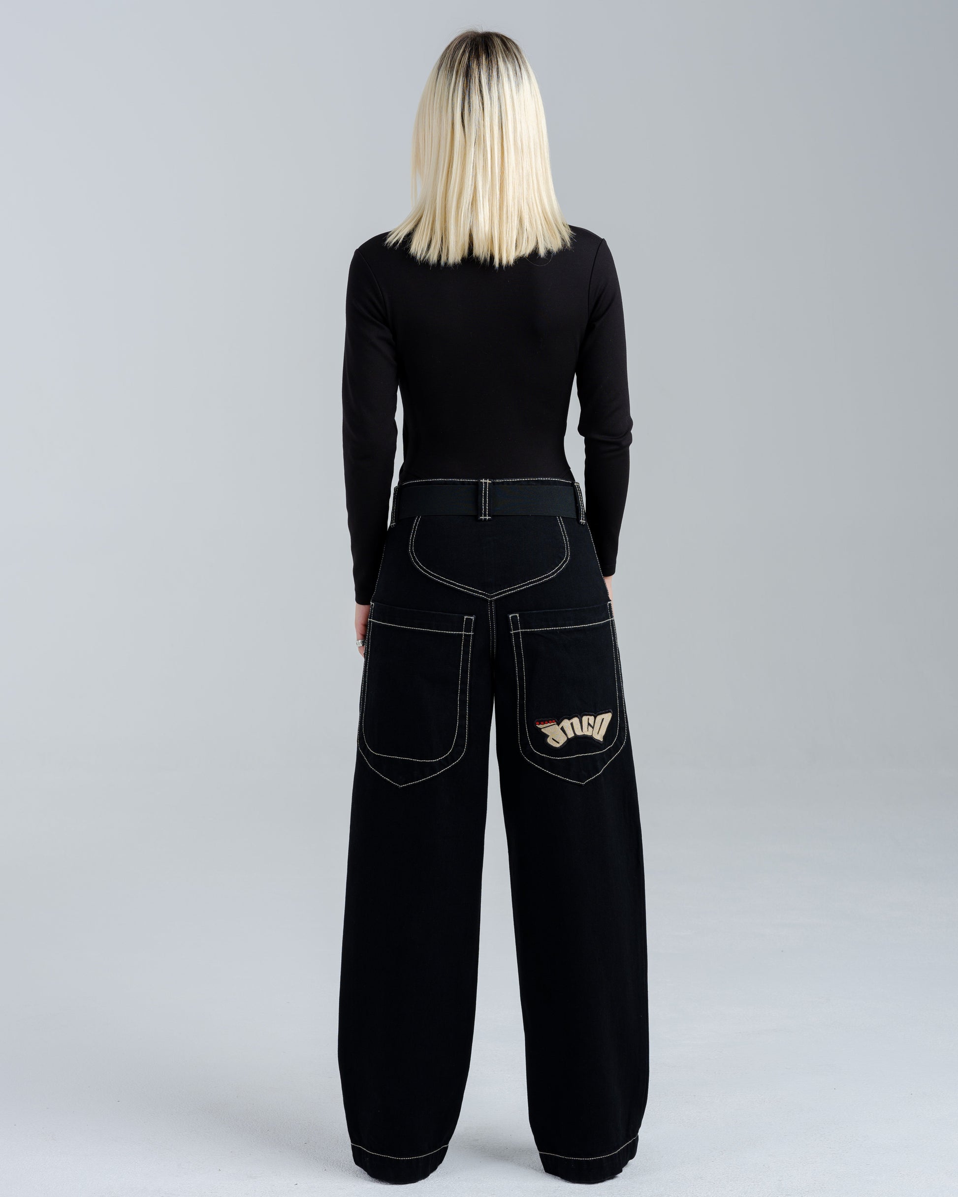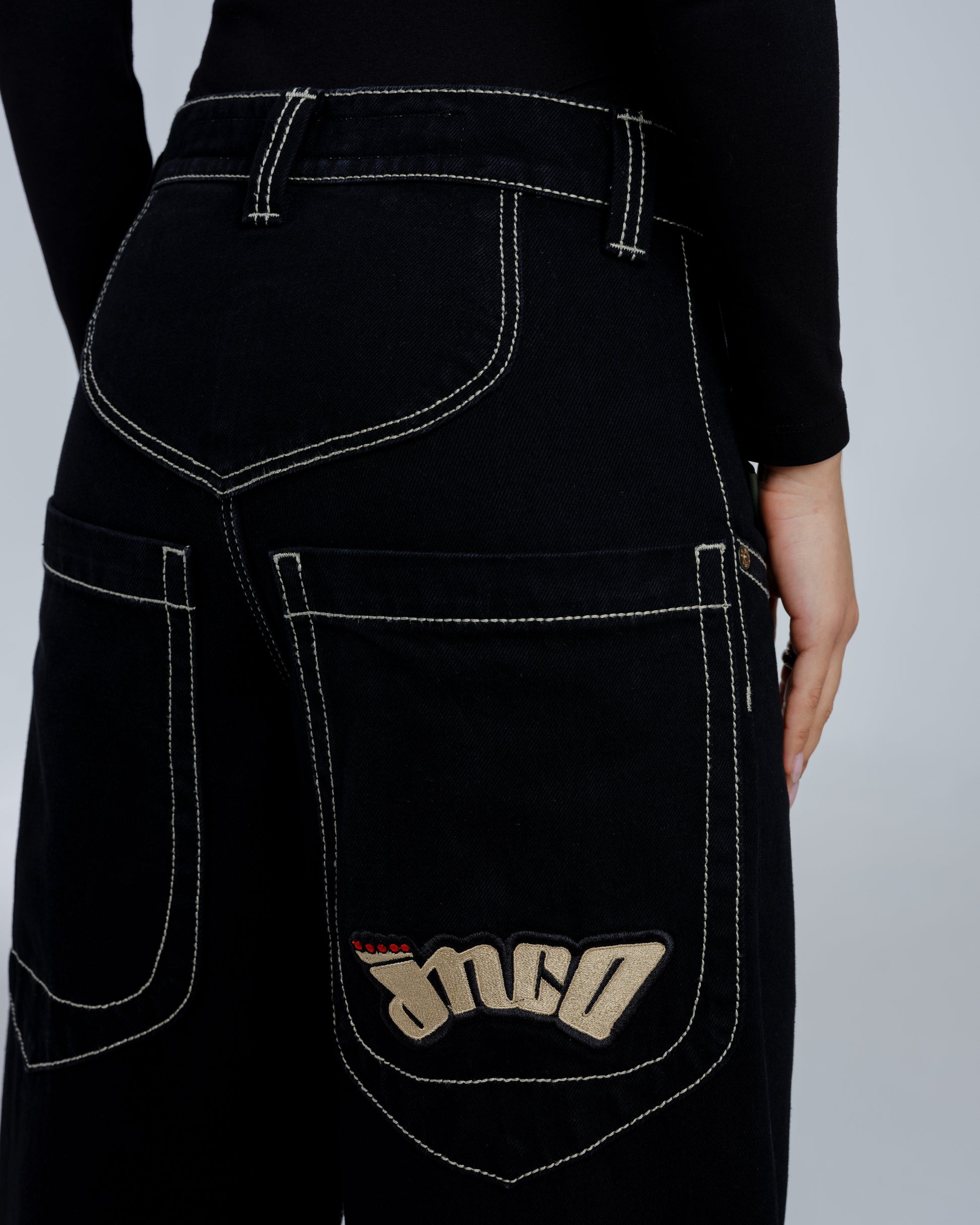 JNCO classic in Original Jet Black Wash. 20" bottom opening with contrast stitching, original artwork, labels, and back right pocket embroidery. 13oz 100% cotton rope-dyed denim, finished with a luxe starch wax. Collectible flasher included.