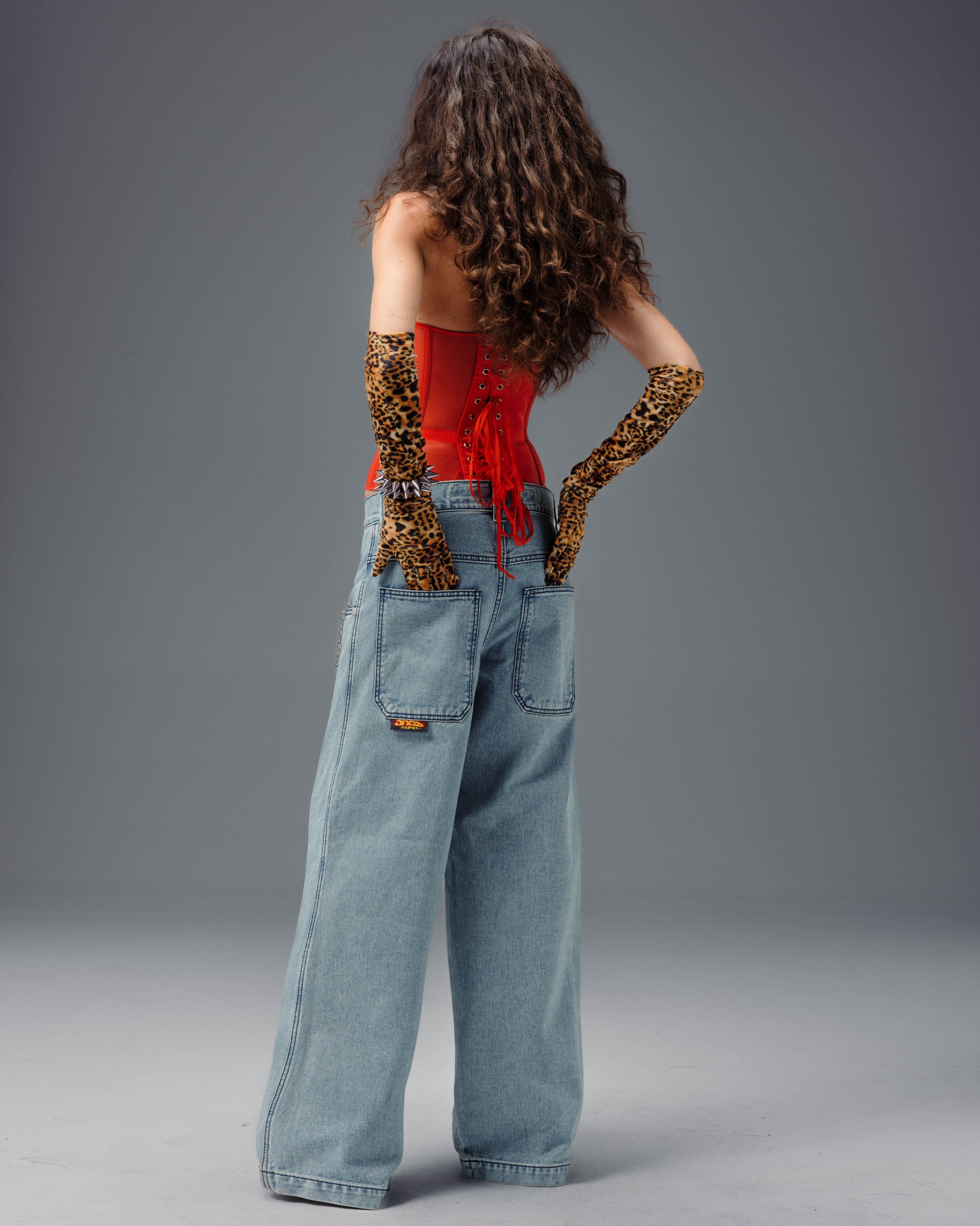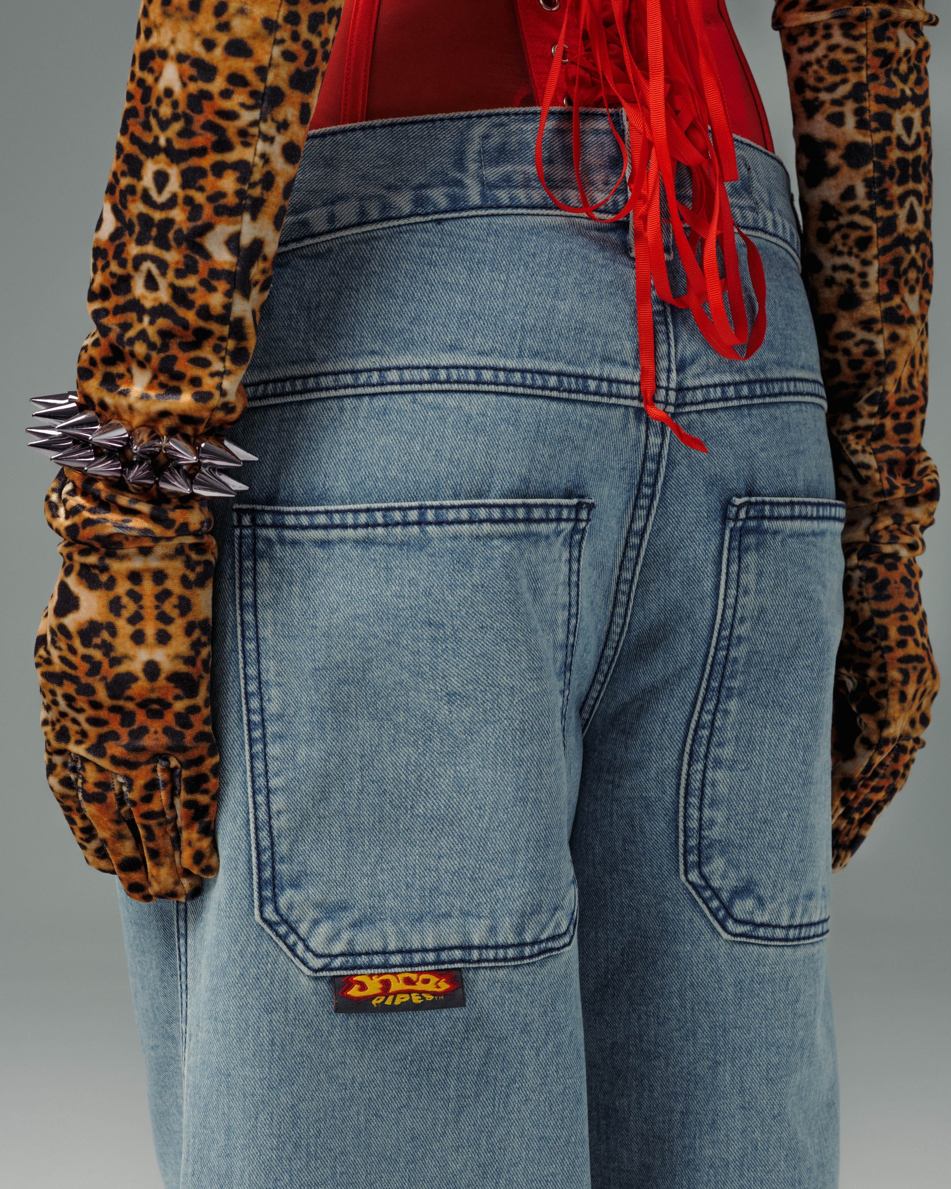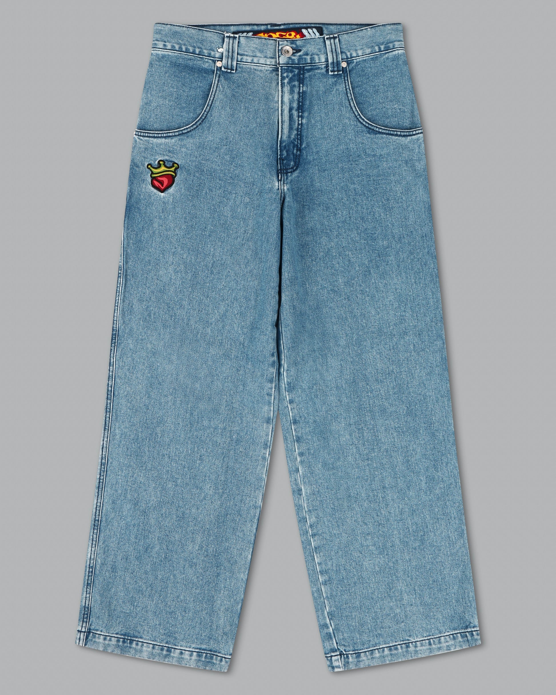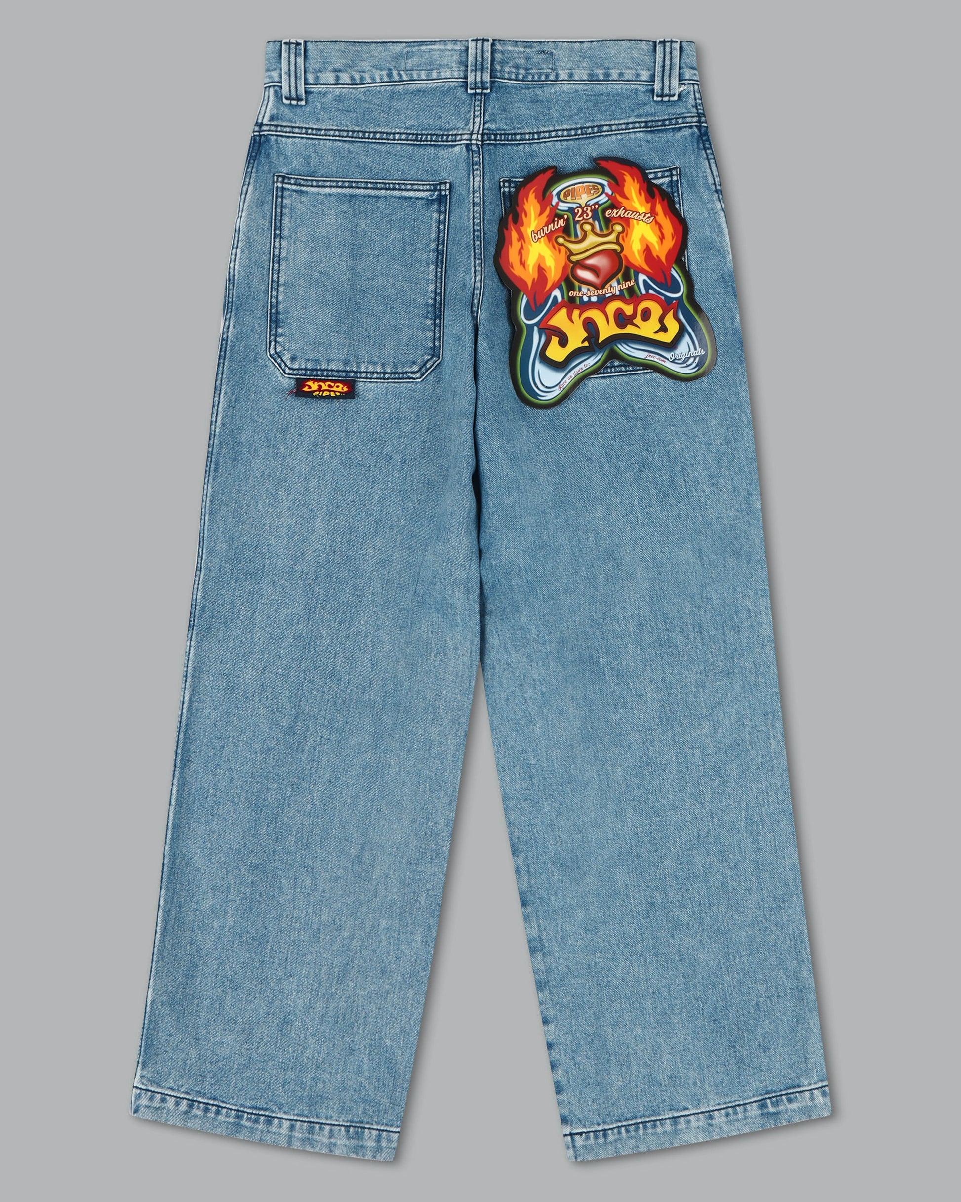 JNCO classic in Original Antique Wash. 23" bottom opening with original artwork, labels, and front right pocket embroidery. 14oz 100% cotton denim with contrast stitching. Collectible flasher included.