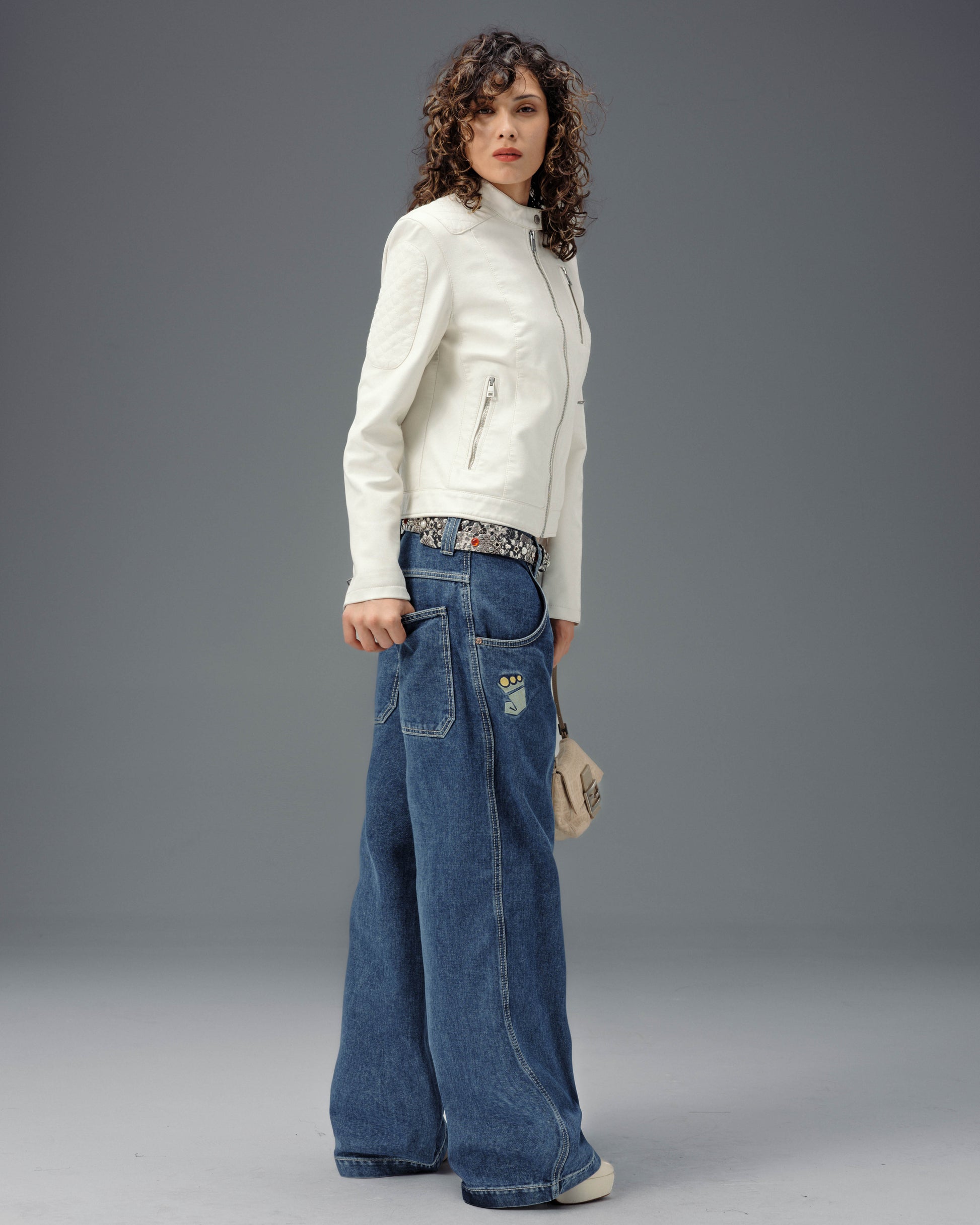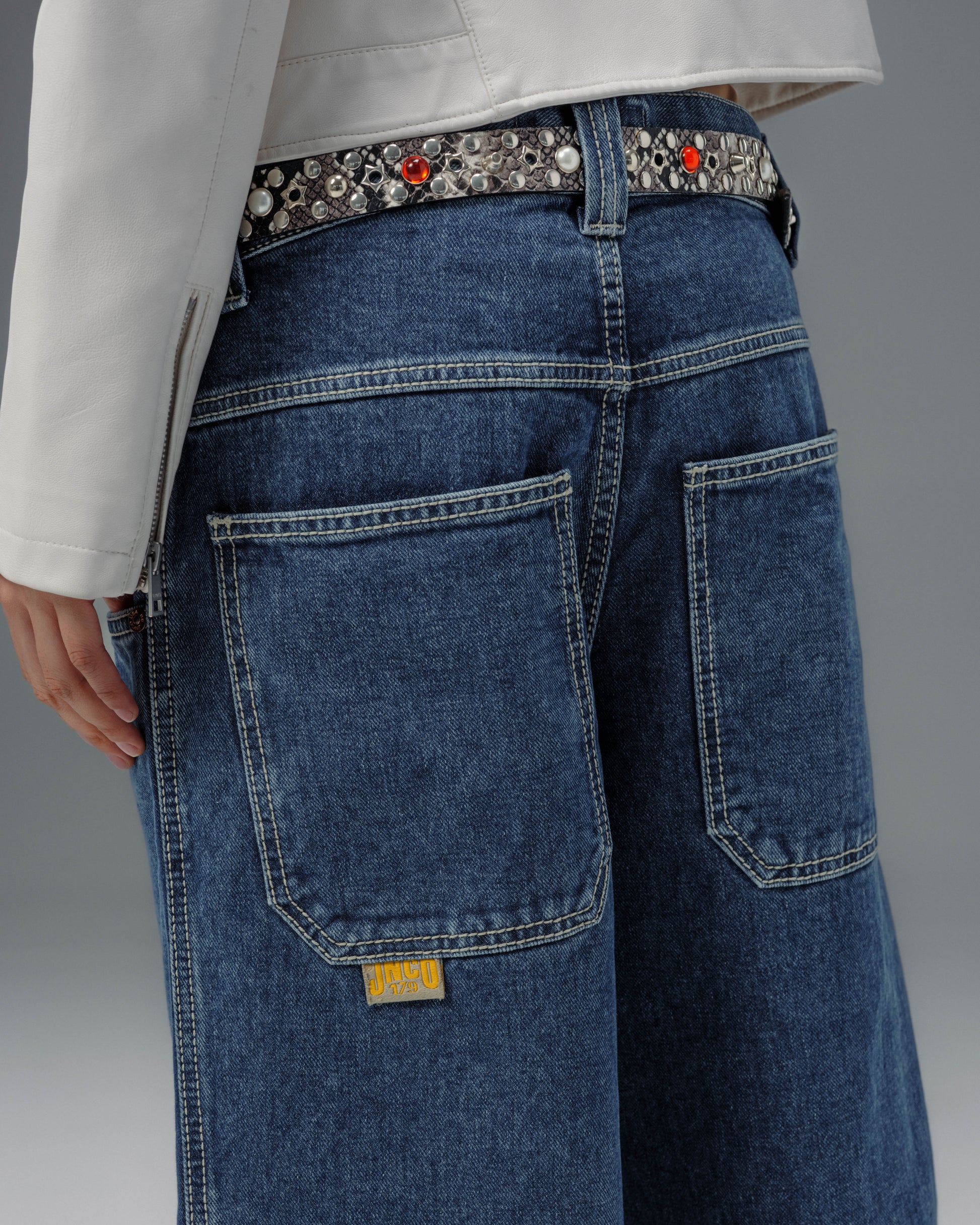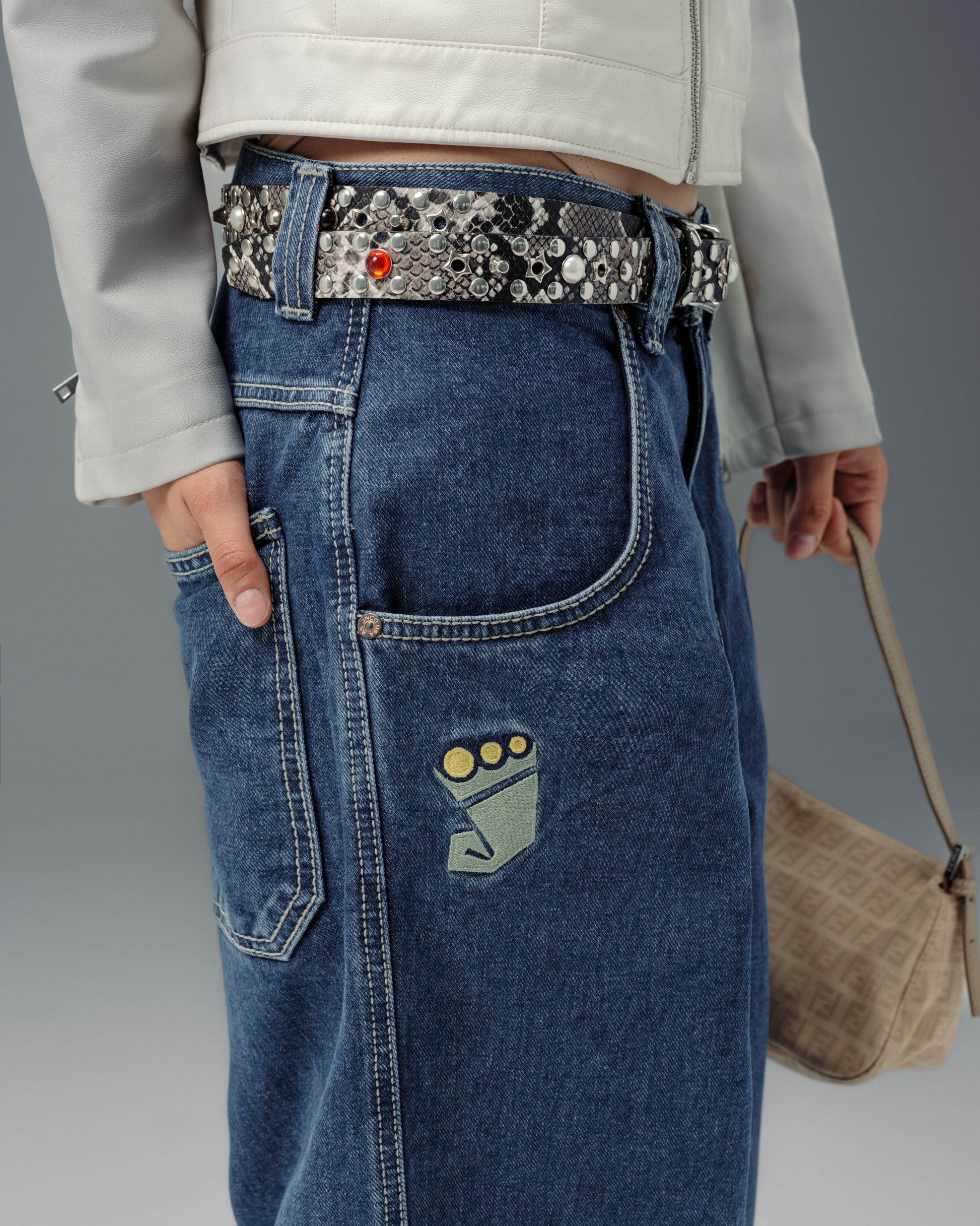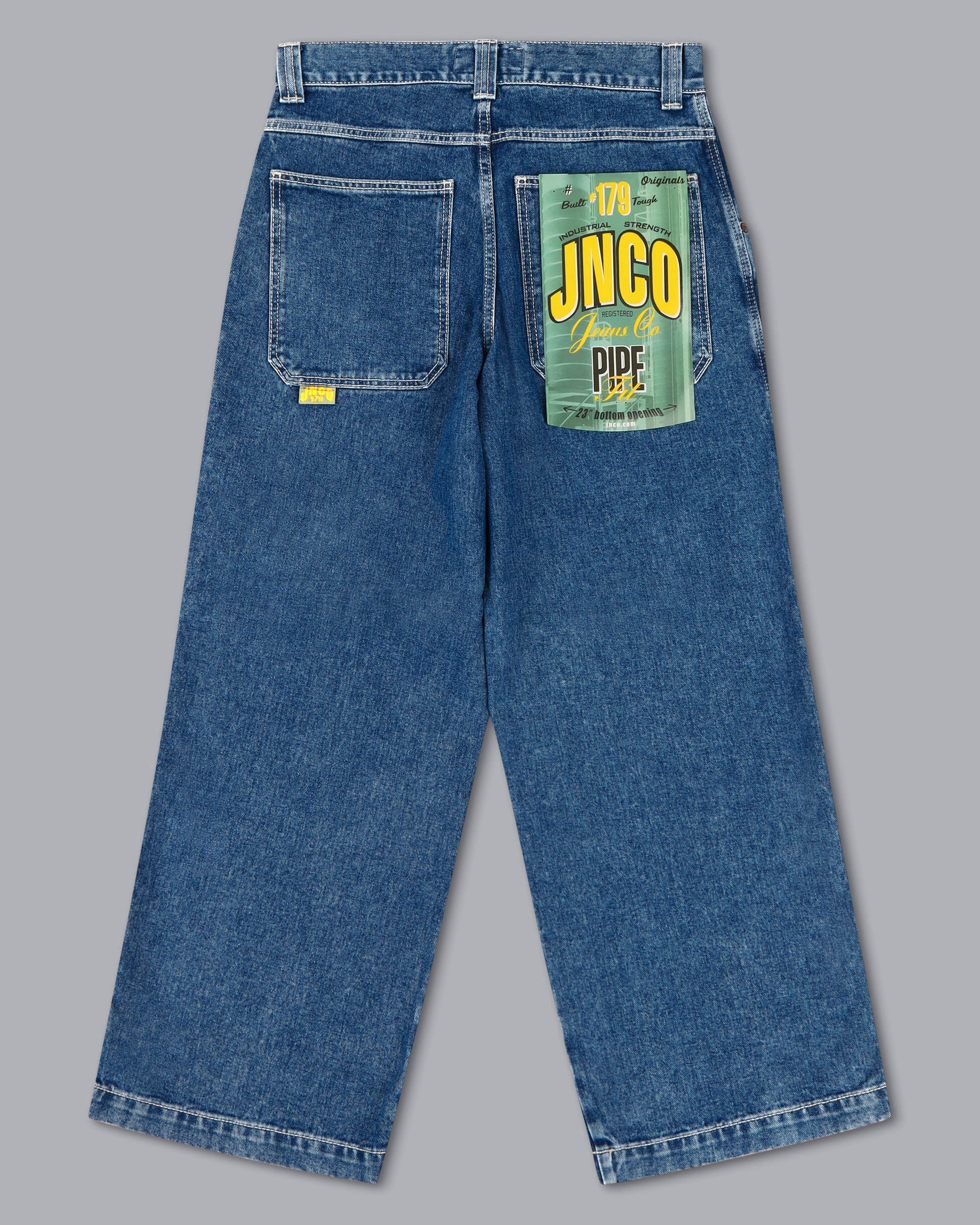 JNCO classic in Original Antique Wash. 23" bottom opening with original artwork, labels, and front right pocket embroidery. 14oz 100% cotton denim with contrast stitching. Collectible flasher included.